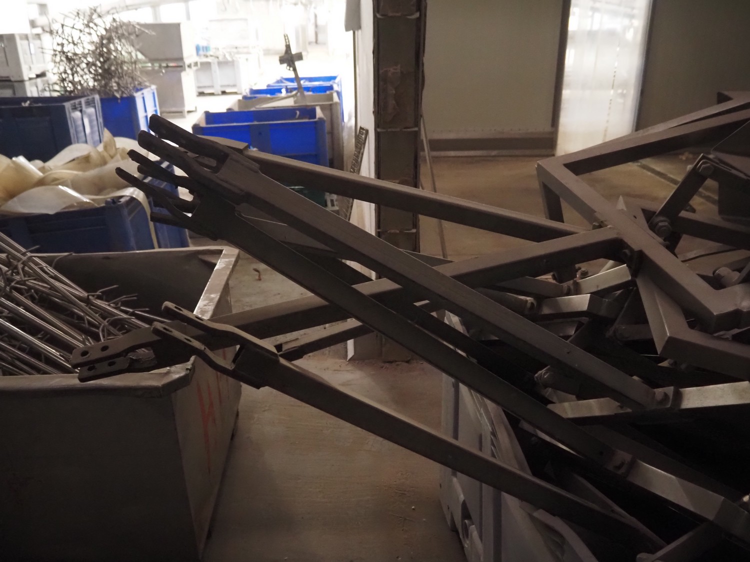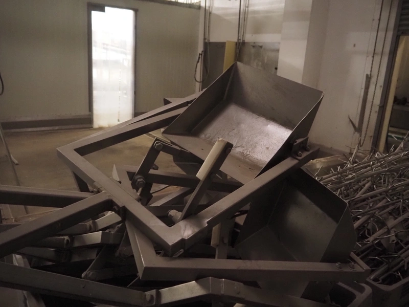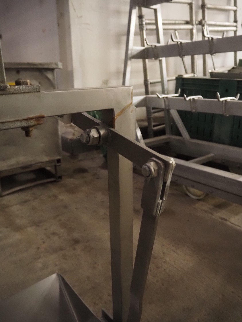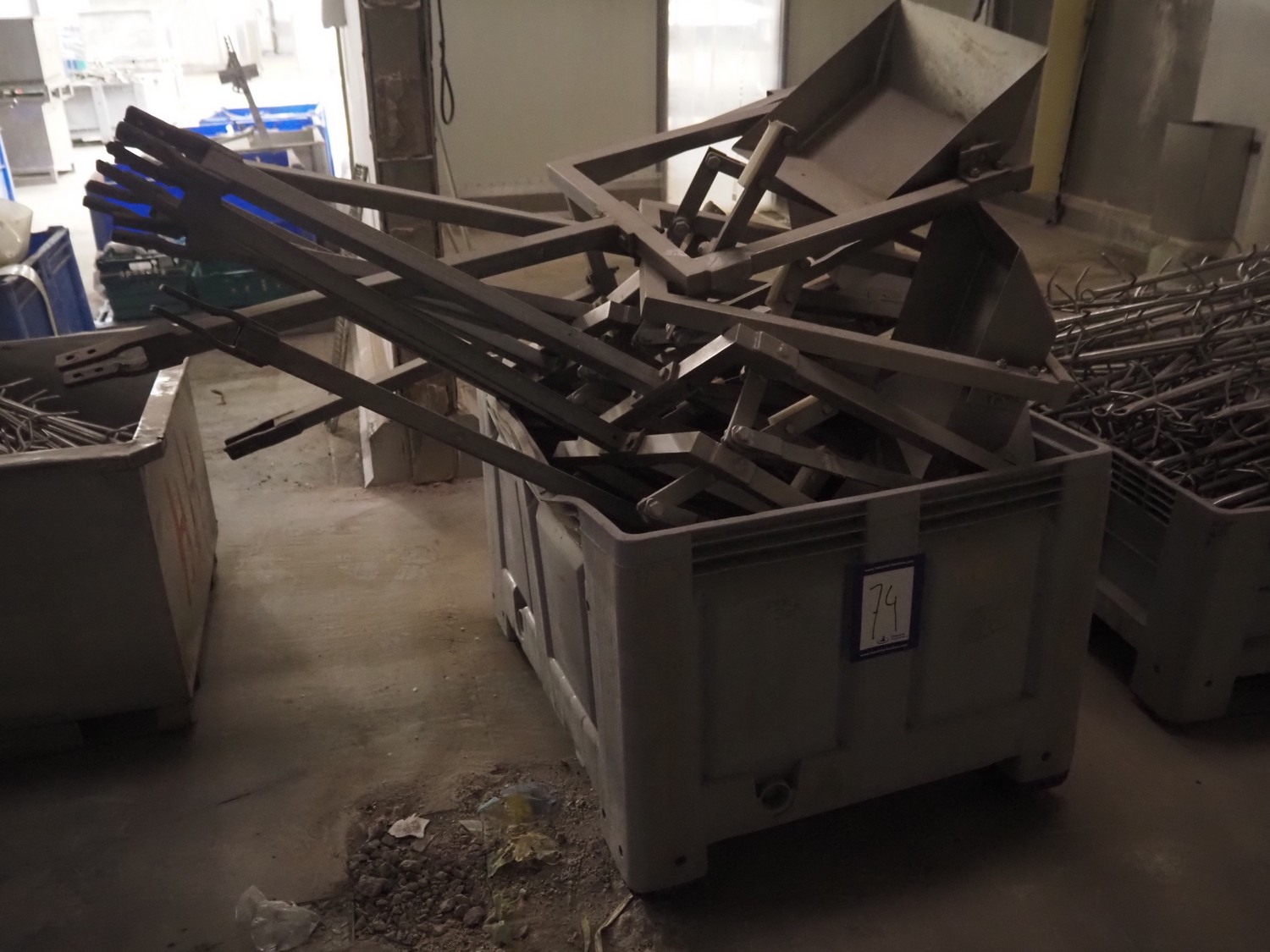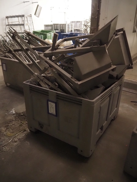 Block pallet box with 10 s/s organ trays, inside dimensions: 440 mm x 500 mm x 130 mm, total dimensions: (8x) 600 mm x 500 mm x 1750 mm.