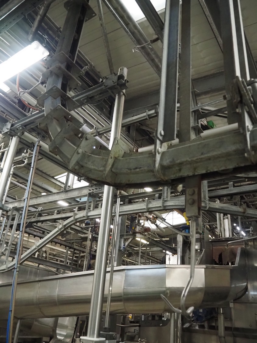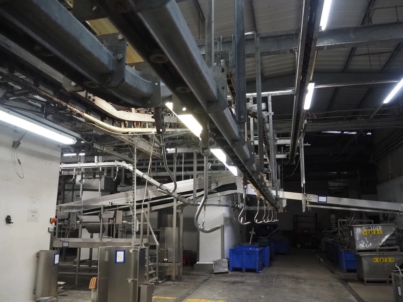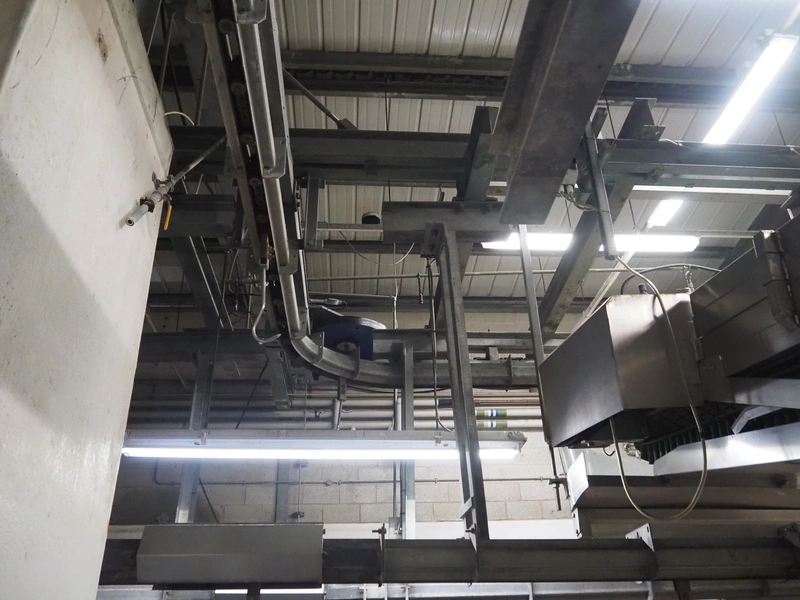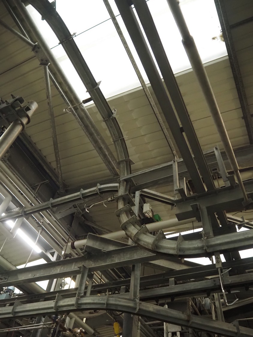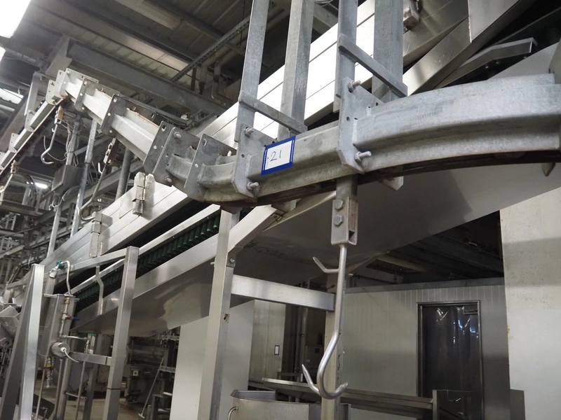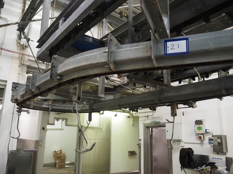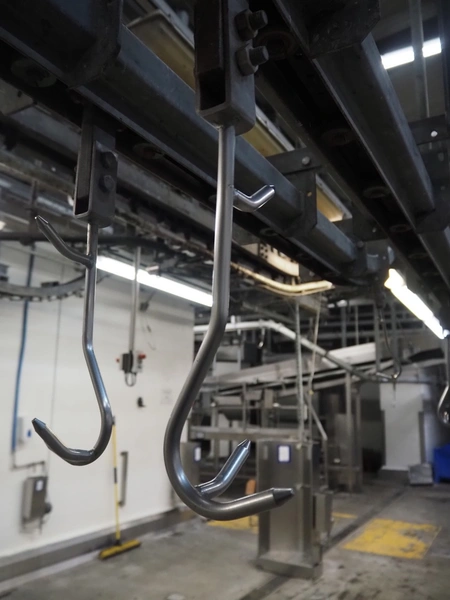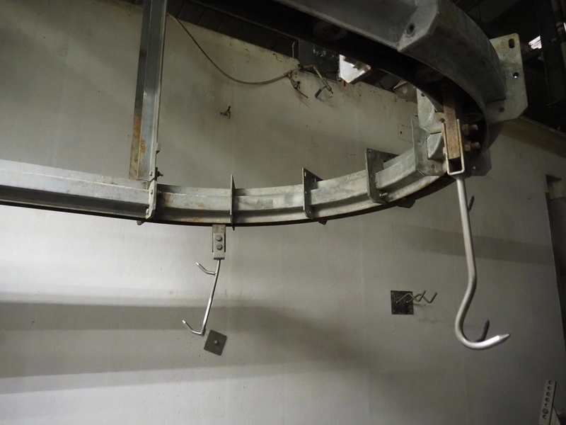 Banss Schlacht- und Fördertechnik GmbH chain conveyor with s/s hooks for red organs, hook length: 280 mm, conveyor length: 64 meters. Including hook cleaning station.