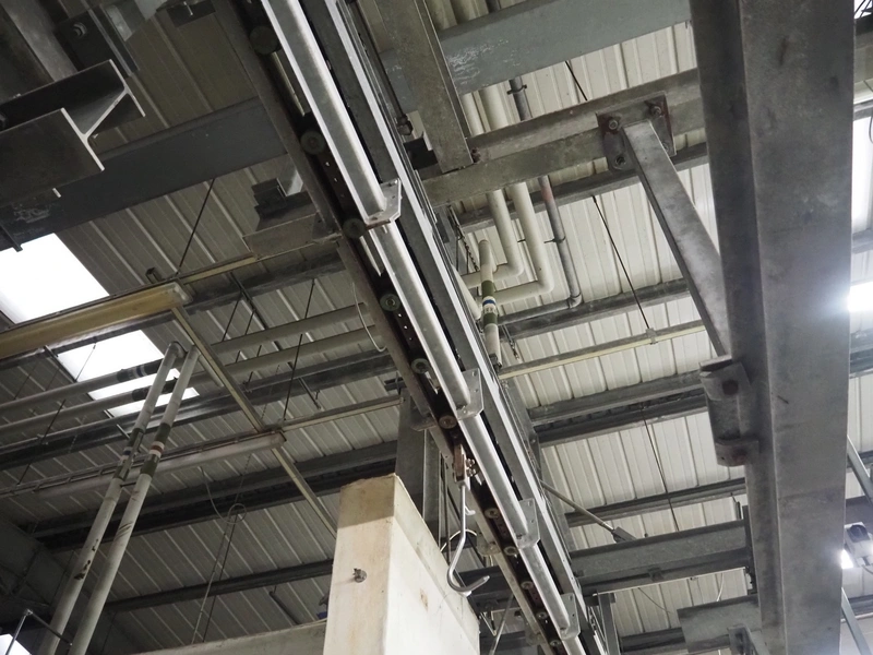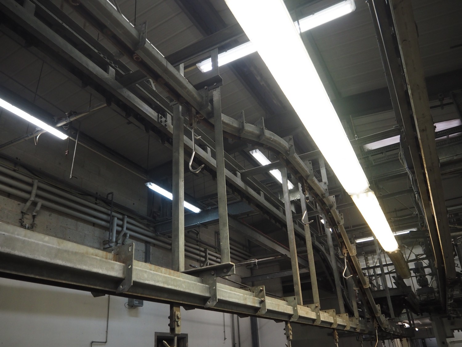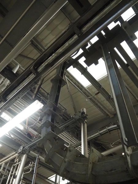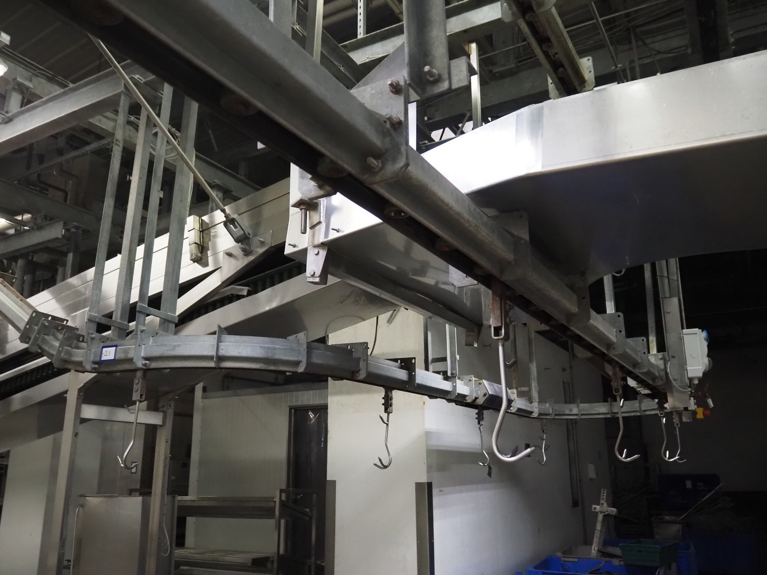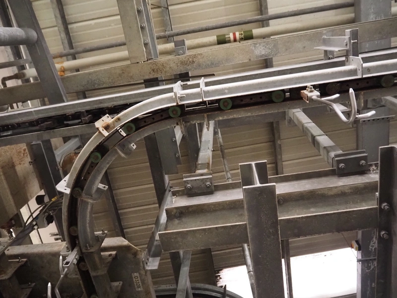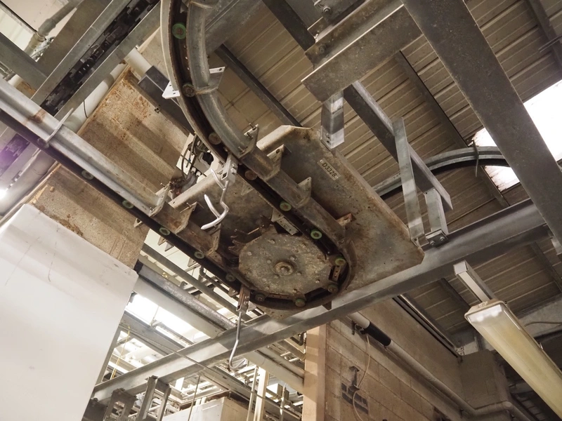 Banss Schlacht- und Fördertechnik GmbH chain conveyor with s/s hooks for red organs, hook length: 280 mm, conveyor length: 64 meters. Including hook cleaning station.