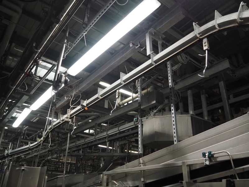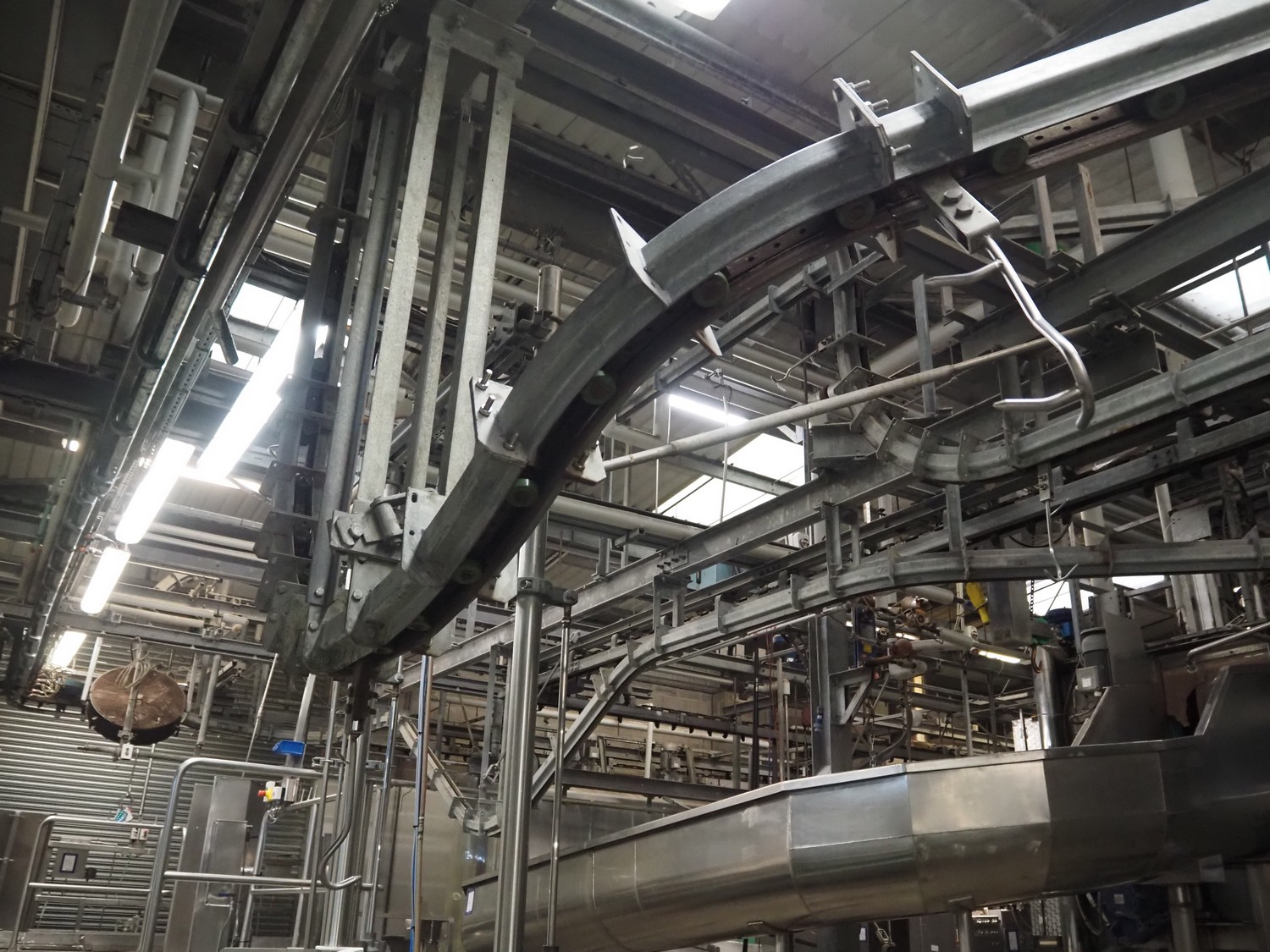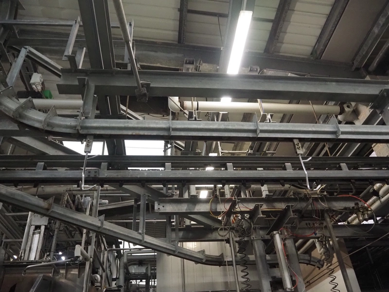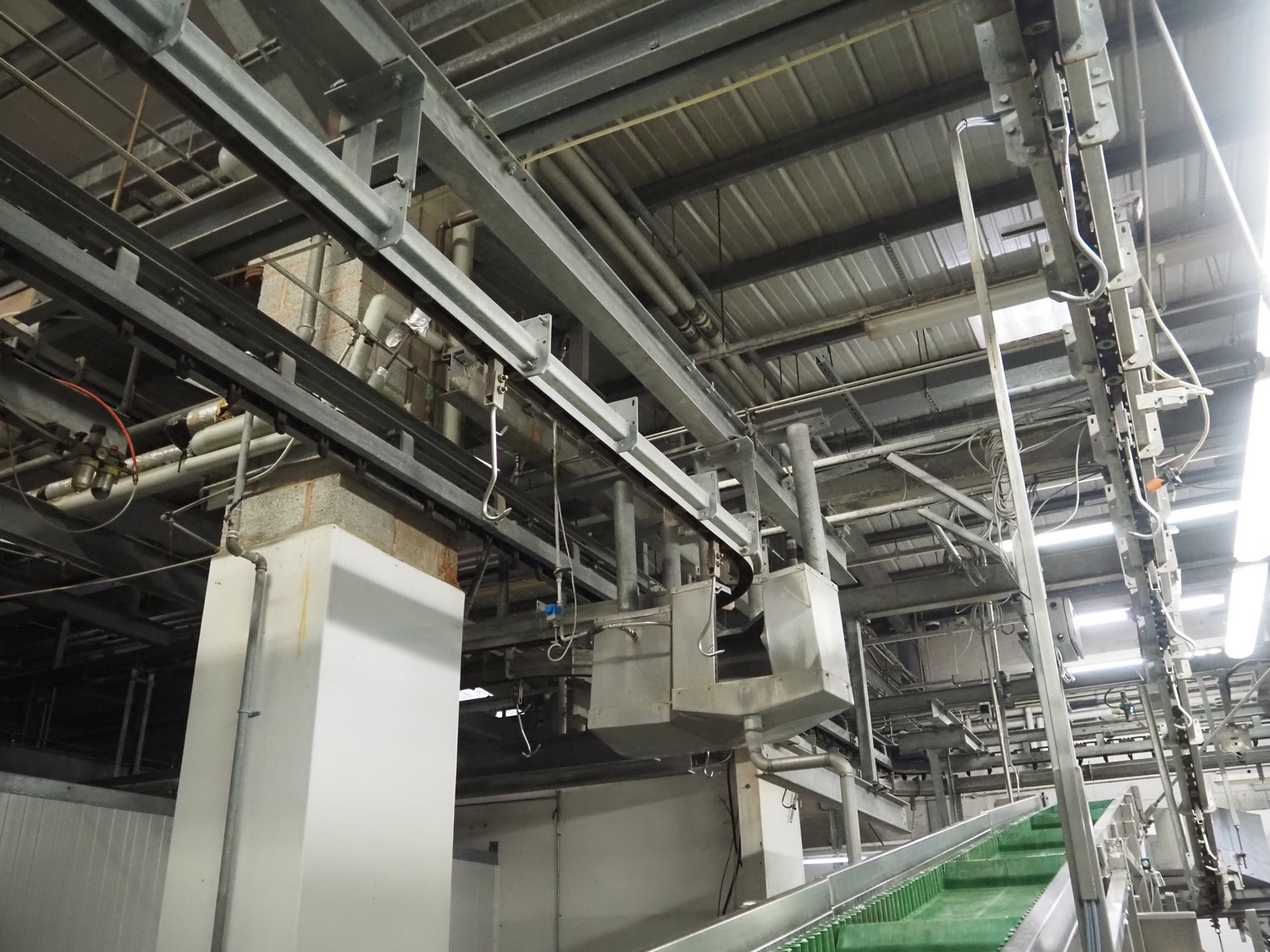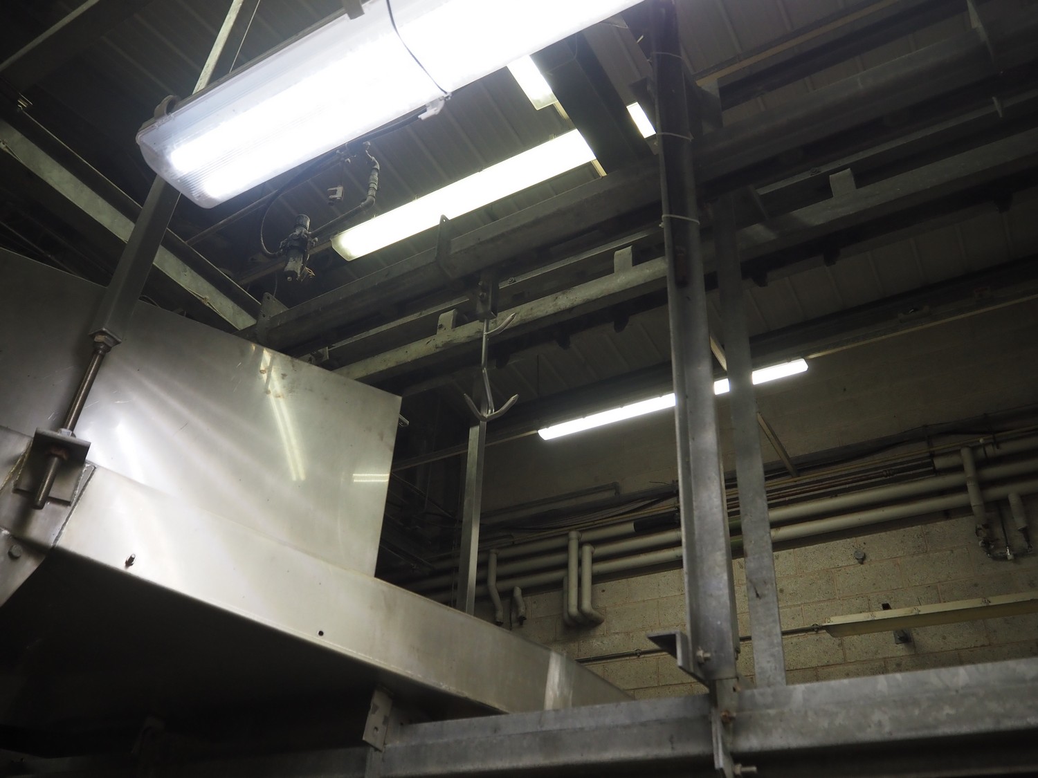 Banss Schlacht- und Fördertechnik GmbH chain conveyor with s/s hooks for red organs, hook length: 280 mm, conveyor length: 64 meters. Including hook cleaning station.