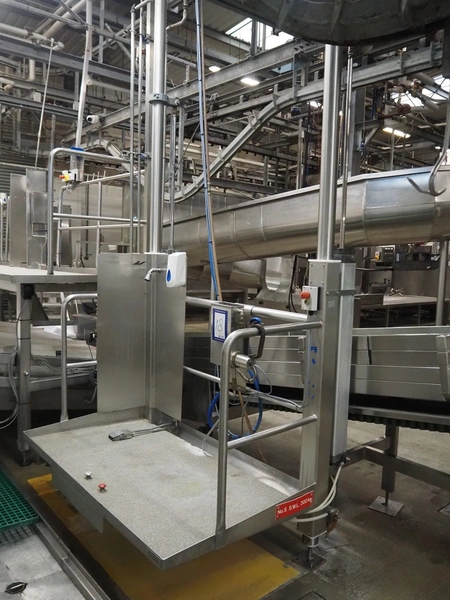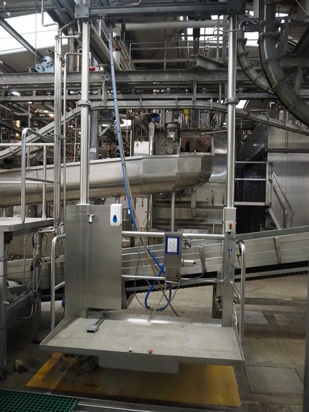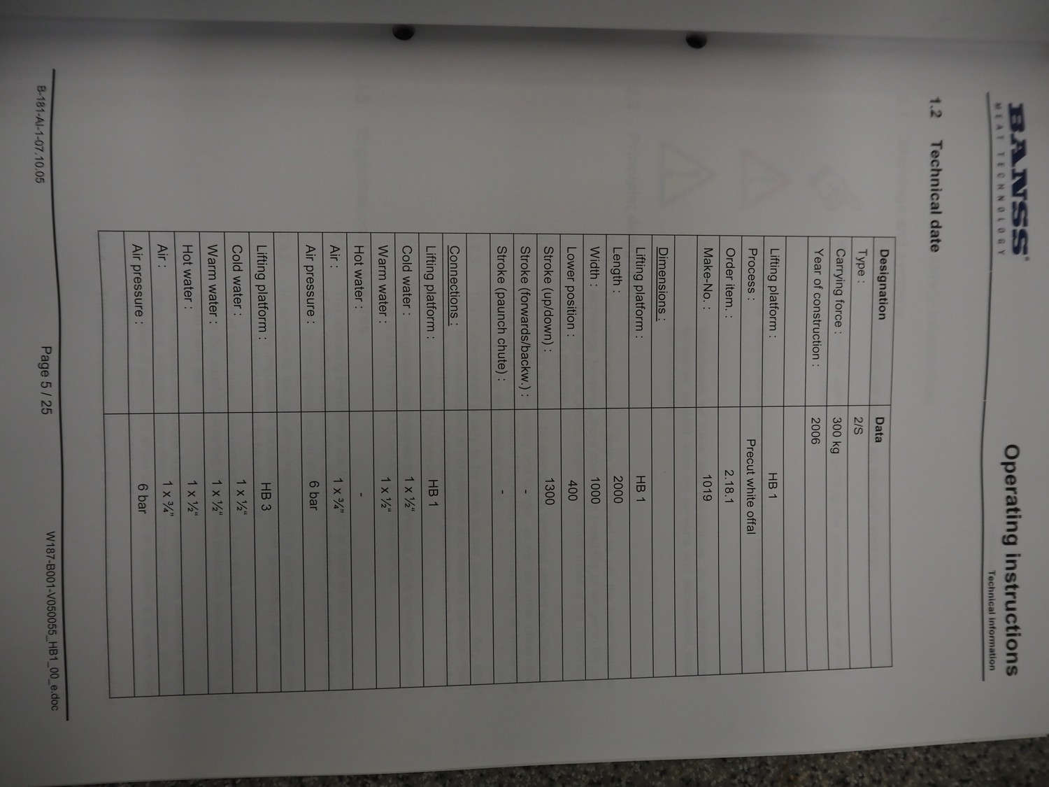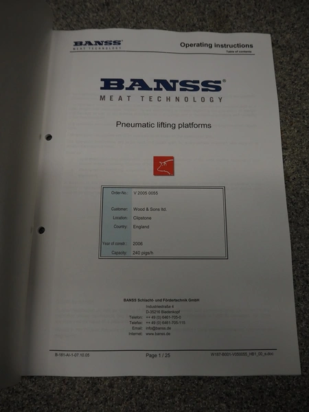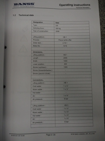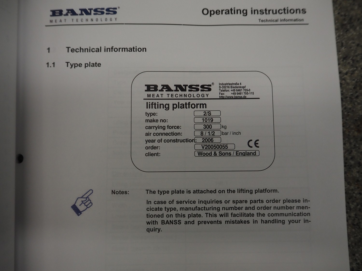 Banss Schlacht- und Fördertechnik GmbH in height adjustable working platform with apron washer and knife sterilizer, type: 2/S, serial number: 1019, year of construction: 2006, capacity: 300 kg, maximum height: 1500 mm, total dimensions: 1800 mm x 1250 mm x 4150 mm.
