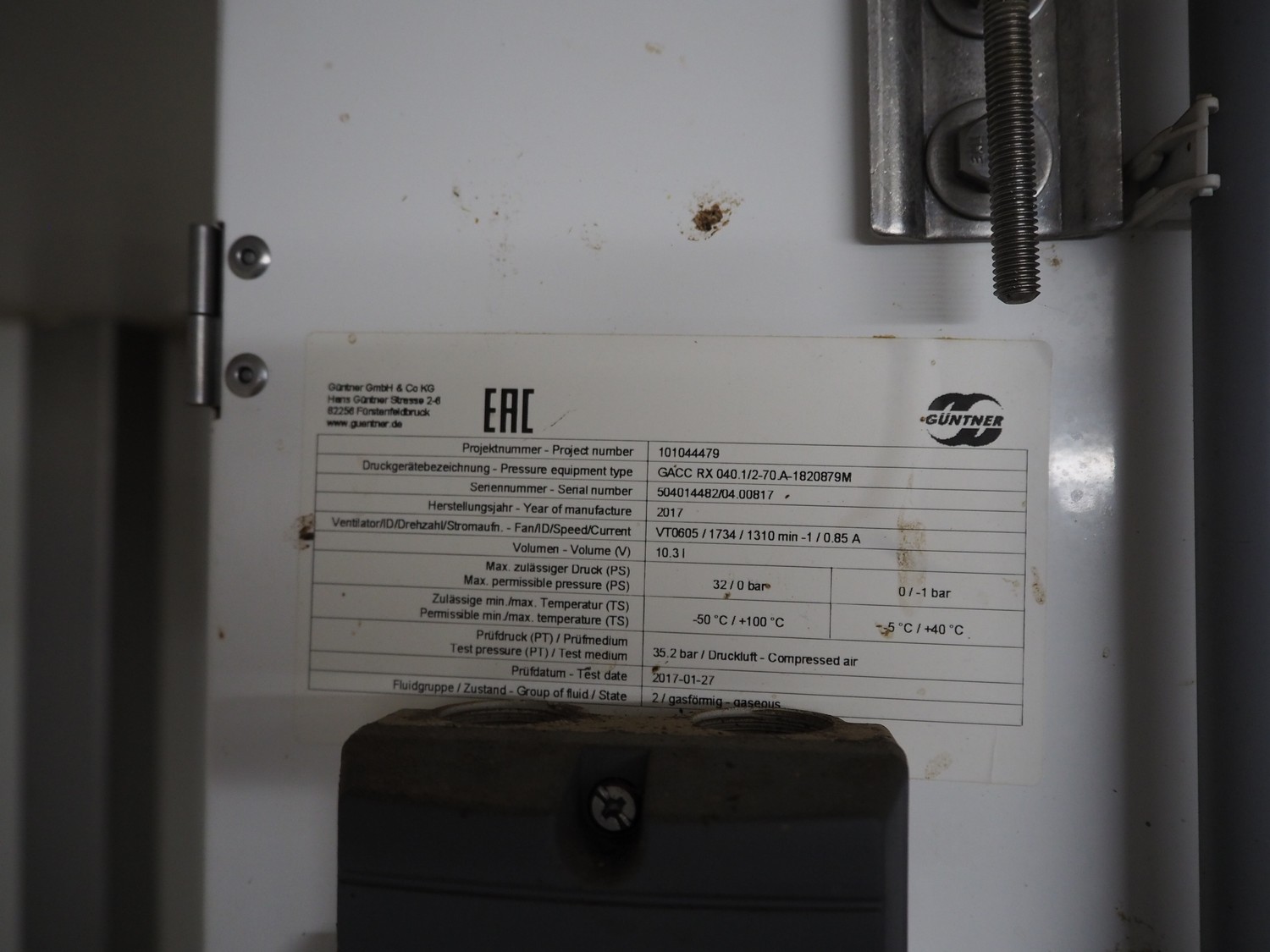 Güntner evaporator, type: GACC RX 040.1/2-70.A-1820879M, serial number: 504014482/04.00817, year of construction: 2017, volume: 10.3 liter, 2 fans, dimensions: 1700 mm x 400 mm x 500 mm.