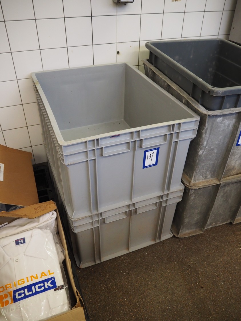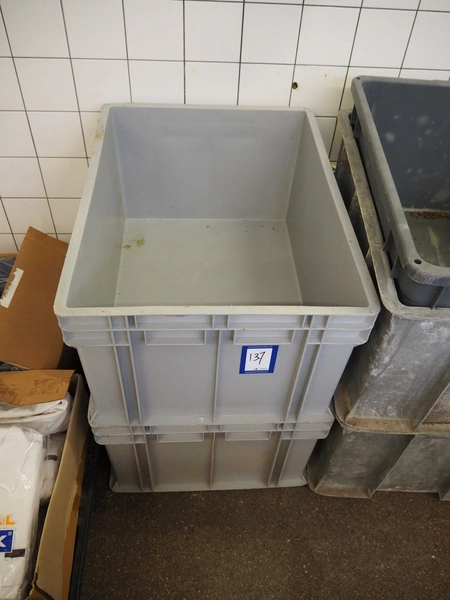 2 plastic crates, dimensions: (2x) 800 mm x 600 mm x 400 mm.