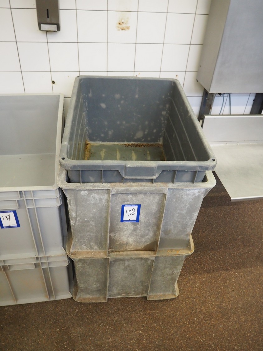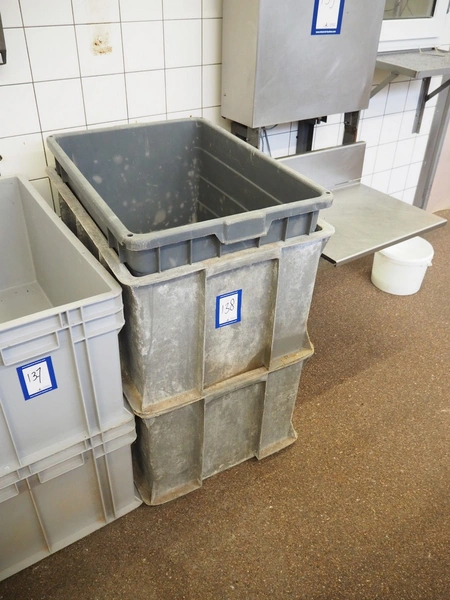 3 plastic crates, dimensions: (2x) 750 mm x 600 mm x 400 mm, (1x) 750 mm x 550 mm x 400 mm.