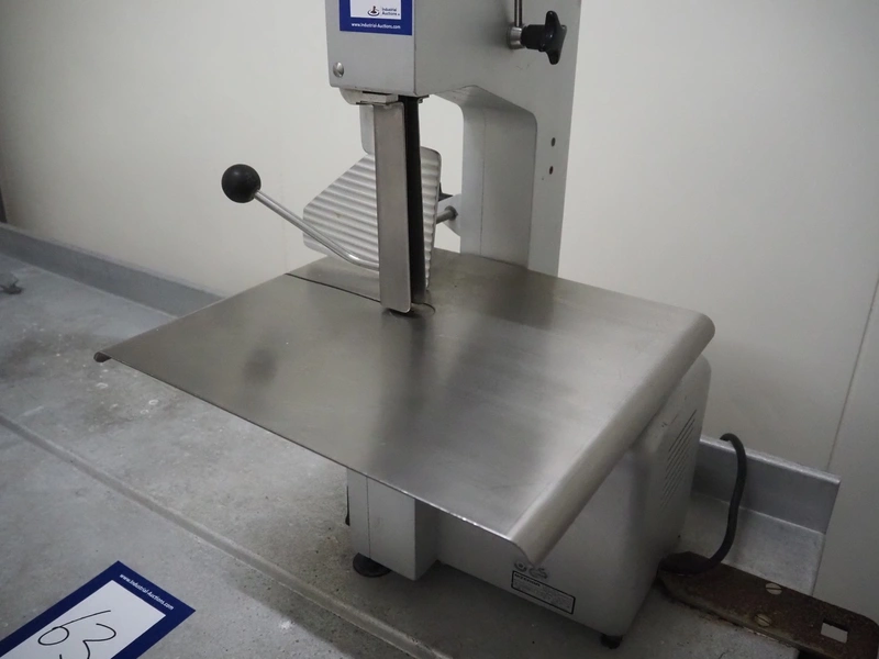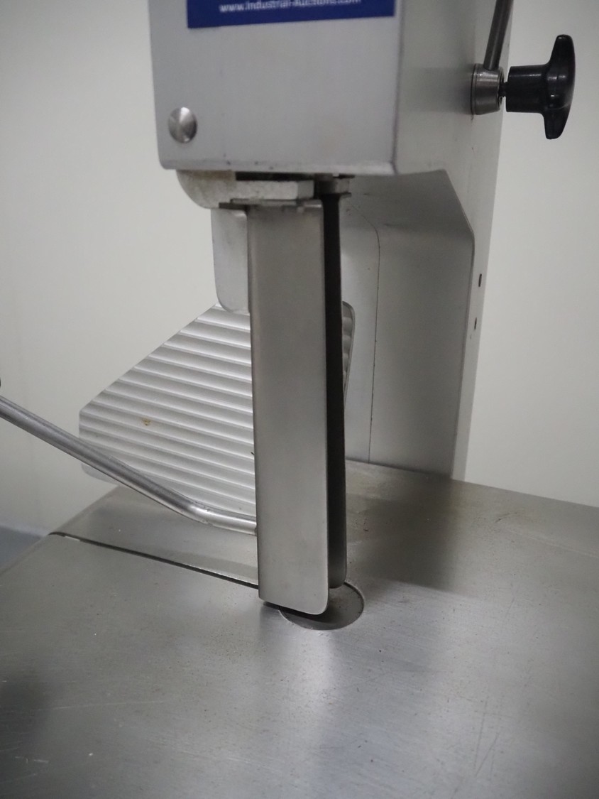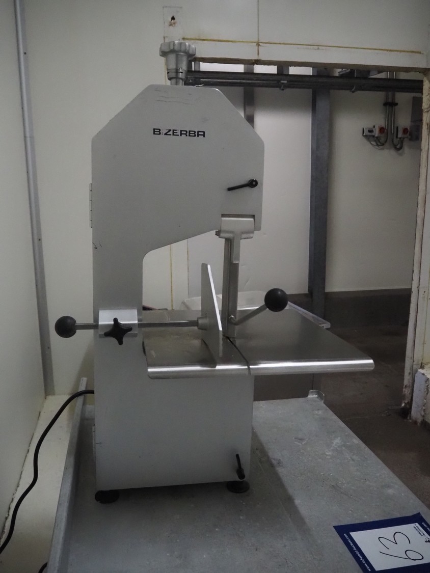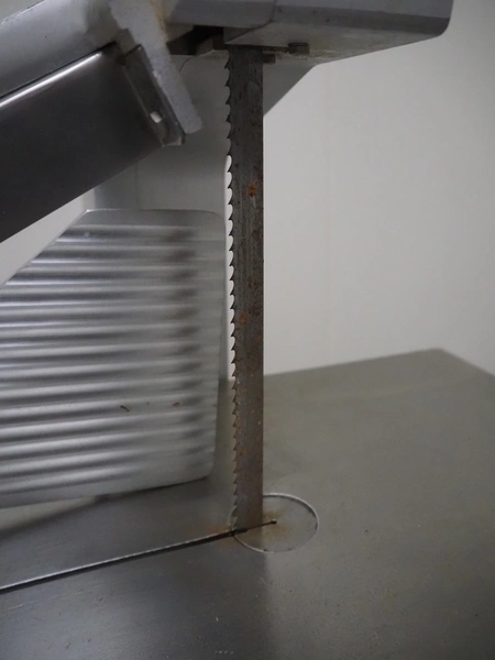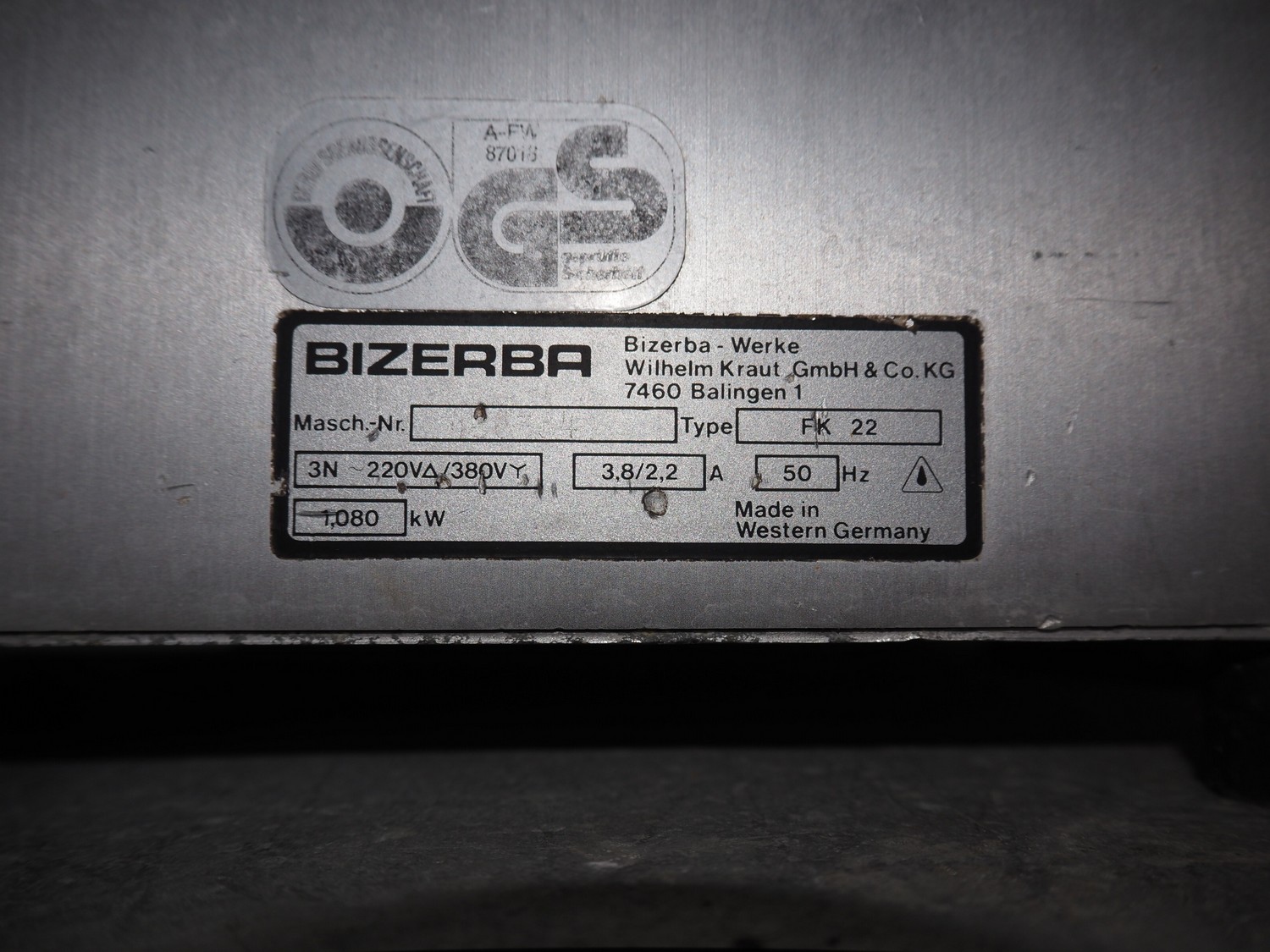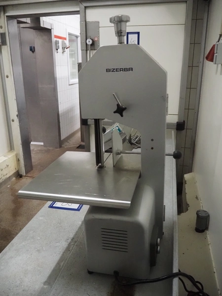 Bizerba table model bandsaw, type: FK 22, 220/380 V, 50 Hz, 3.8/2.2 A, 1.080 kW, dimensions: 450 mm x 500 mm x 900 mm.