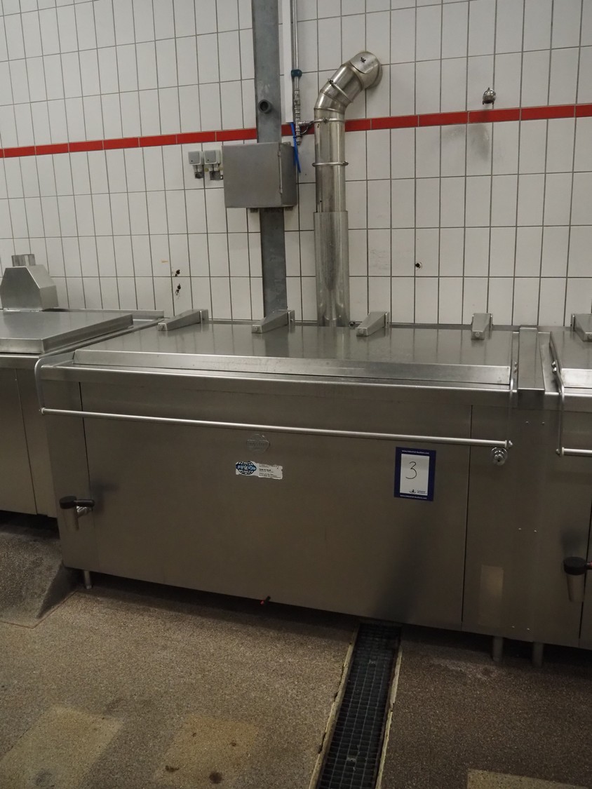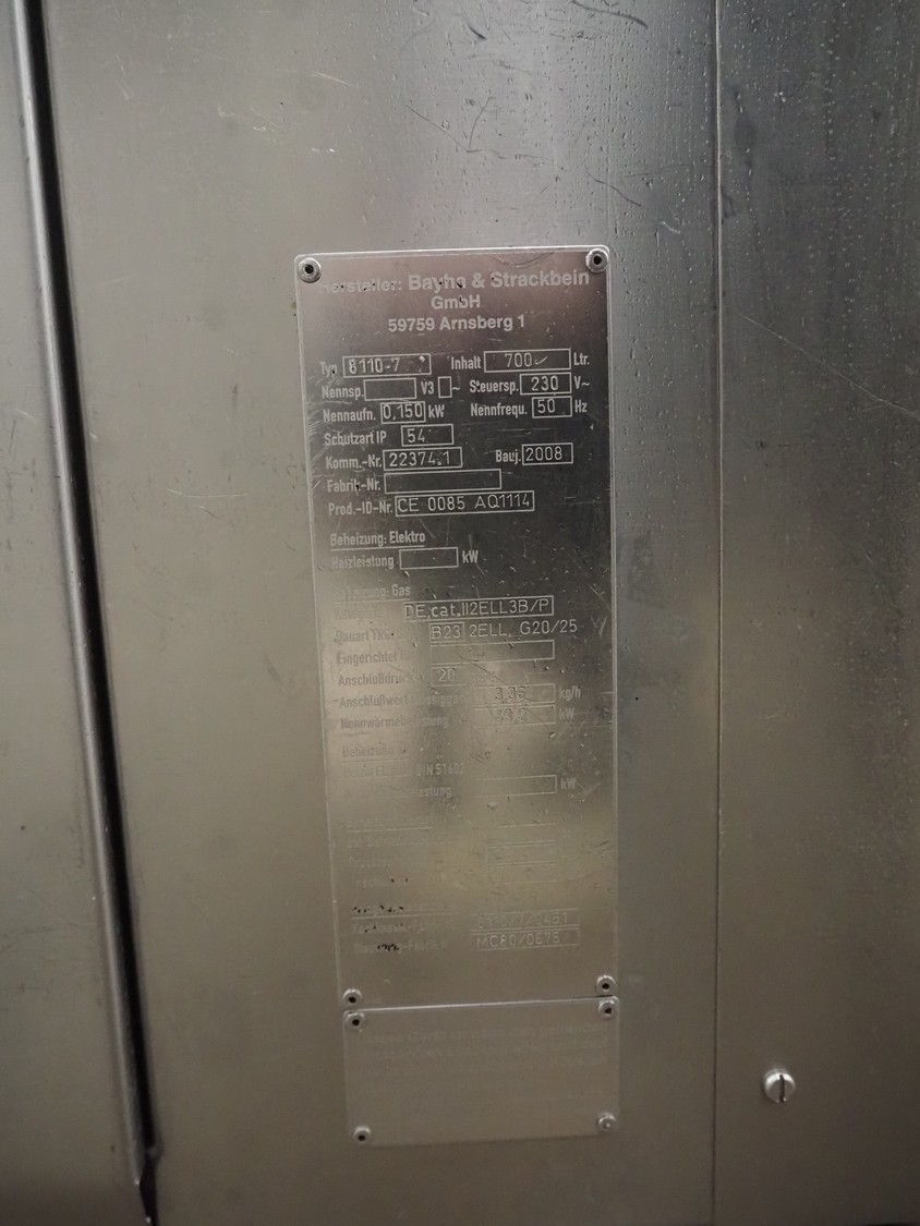Bayha & Strackbein GmbH cooking vessel, type: 8110-7, year of construction: 2008, 230 V, 50 Hz, 0.15 kW, capacity: 700 liter, inside dimensions: 1800 mm x 800 mm x 500 mm, total dimensions: 2000 mm x 1400 mm x 2000 mm.