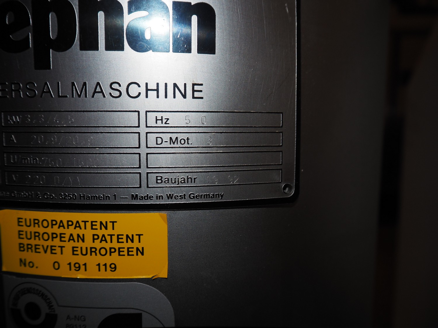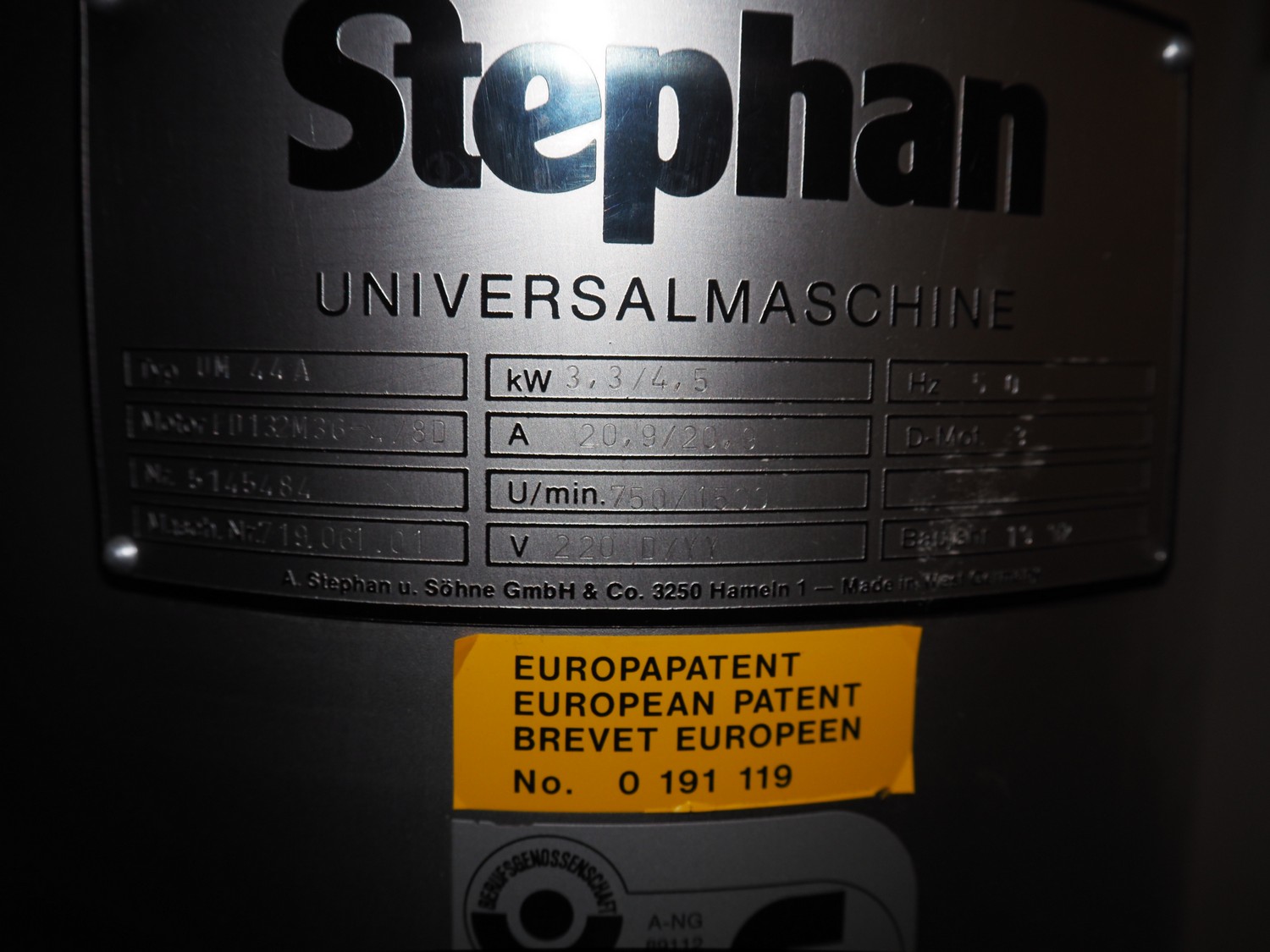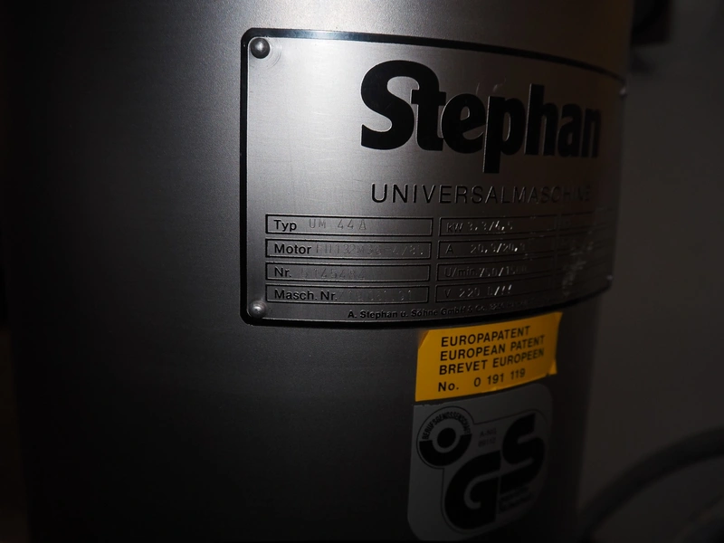 Stephan universal machine, type: UM 44 A, machine number: 719.061.01, year of construction: 10-12, 220 V, 50 Hz, 20.9 A, 3.3/4.5 kW, dimensions: 800 mm x 550 mm x 1200 mm.