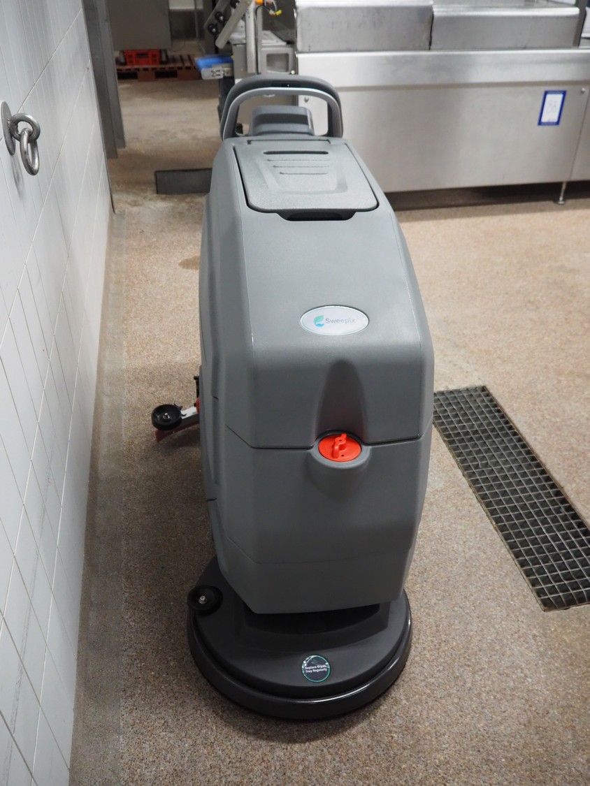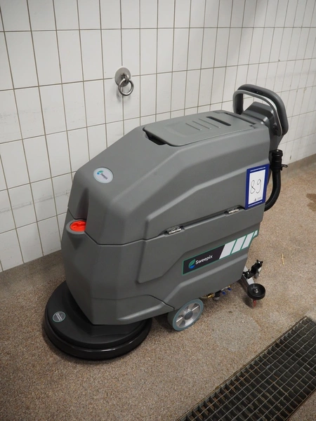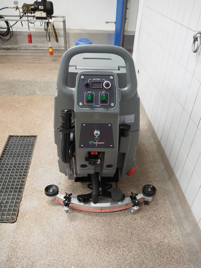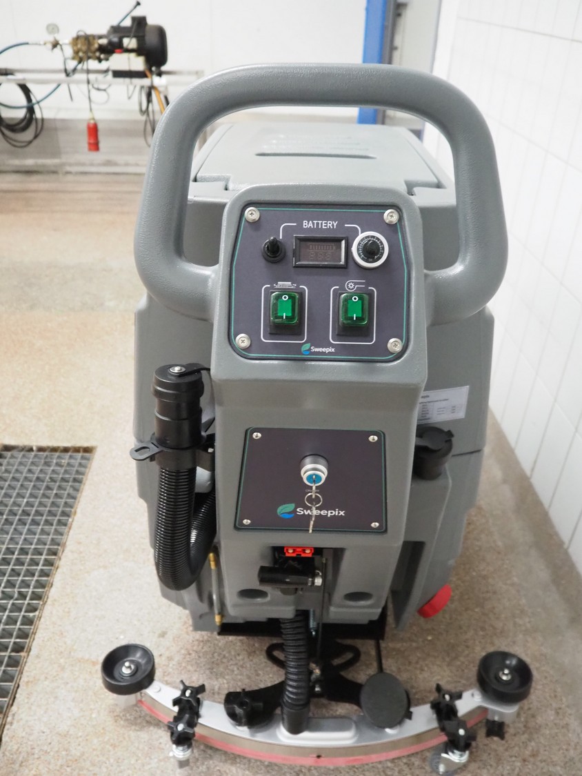 Sweepix floor scrubbing machine, serial number: 57277CX20250826004, cleaning width: 560 mm, squeegee width: 825 mm, working efficiency: 3600 m², battery capacity: 24V/103Ah, water tank capacity: 55/65 liter, 550/300 W, total dimensions: 1350 mm x 700 mm x 1200 mm. New, never used.