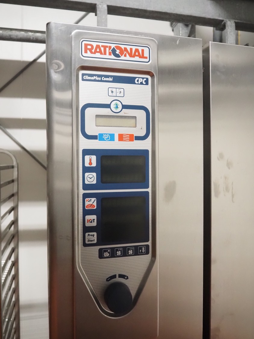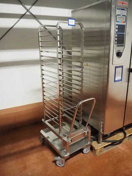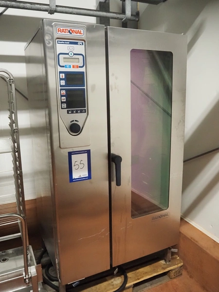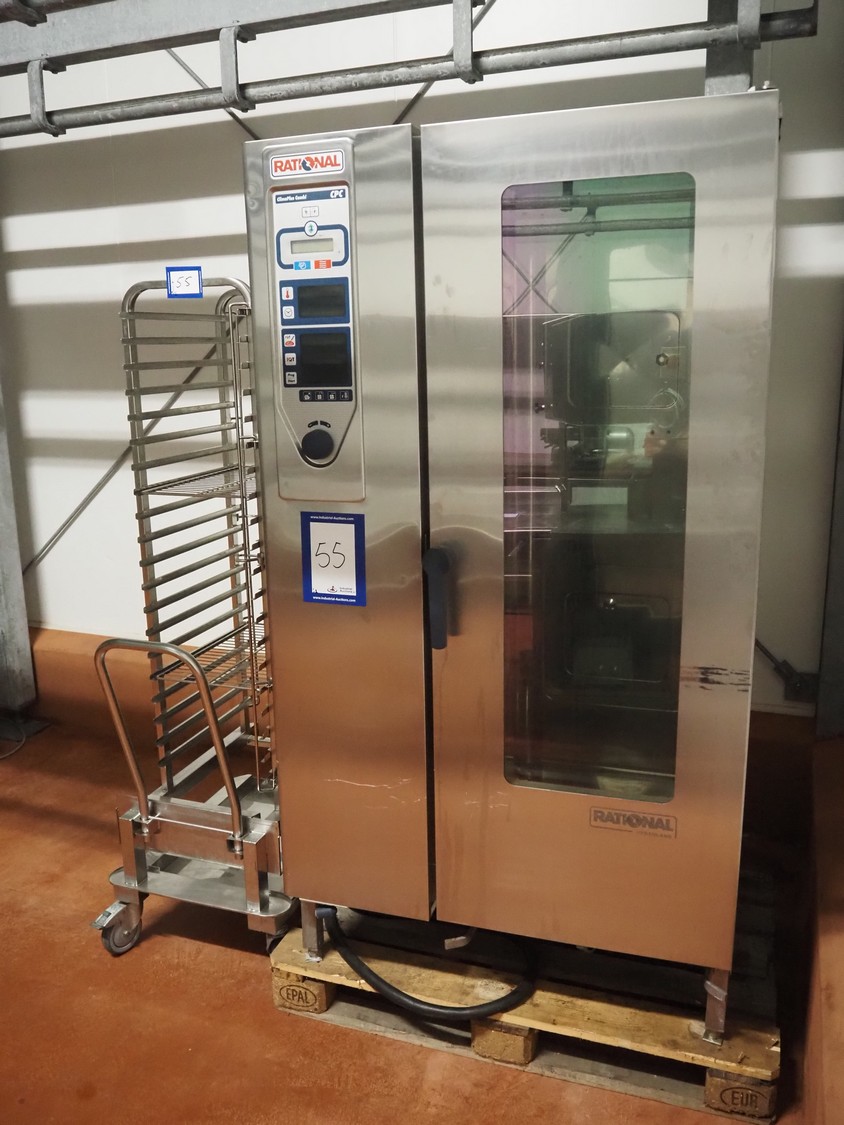 Rational combi steamer, model: ClimaPLus Combi CPC 201, serial number: E21CD02111079329, 400 V, 50 Hz, electric heated, s/s trolley, 20 floors, dimensions each floor: 530 mm x 330 mm, dimensions trolley: 850 mm x 540 mm x 1800, total dimensions: 1000 mm x 900 mm x 1900 mm.