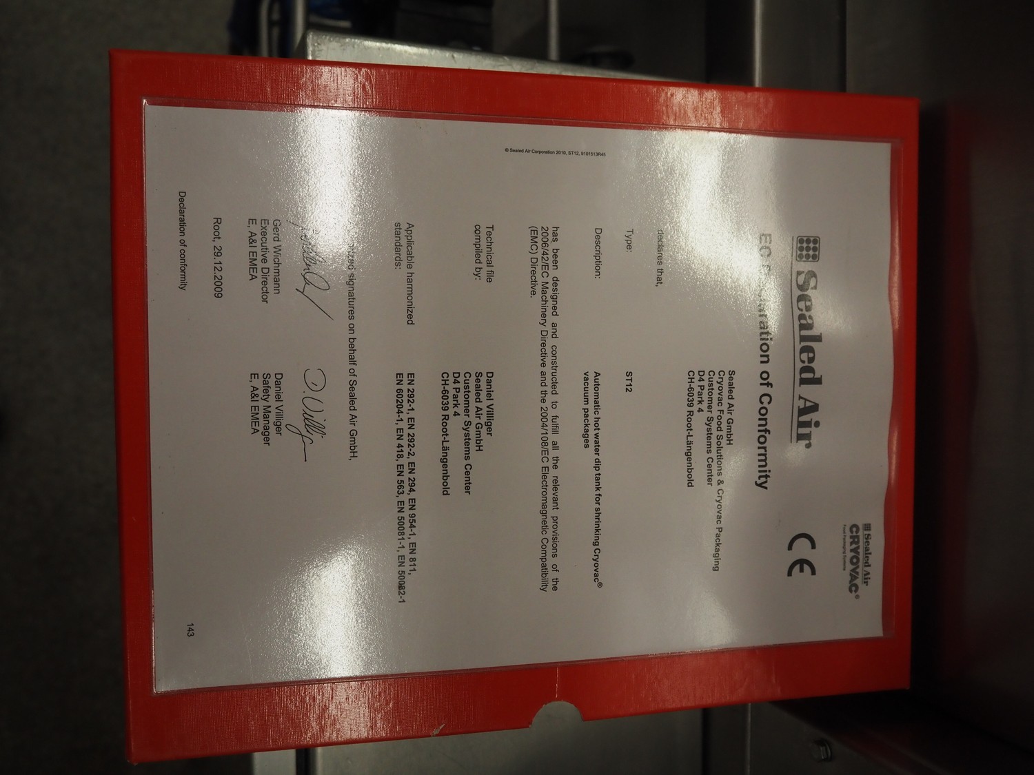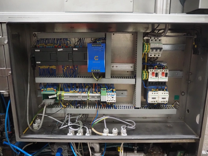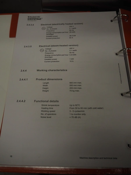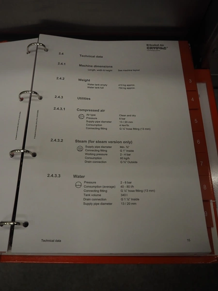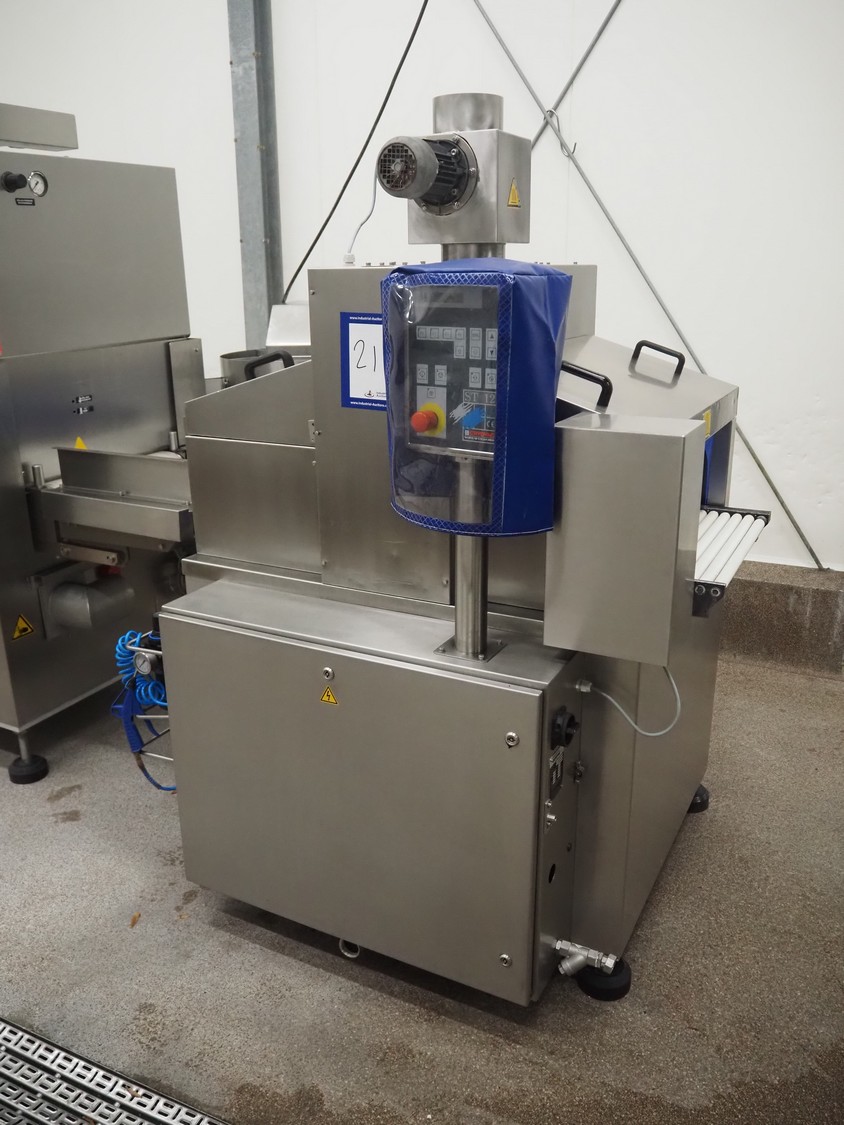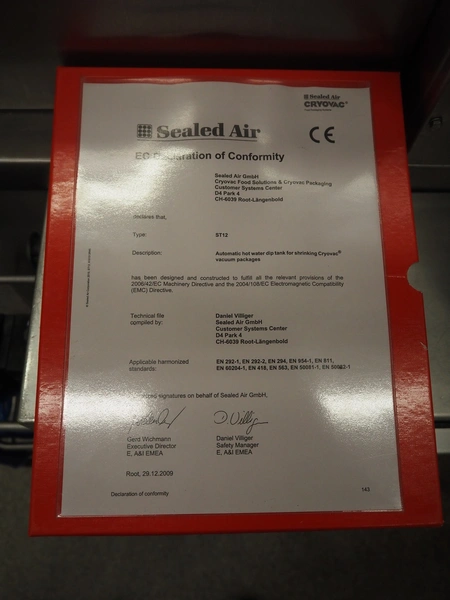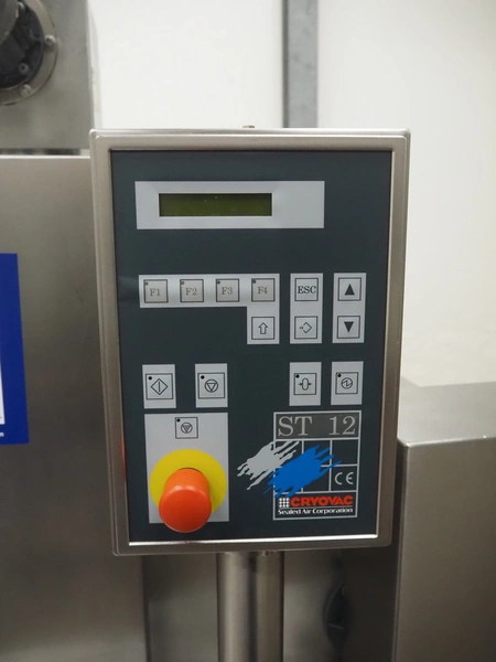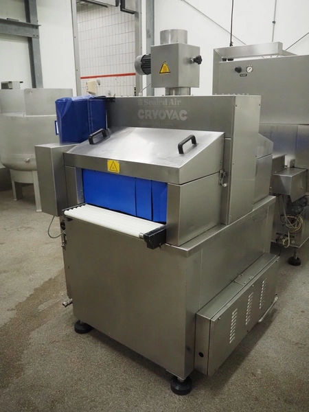 Cryovac dip tank, model: ST12 L/HS, serial number: SN01003, year of construction: 2011, 380/415 V, 3 Ph, 50 Hz, 16 A, clearance: 710 mm x 240 mm, s/s belt, belt width: 610 mm, plastic rollers, roller width: 590 mm, total dimensions: 1500 mm x 1400 mm x 2000 mm.