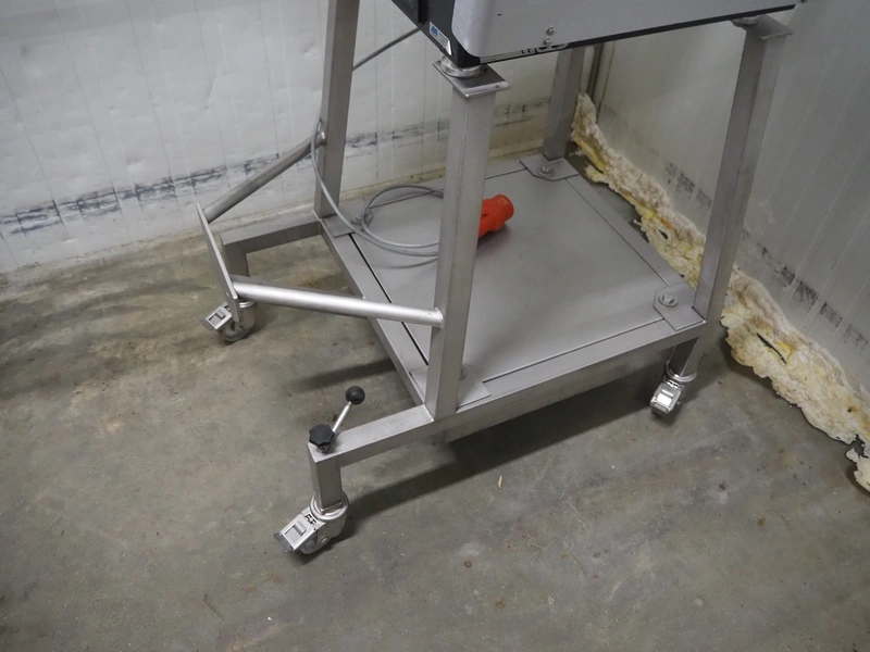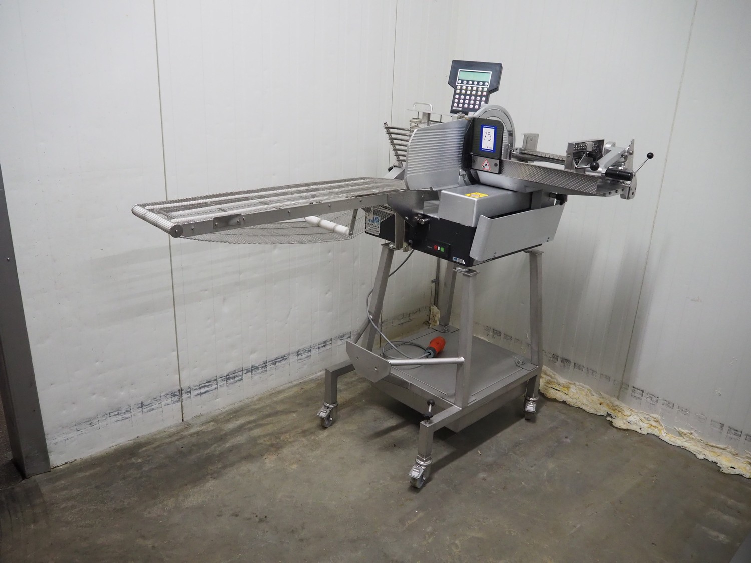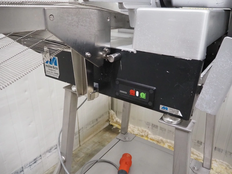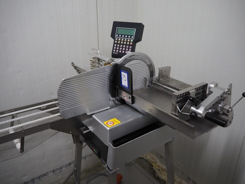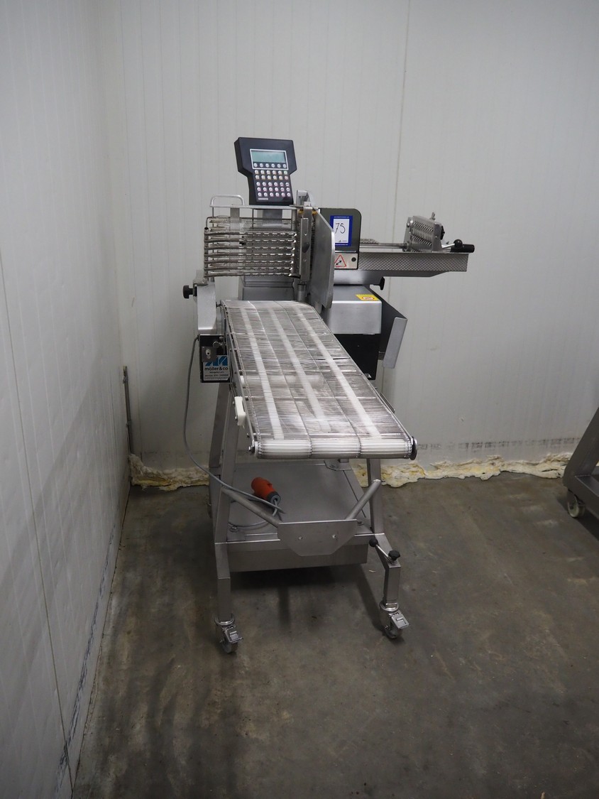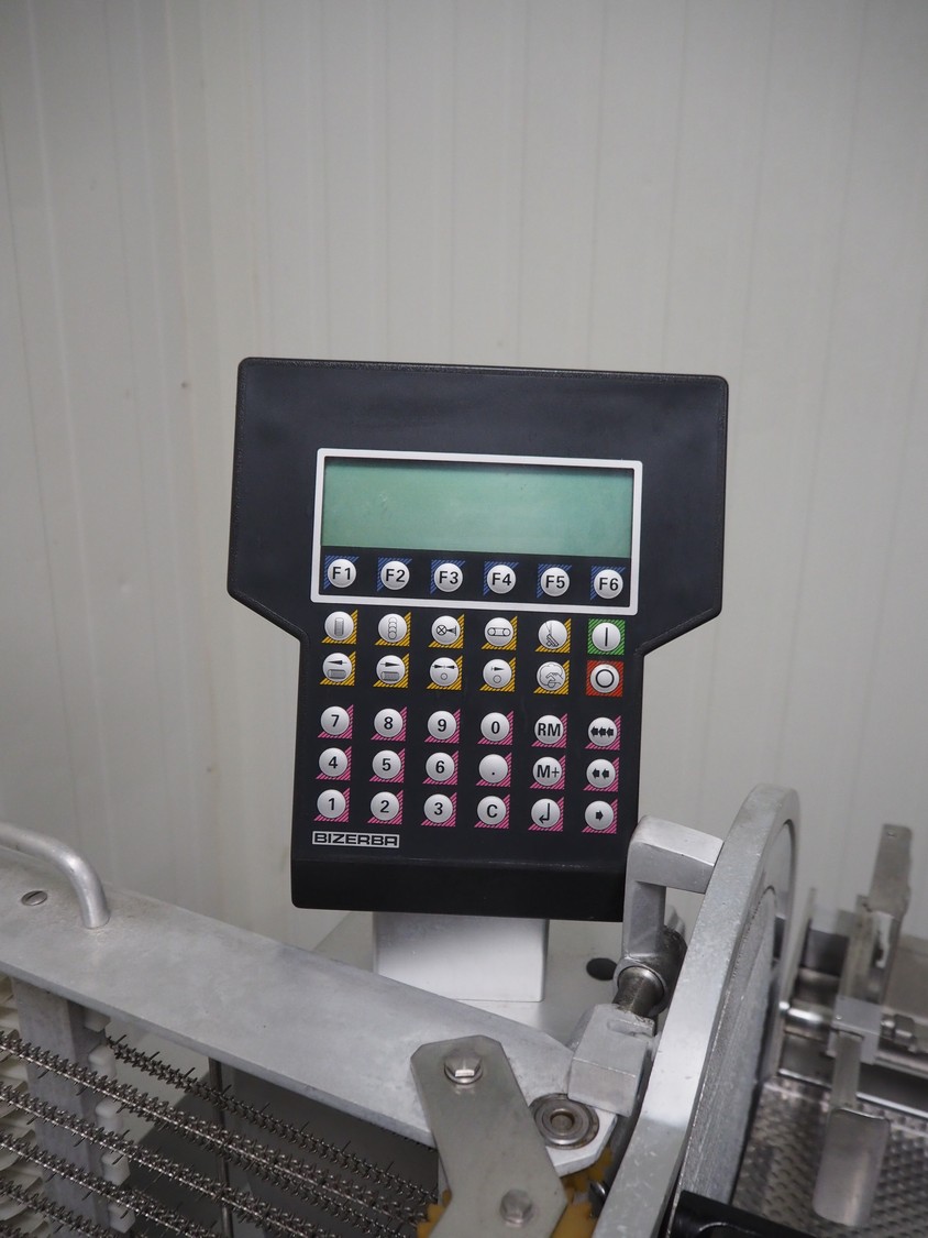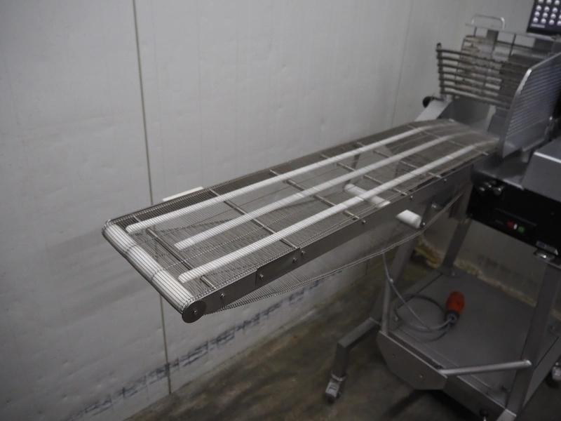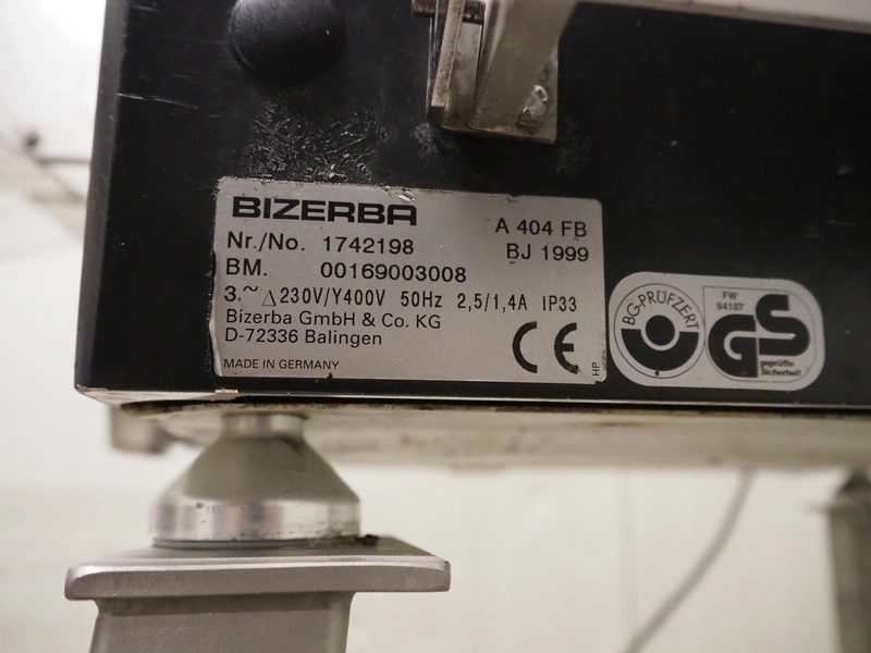 Bizerba mobile automatic slicer, model: A 404 FB, number: 1742198, year of construction: 1999, 230/400 V, 3 Ph, 50 Hz, 2.5/1.4 A, s/s mesh outfeed belt, belt width: 250 mm, total dimensions: 1700 mm x 1000 mm x 1600 mm.