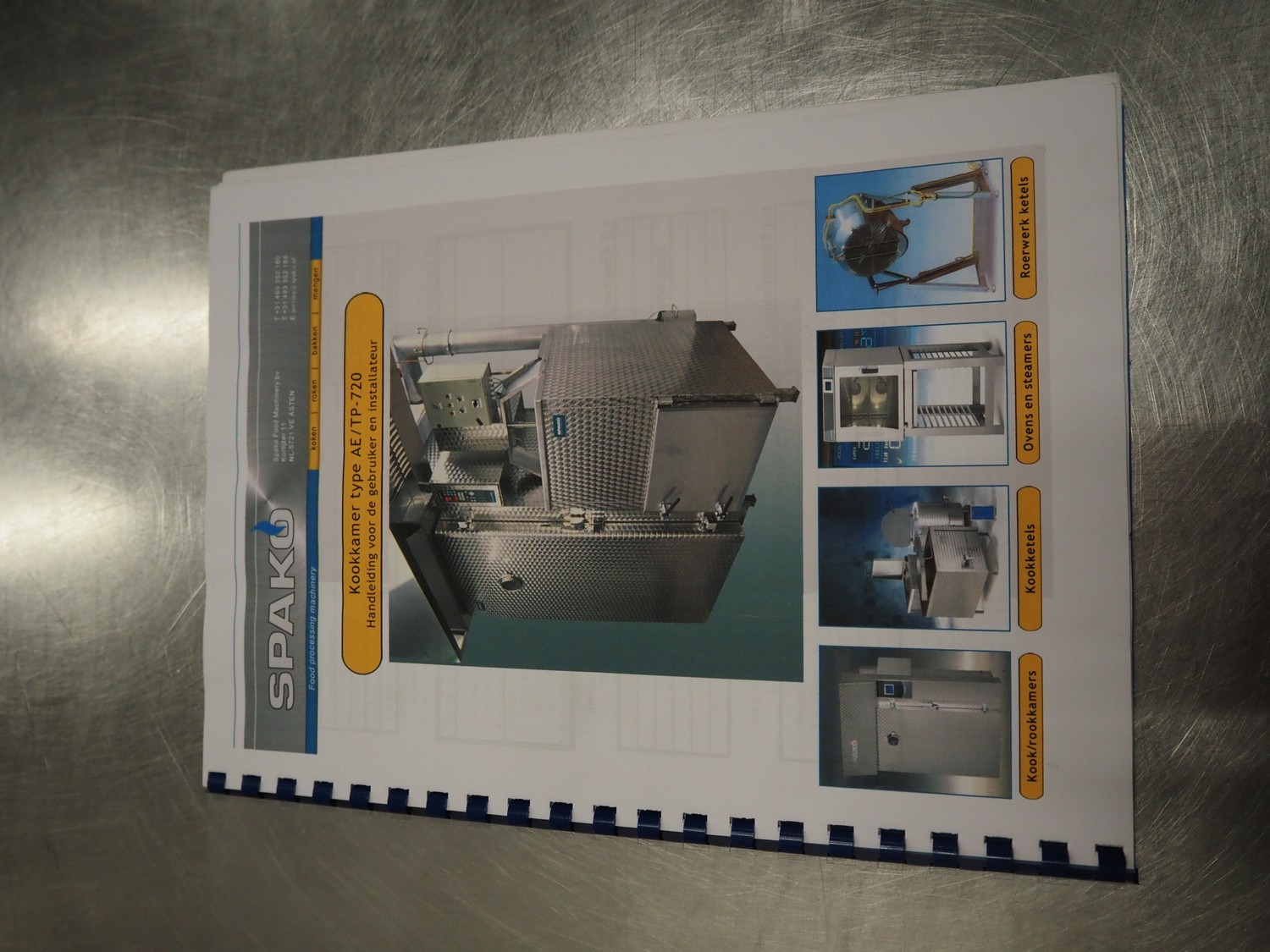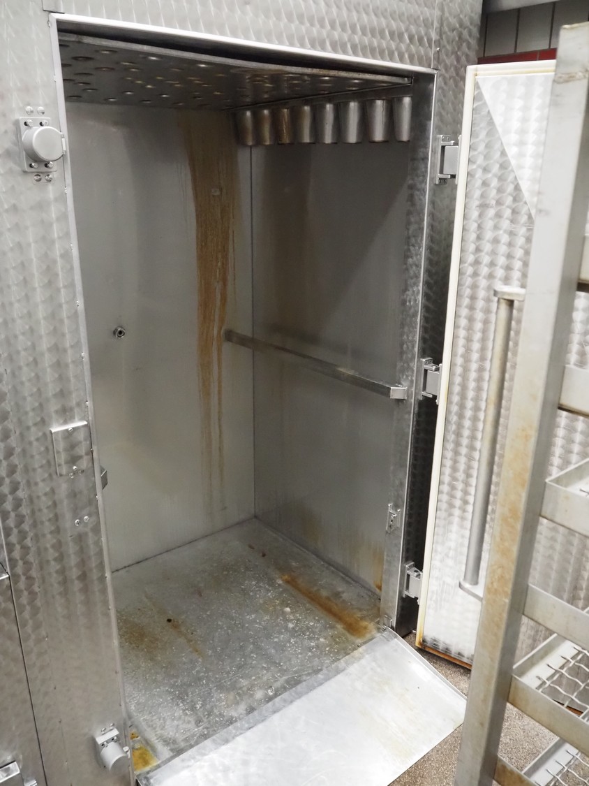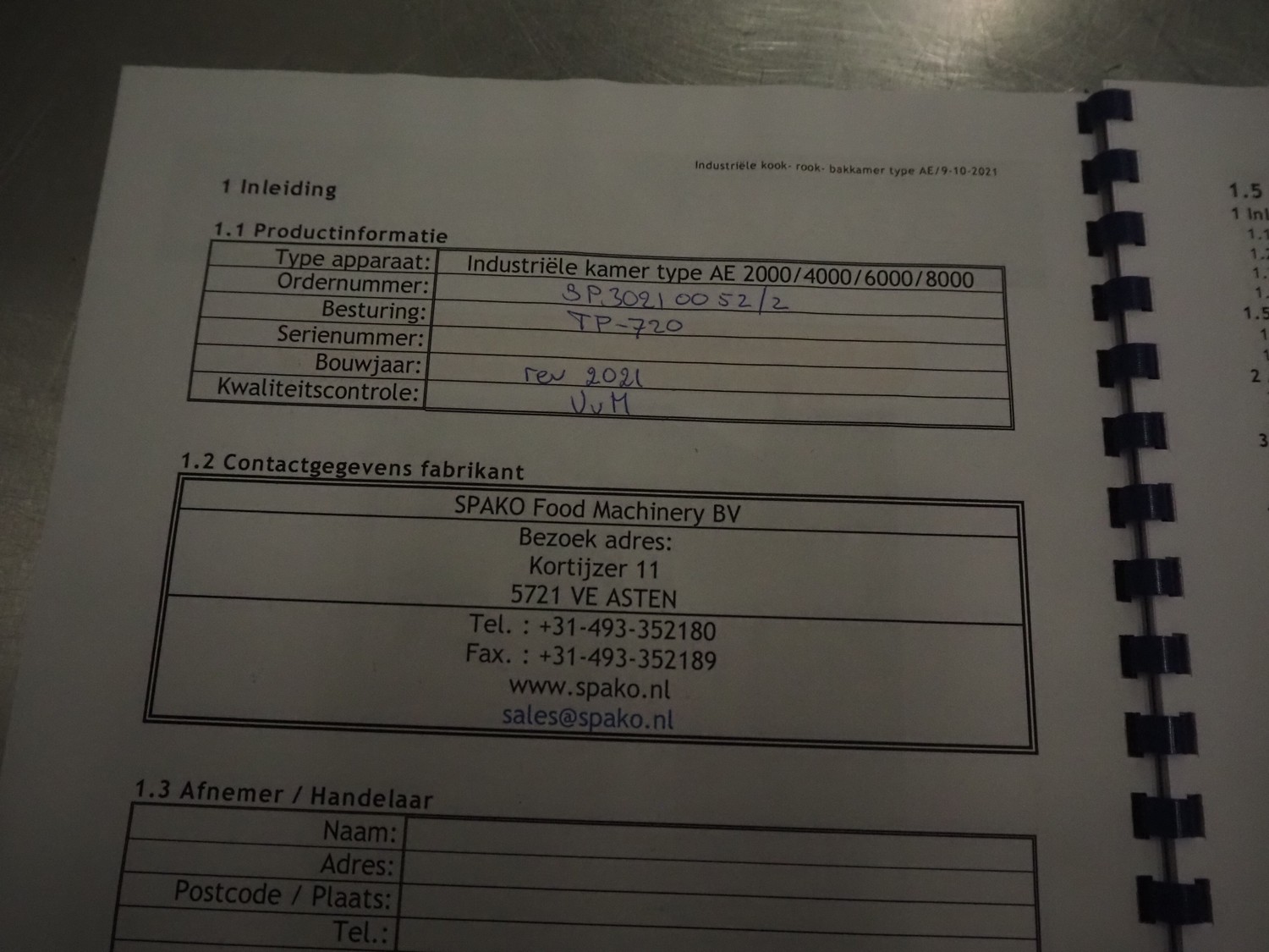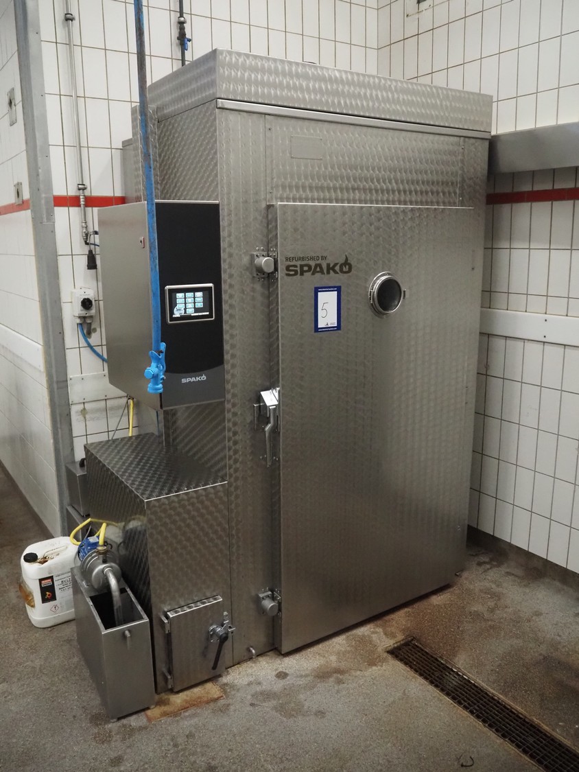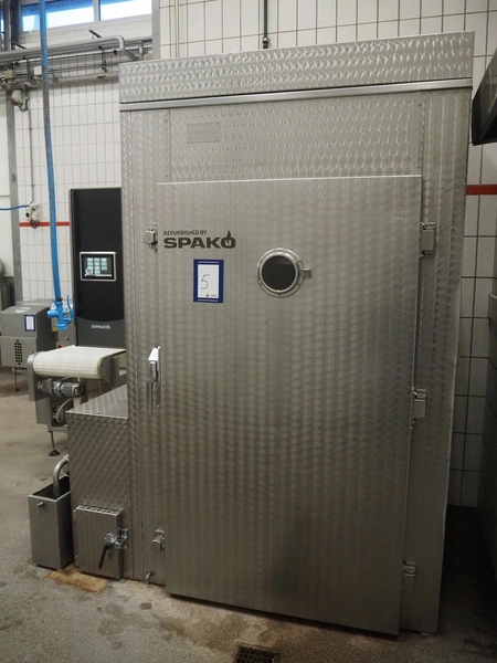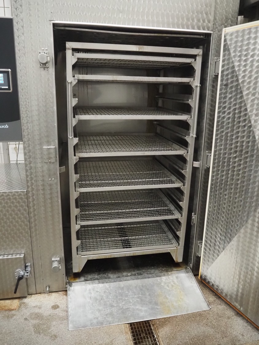 Spako cooking and smoking chamber for liquid smoke and wood chips , type: AE2000, serial number: SP60210084/1, year of construction: Rev. 2021, 400 V, 50 Hz, 25 kW, s/s smoke trolley, 12 floors, dimensions each floor: 1020 mm x 920 mm, total dimensions trolley: 1060 mm x 1015 mm x 1945 mm, inside dimensions chamber: 1100 mm x 1120 mm x 2100 mm, total dimensions chamber: 1300 mm x 2200 mm x 2650 mm.