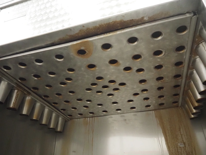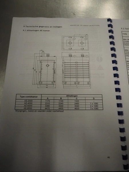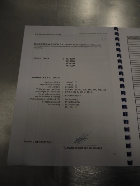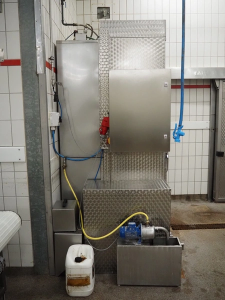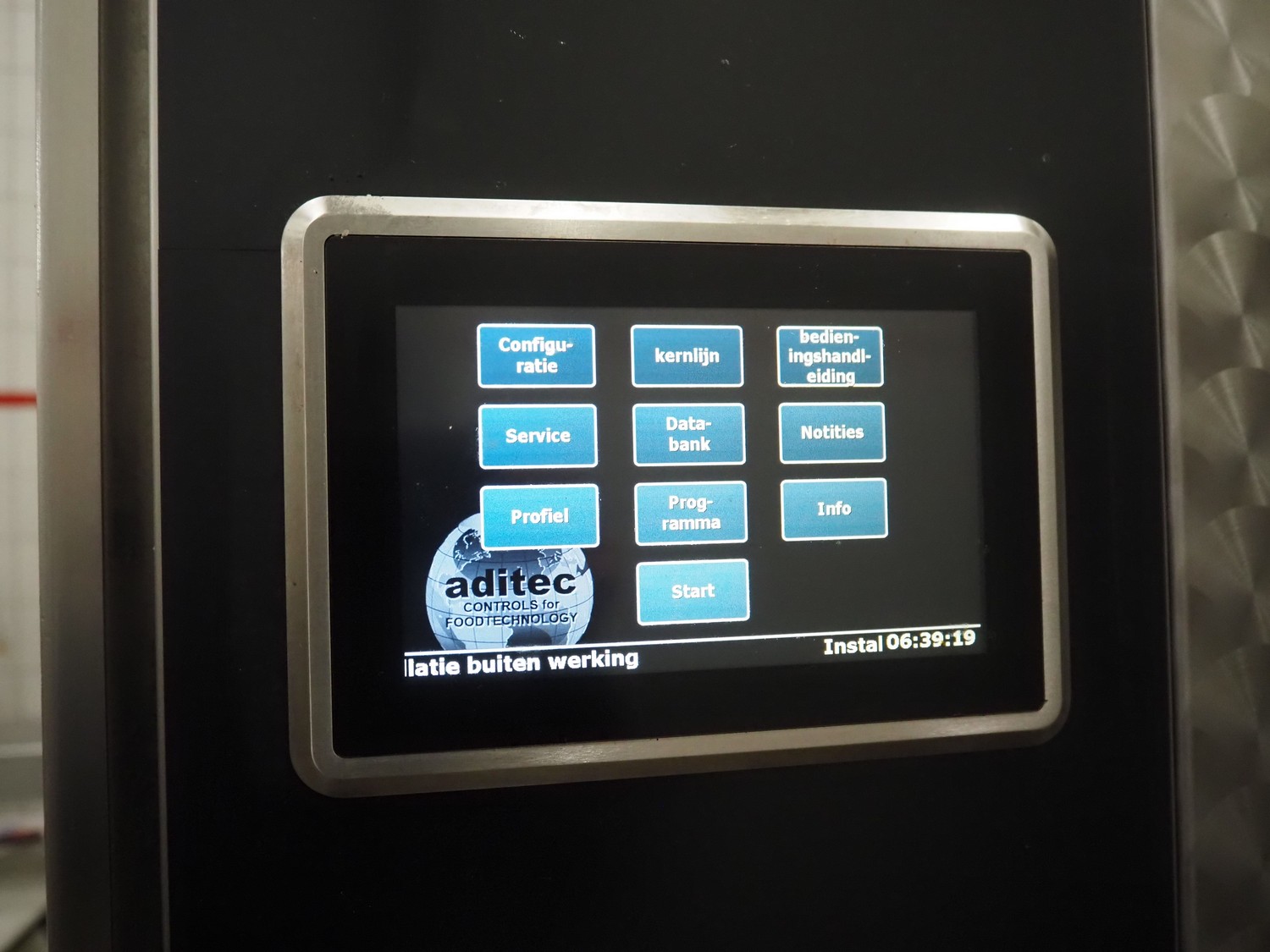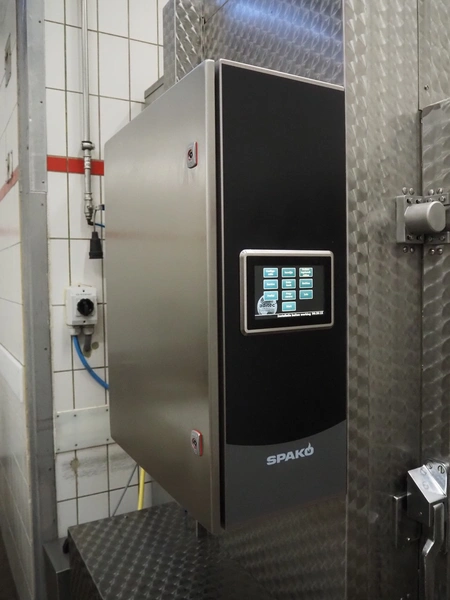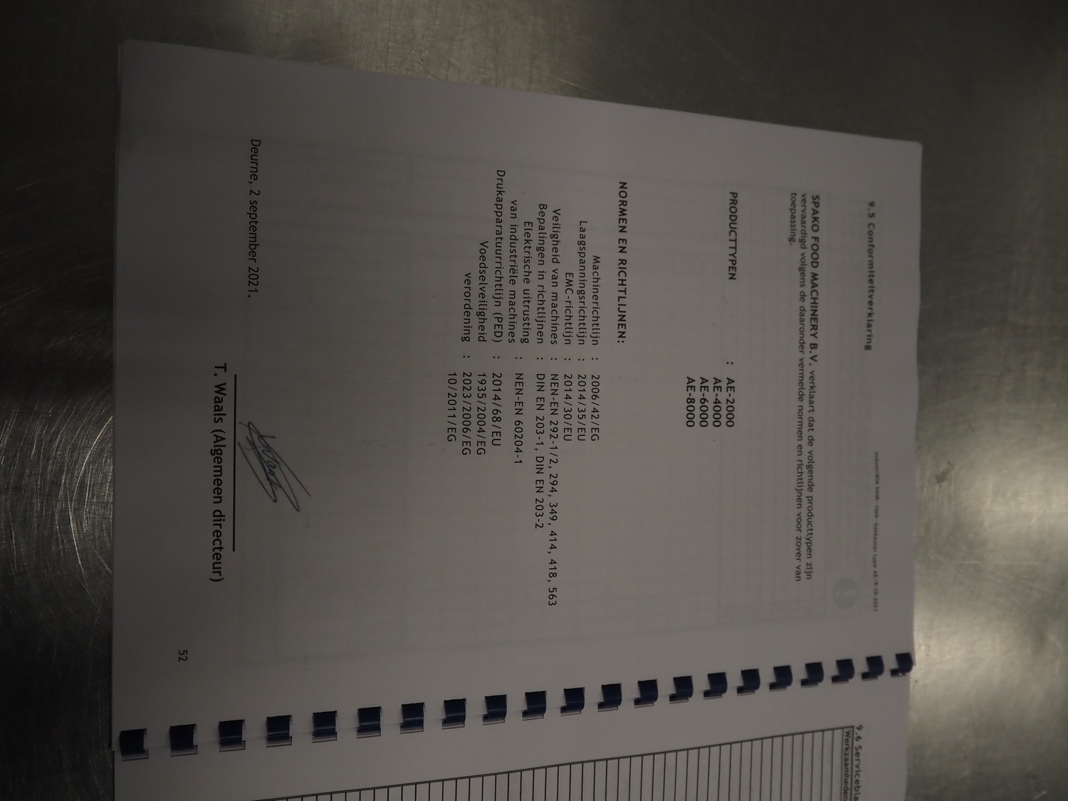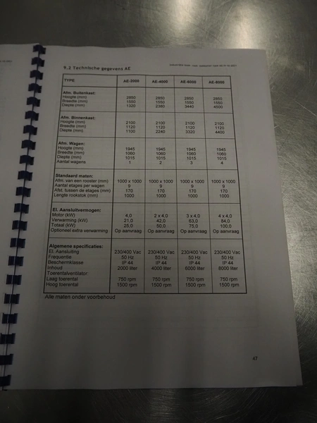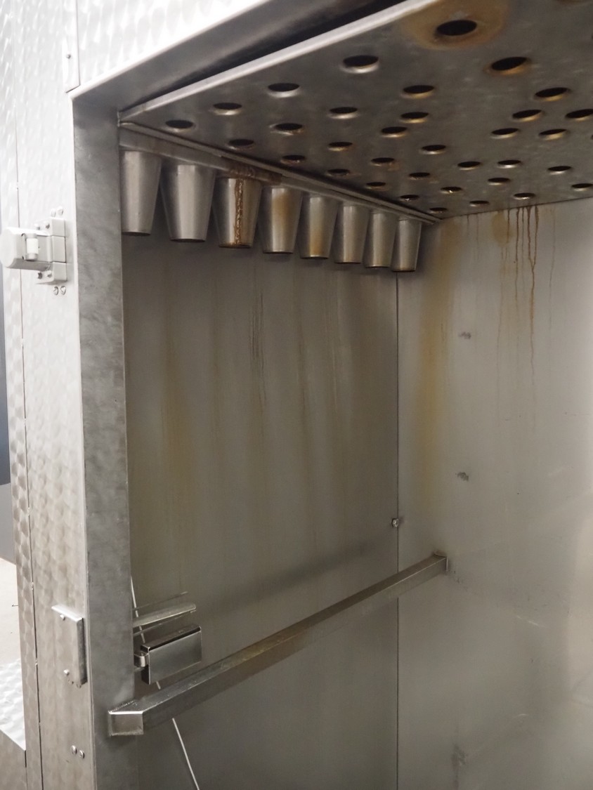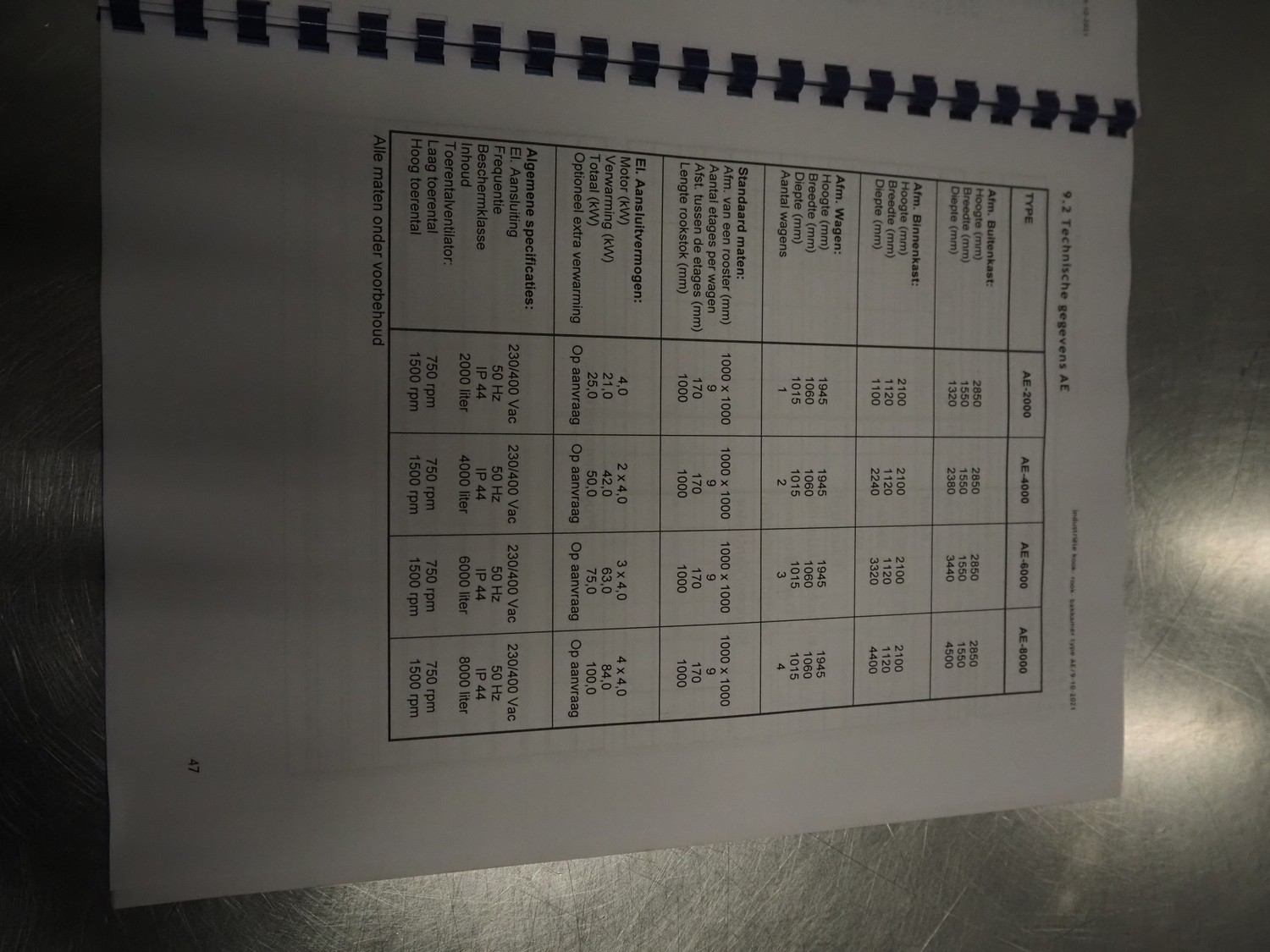 Spako cooking and smoking chamber for liquid smoke and wood chips , type: AE2000, serial number: SP60210084/1, year of construction: Rev. 2021, 400 V, 50 Hz, 25 kW, s/s smoke trolley, 12 floors, dimensions each floor: 1020 mm x 920 mm, total dimensions trolley: 1060 mm x 1015 mm x 1945 mm, inside dimensions chamber: 1100 mm x 1120 mm x 2100 mm, total dimensions chamber: 1300 mm x 2200 mm x 2650 mm.