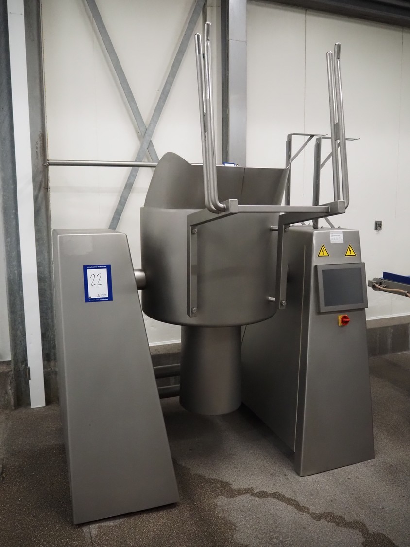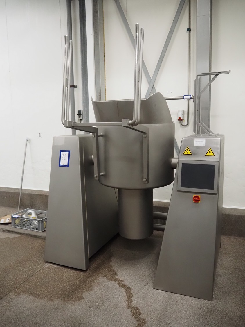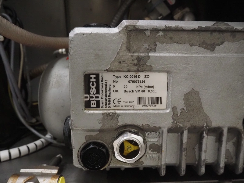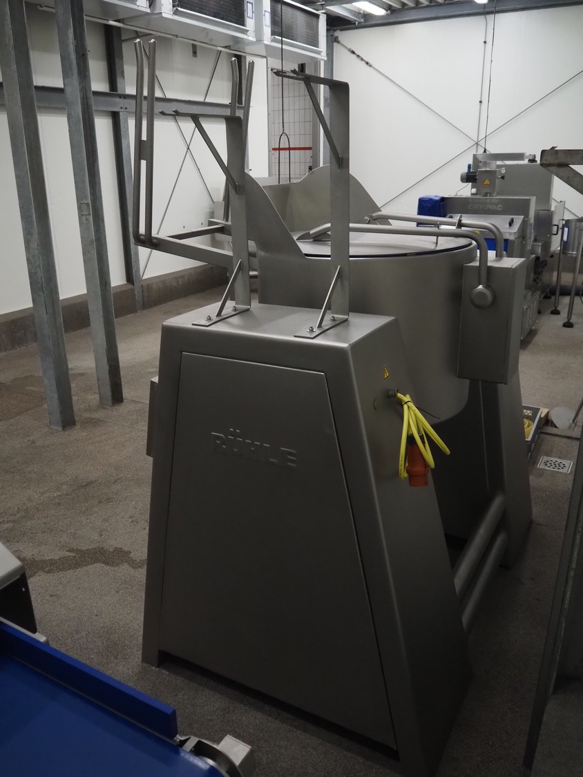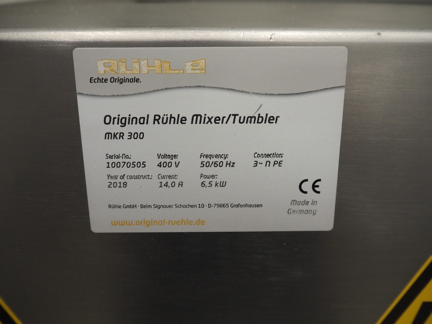 Rühle GmbH vacuum tumbler, type: MKR300, serial number: 10070505, year of construction: 2018, 400 V, 3 Ph, 50/60 Hz, 14.0 A, 6.5 kW, drum volume: 300 litres, maximum filling capacity: 220 litres, weight: 1200 kg, double jacketed for cooling, with Busch vacuum pump, type: KC 0016 D IZO, capacity: 16 m³ per hour, dimensions: 1900 mm x 1600 mm x 2400 mm.