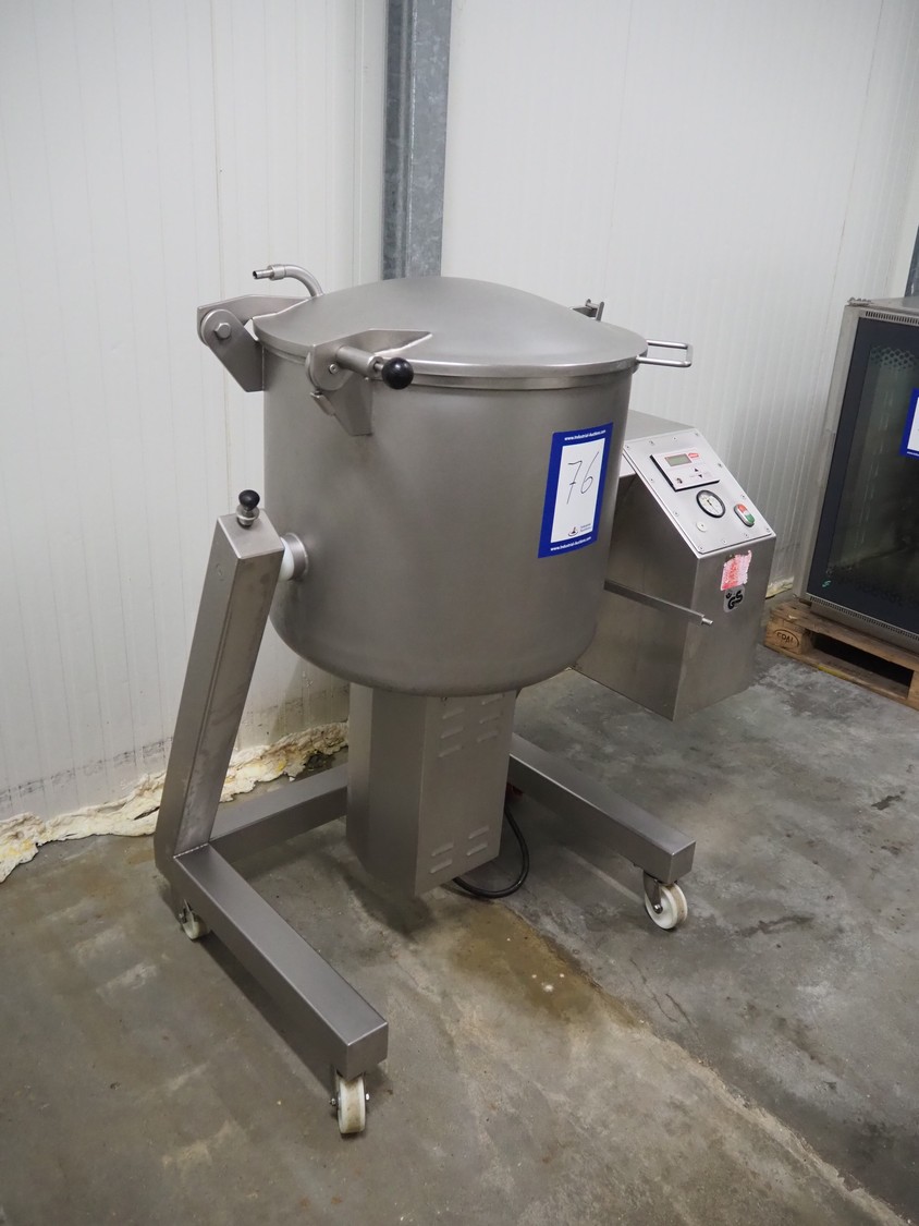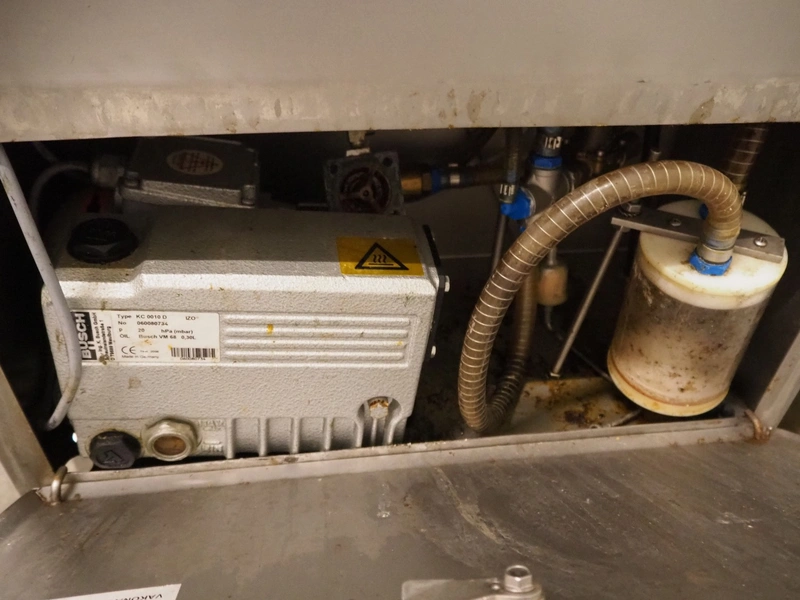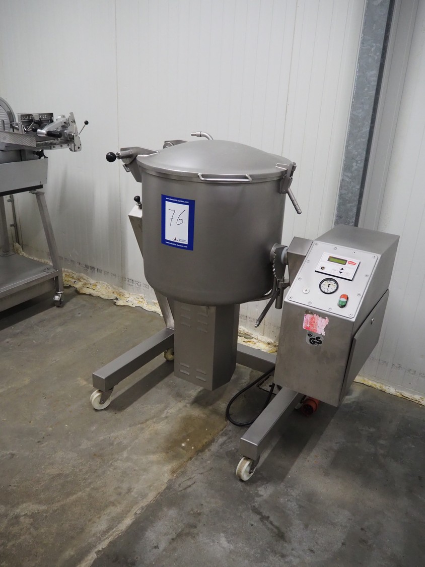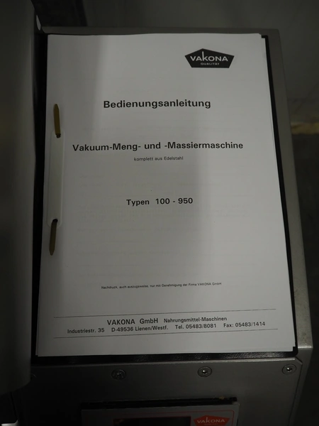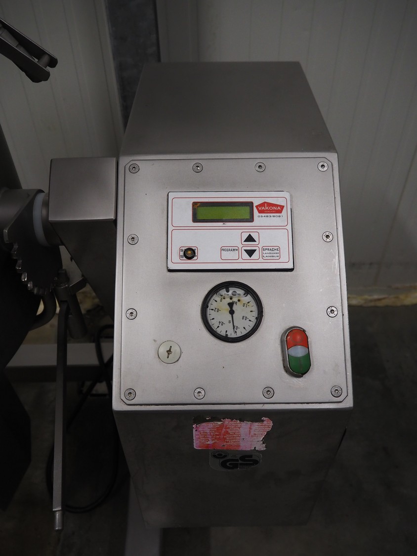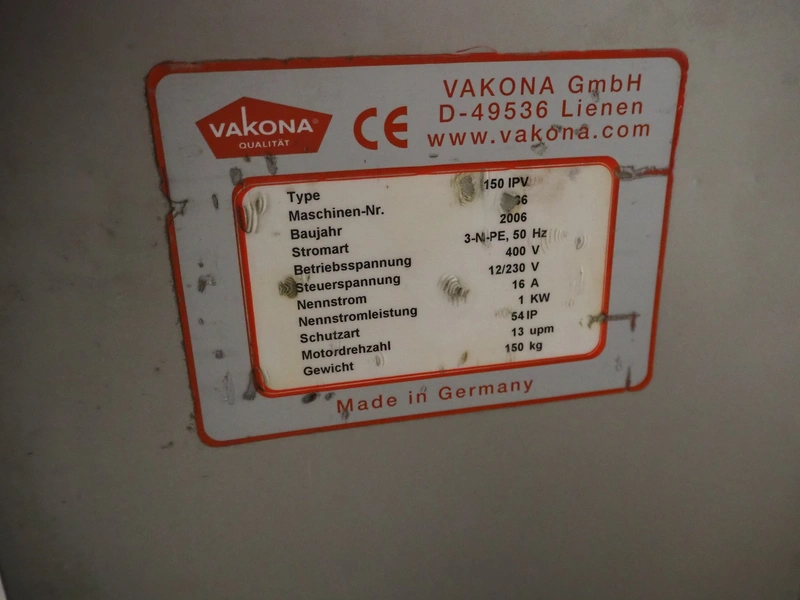 Vakona GmbH mobile vacuum tumbler, type: 150 IPV, year of construction: 2006, 400 V, 3 Ph, 50 Hz, 16 A, 1 kW, capacity: 150 liter, Busch vacuum pump, type: KC 0010 D, capacity: 10 m³ per hour, dimensions: 1200 mm x 700 mm x 1300 mm.