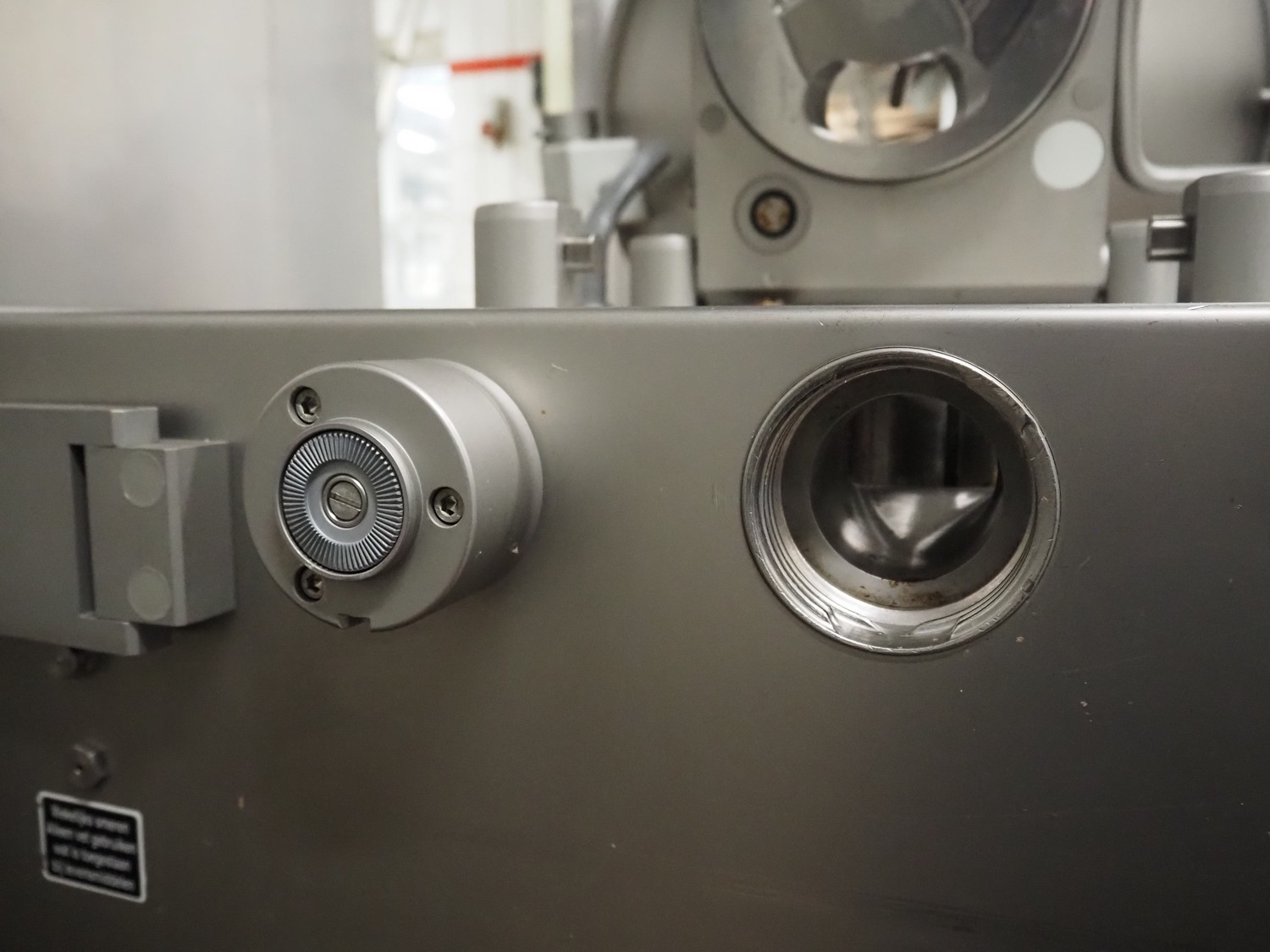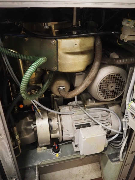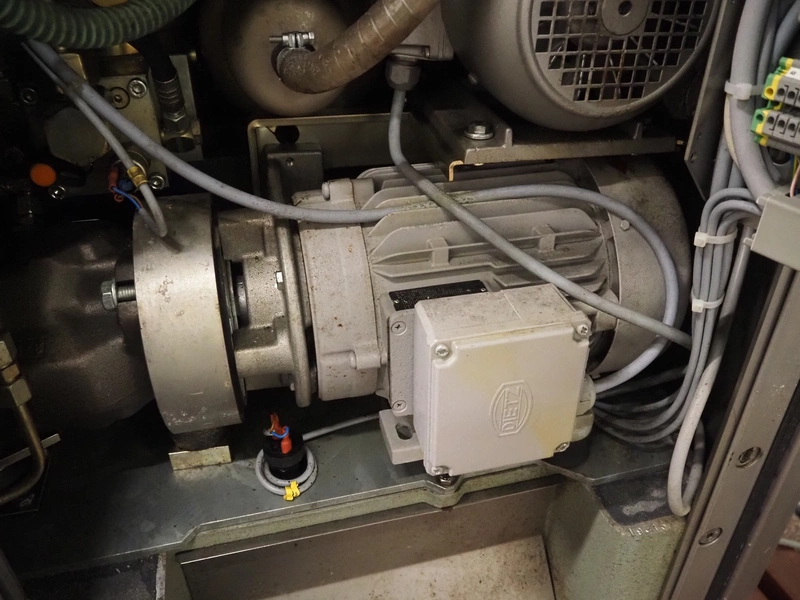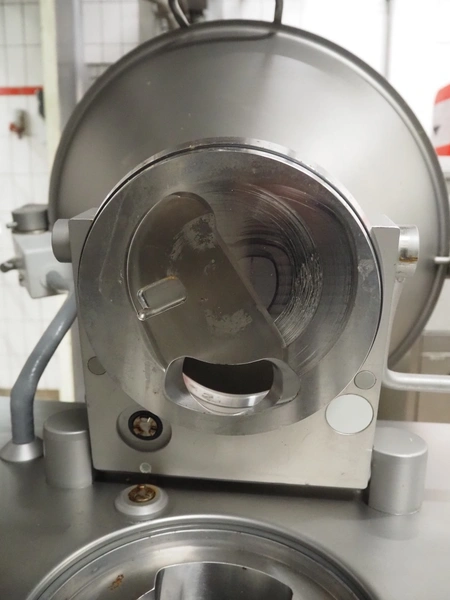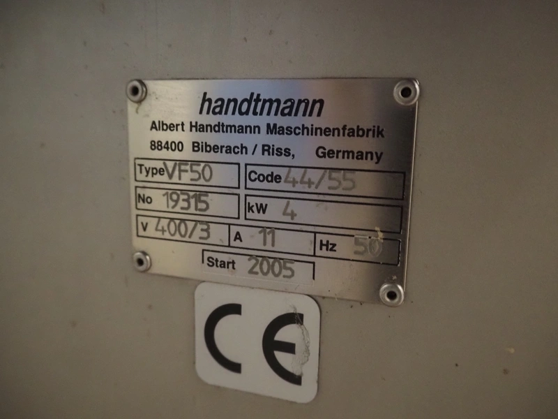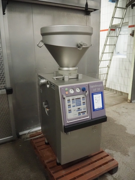Handtmann vacuum filling machine, type: VF50, number: 19315, year of construction: 2005, 400 V, 3 Ph, 50 Hz, 11 A, 4 kW, dimensions: 850 mm x 500 mm x 1600 mm.