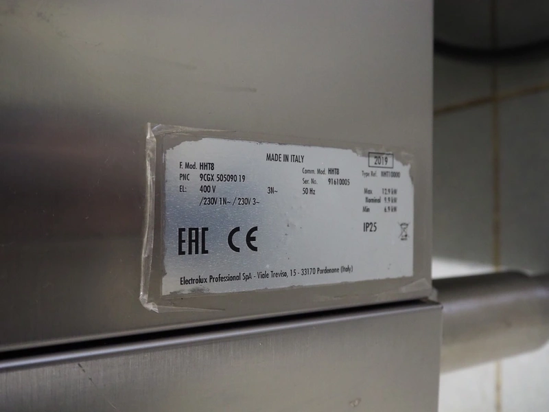 Electrolux dishwasher, model: HHT8, serial number: 91610005, year of construction: 2019, 230/400 V, 1/3 Ph, 50 Hz, 12.9 kW, dimensions: 750 mm x 900 mm x 1570 mm.
