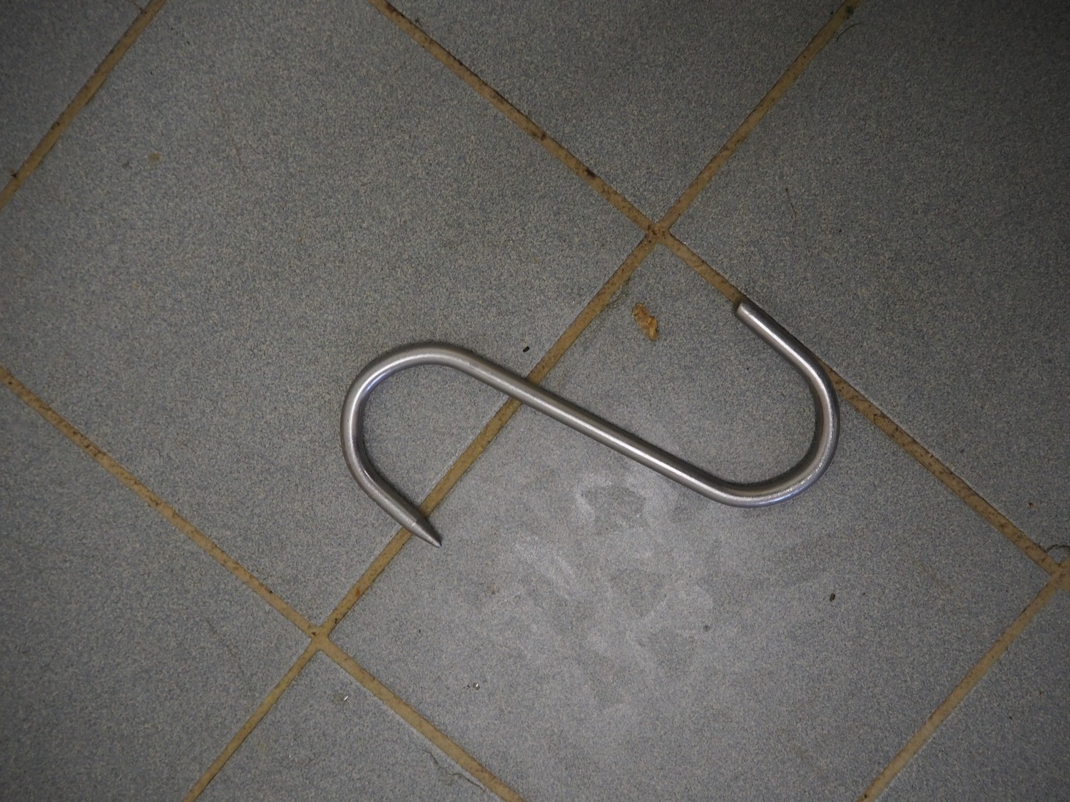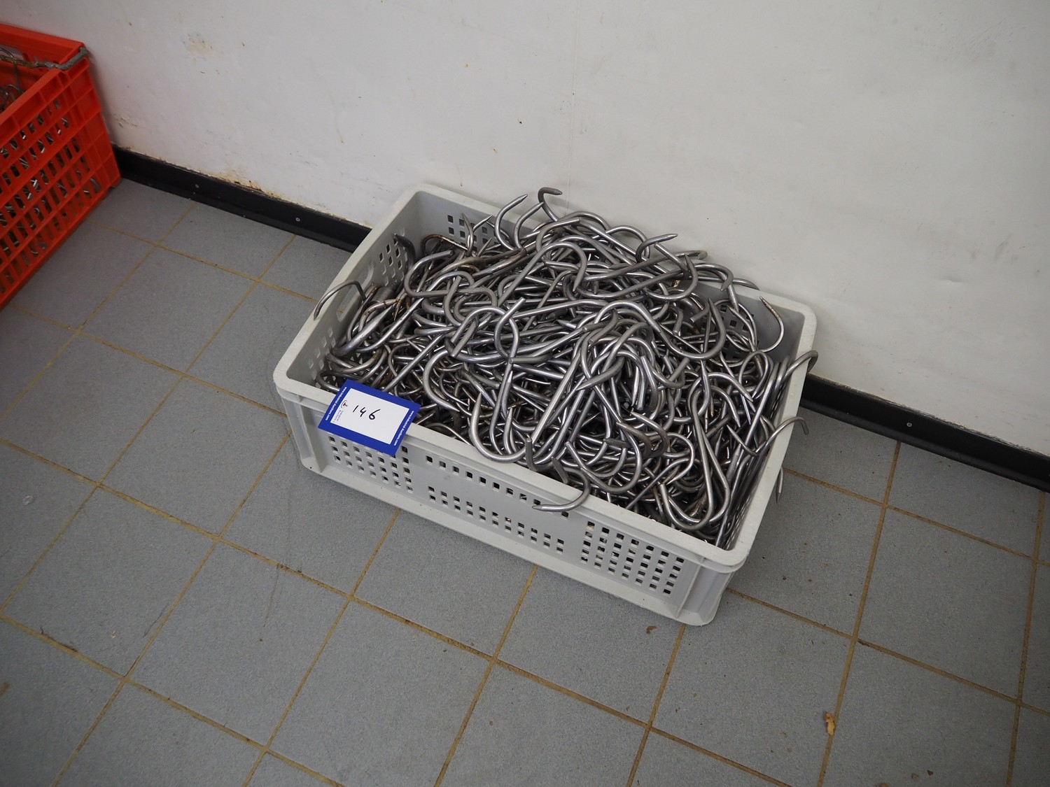 Plastic crate with s/s meat hooks, dimensions: 600 mm x 400 mm x 300 mm.