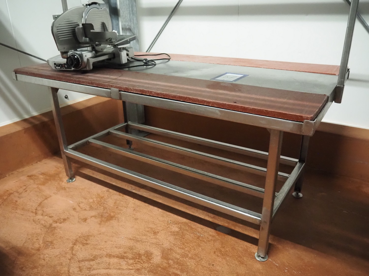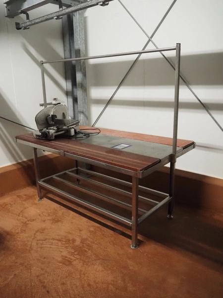 S/s deboning table with plastic worktops dimensions: 2000 mm x 1060 mm x 1900 mm.