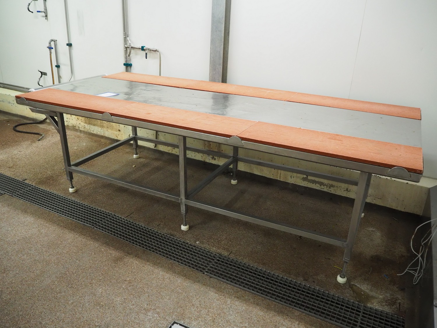 S/s deboning table with plastic worktops dimensions: 3150 mm x 1350 mm x 900 mm.