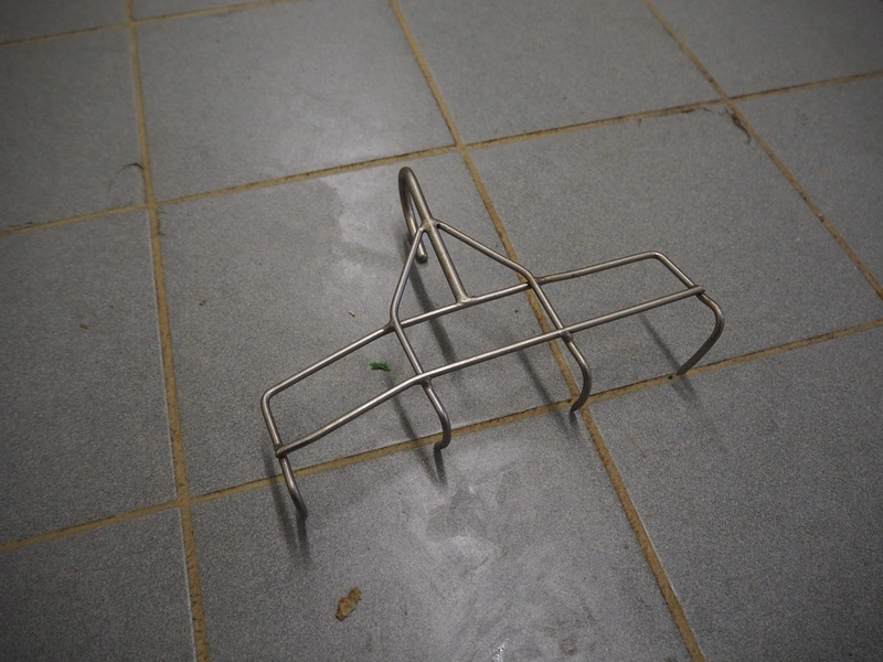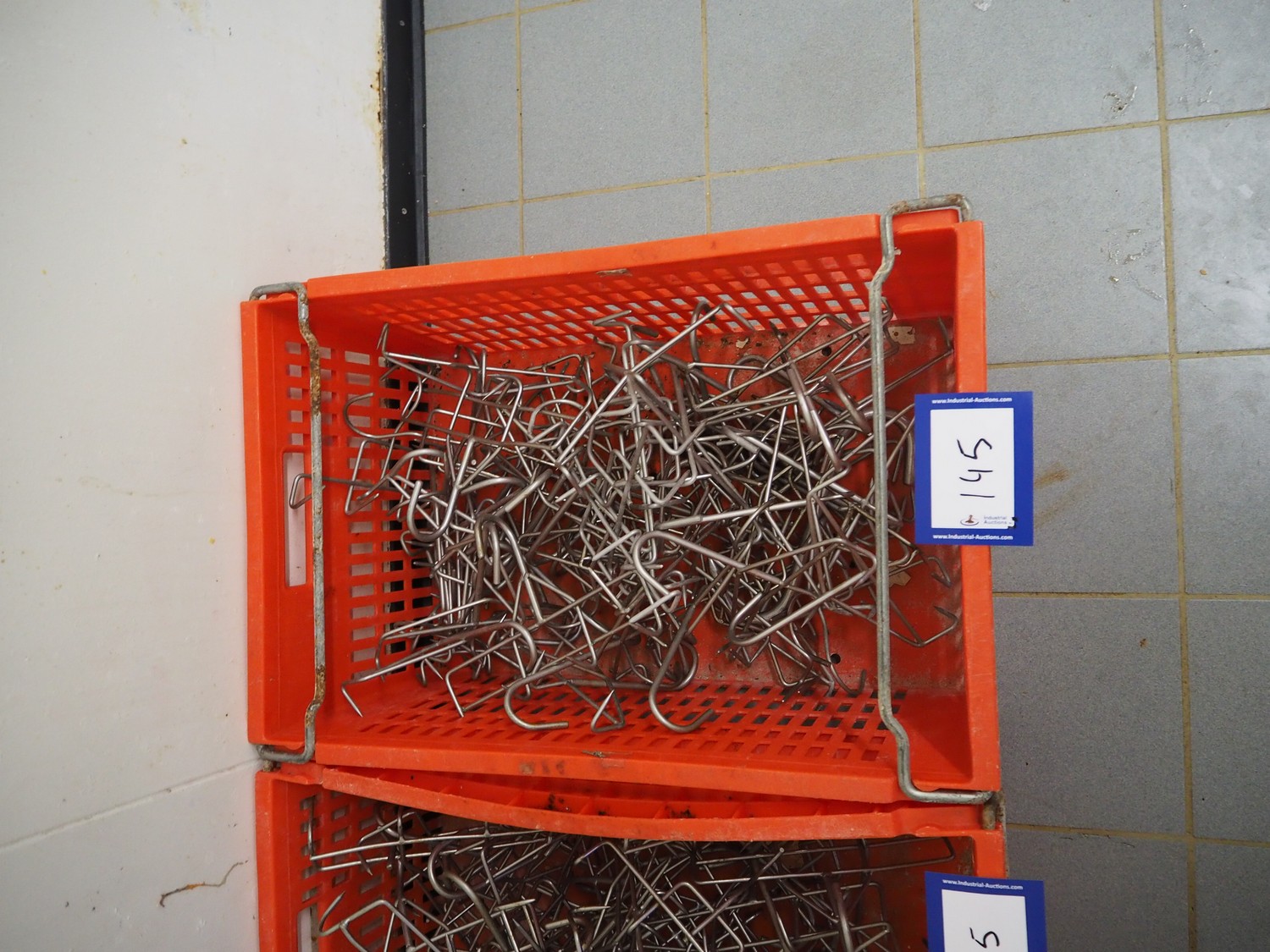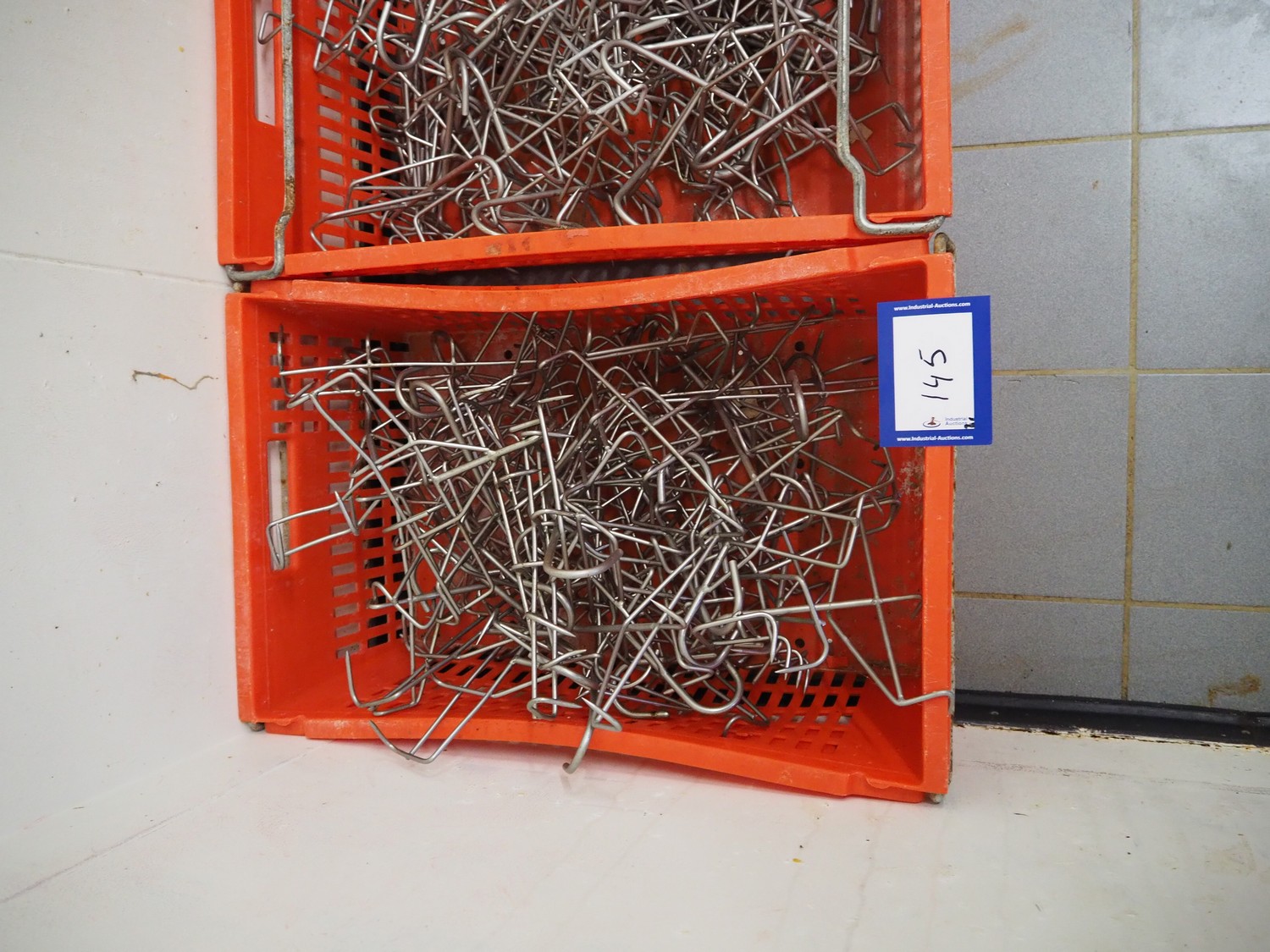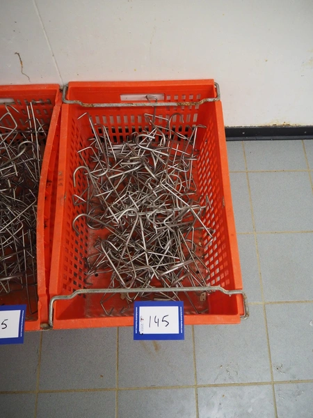 2 plastic crates with s/s organ hooks, dimensions: (2x) 600 mm x 400 mm x 280 mm.