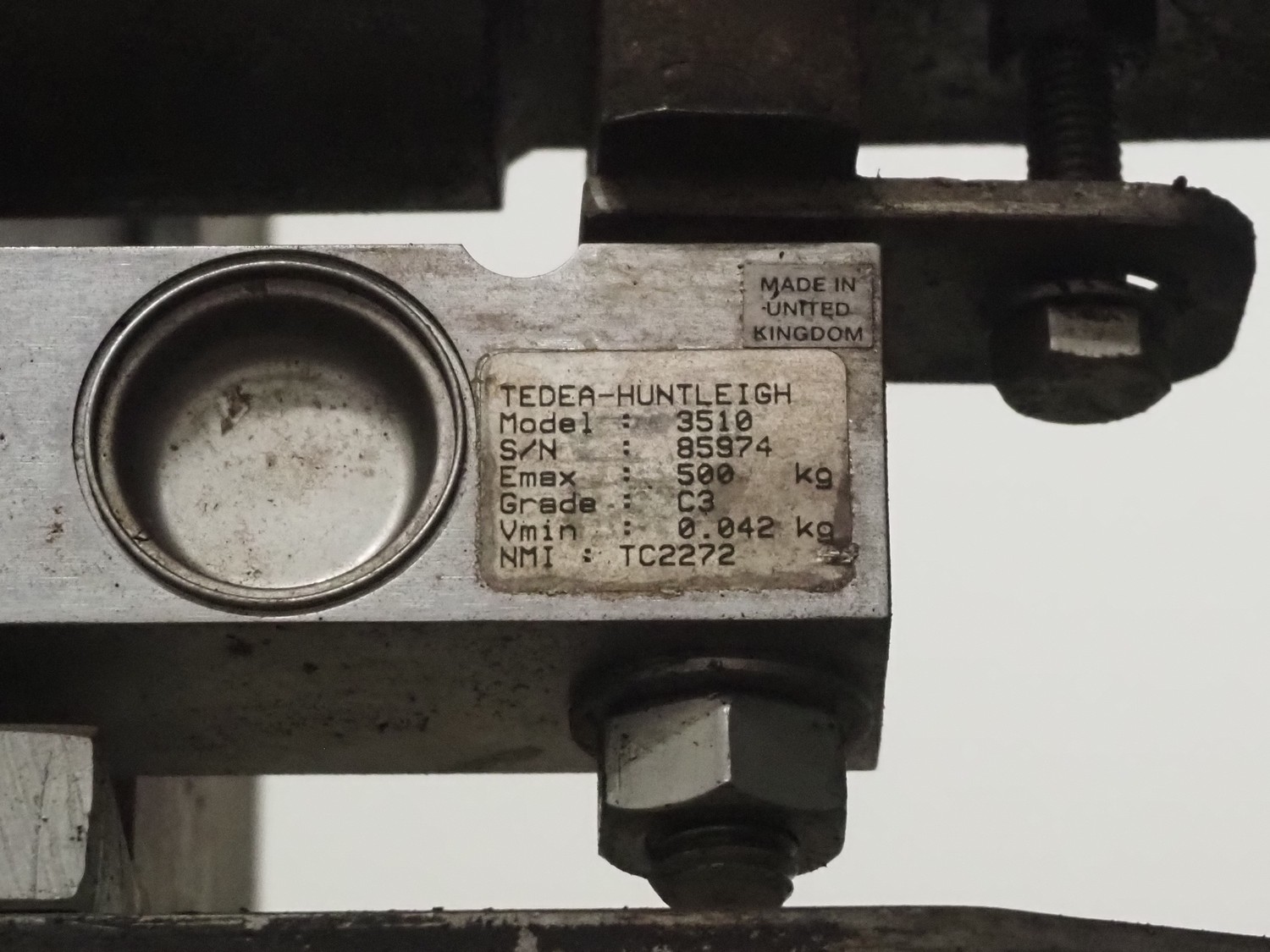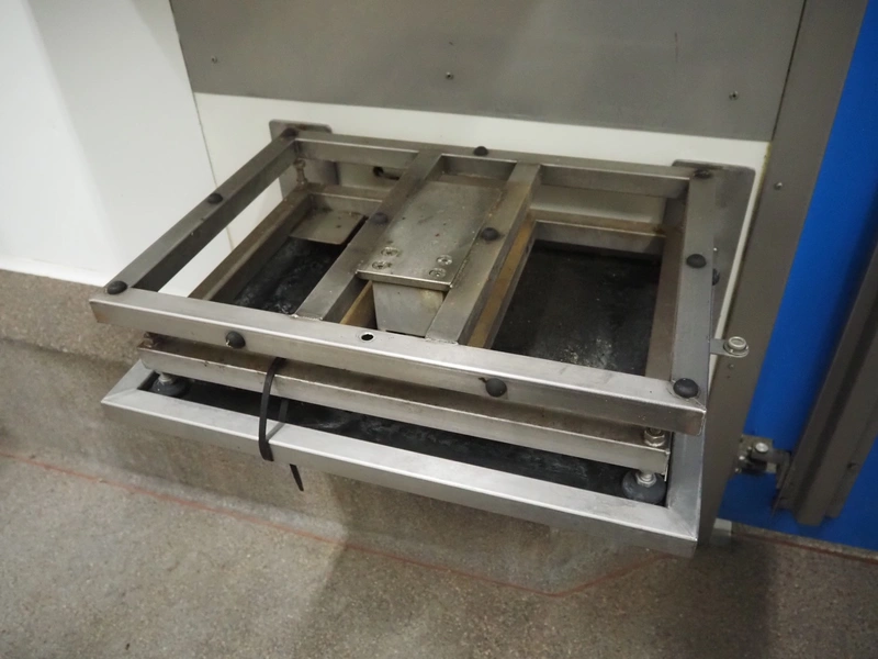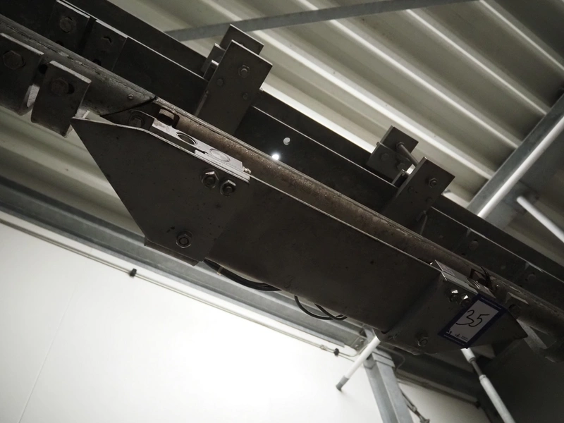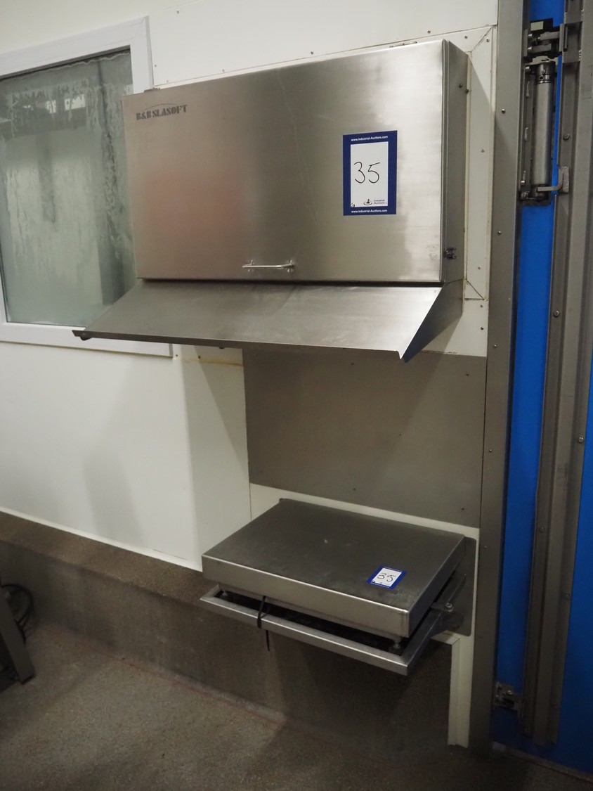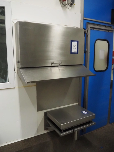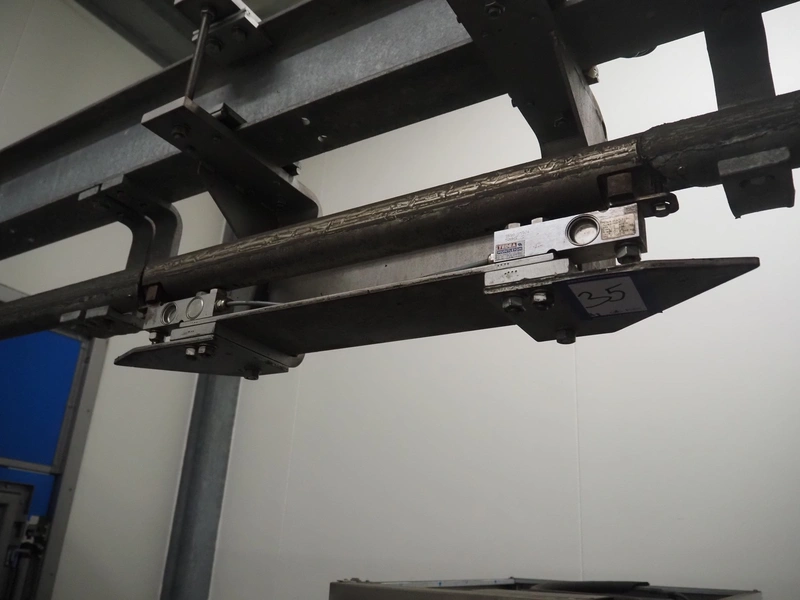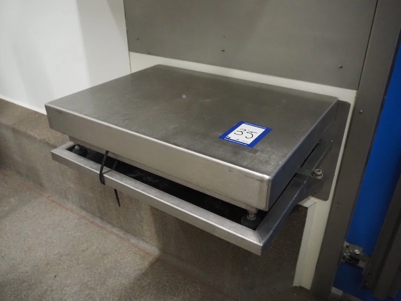 Tedea-Huntleigh tube rail weighing system, model: 3510, serial number': 85974, maximum weight: 500 kg, dimensions: 750 mm x 200 mm x 500 mm, s/s cabinet with indicator and label printer, dimensions: 1000 mm x 500 mm x 600 mm, weighing scale for crates, dimensions: 600 mm x 450 mm x 130 mm.