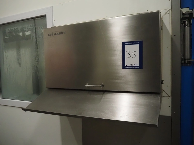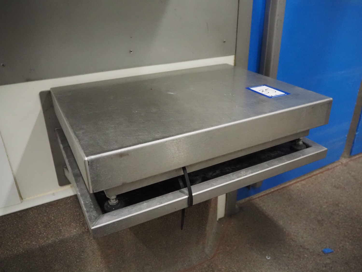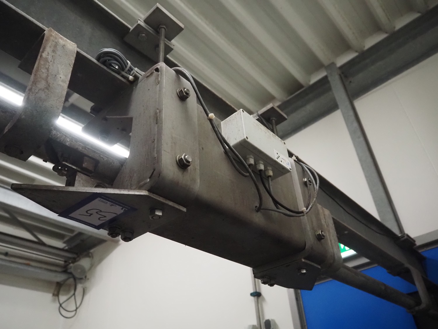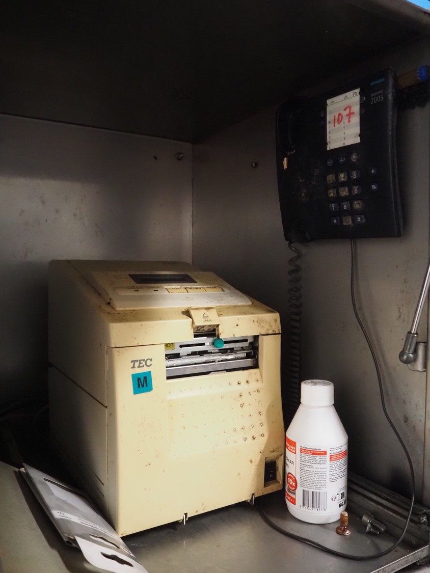 Tedea-Huntleigh tube rail weighing system, model: 3510, serial number': 85974, maximum weight: 500 kg, dimensions: 750 mm x 200 mm x 500 mm, s/s cabinet with indicator and label printer, dimensions: 1000 mm x 500 mm x 600 mm, weighing scale for crates, dimensions: 600 mm x 450 mm x 130 mm.