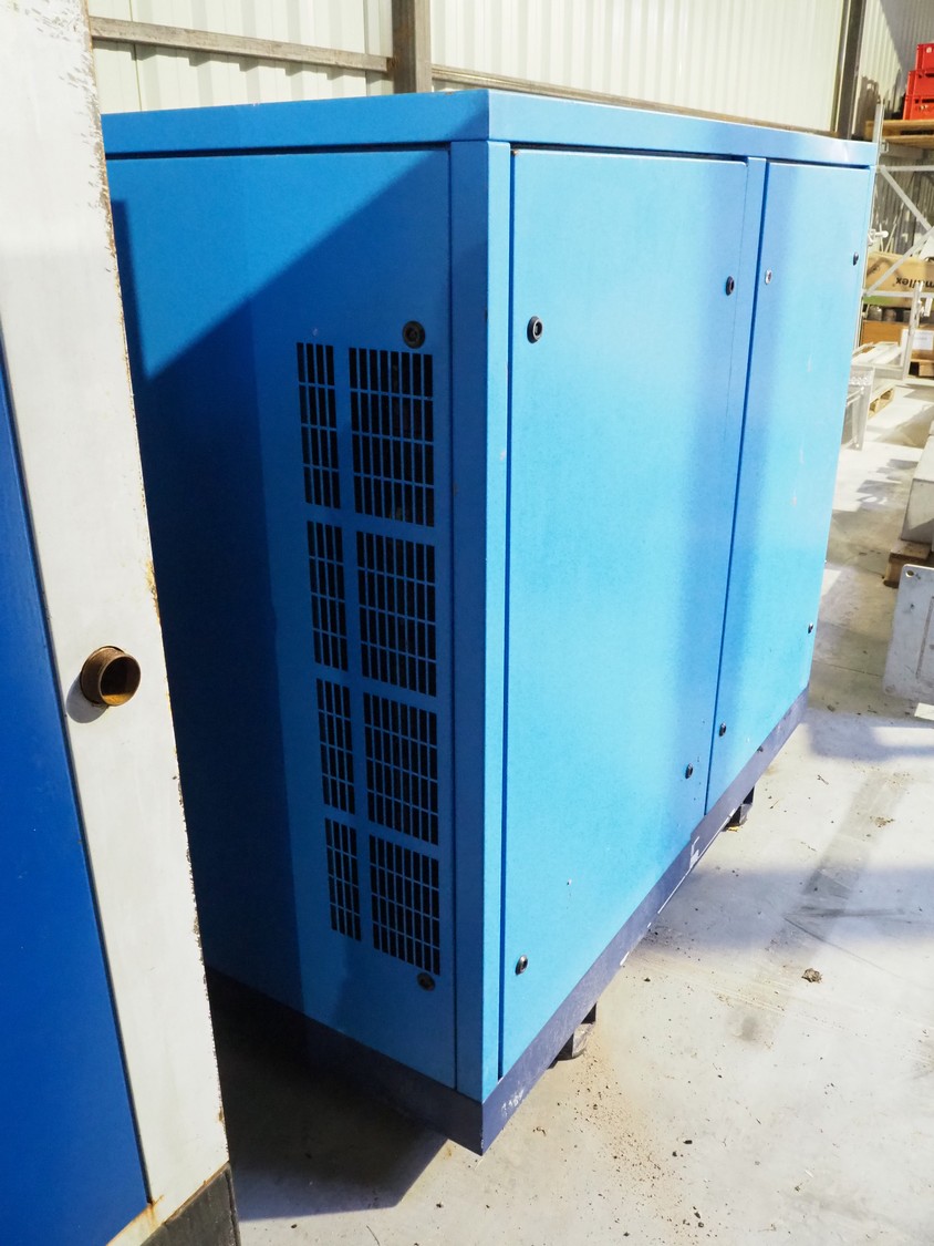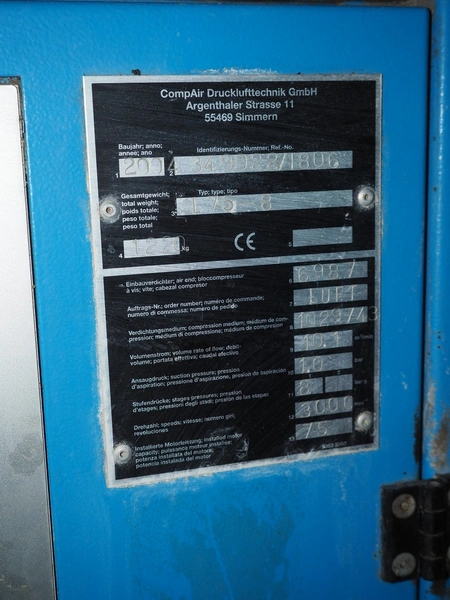 Gardner Denver Deutschland GmbH rotary screw air compressor, type: L75-8, id-number: 349022/1806, year of construction: 2004, 400 V, 3 Ph, 50 Hz, volume rate of flow: 10.1 m³/min, motor capacity: 75 kW, weight: 1220 kg, dimensions: 1800 mm x 1200 mm x 1640 mm.