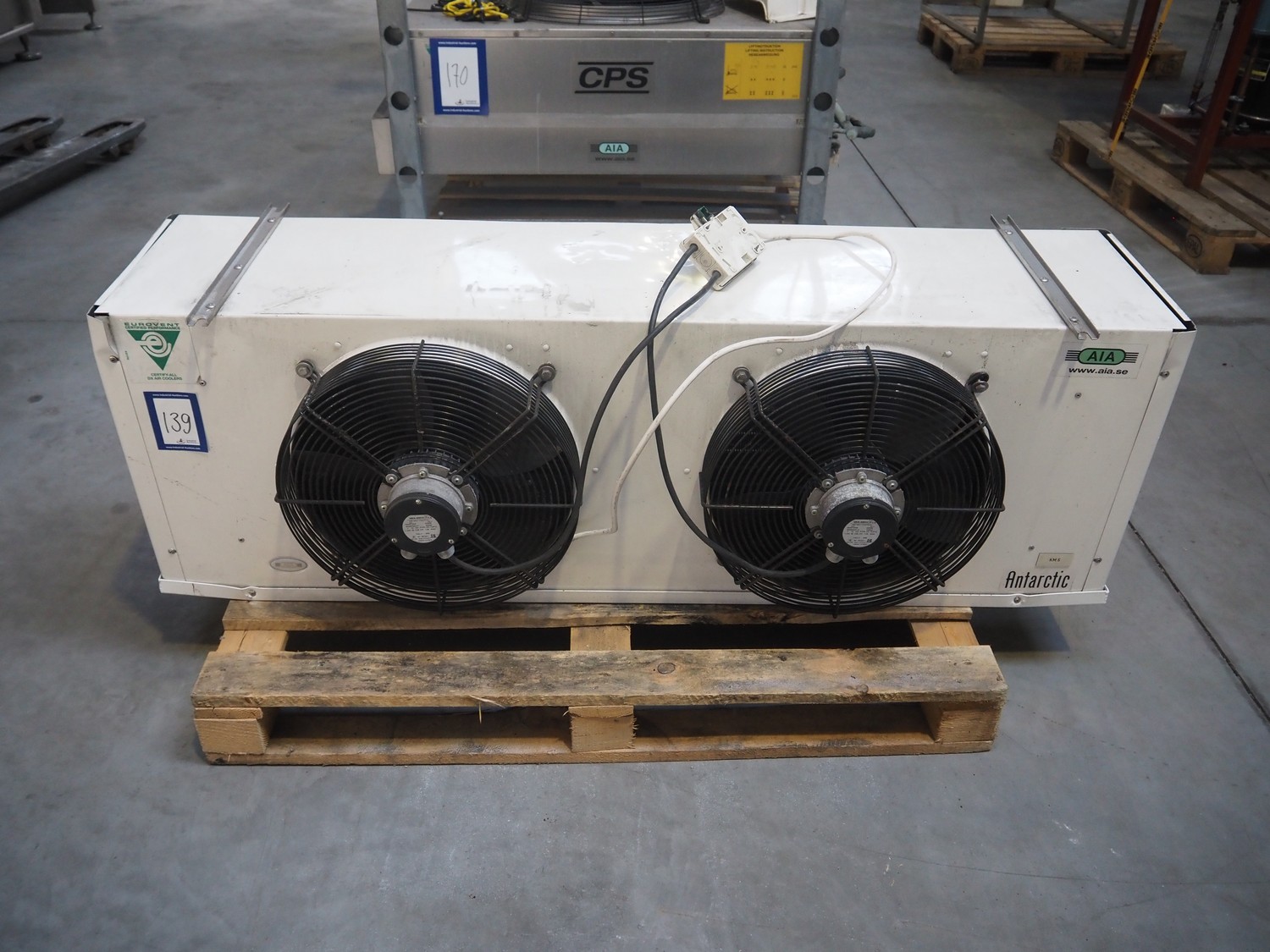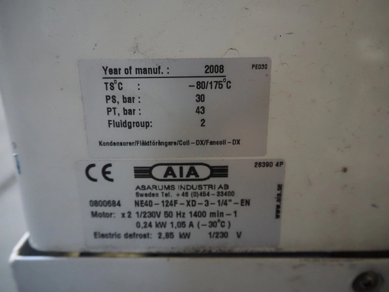 AIA evaporator with 2 fans, model: NE40-124F-XD-3-1/4"-EN, number: 0800684, year of construction: 2008, 230 V, 50 Hz, 1.05 A, 0.24 kW, dimensions: 1150 mm x 500 mm x 500 mm.