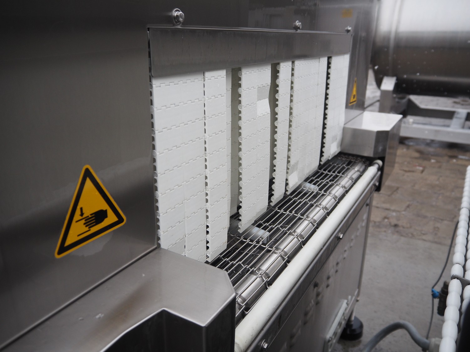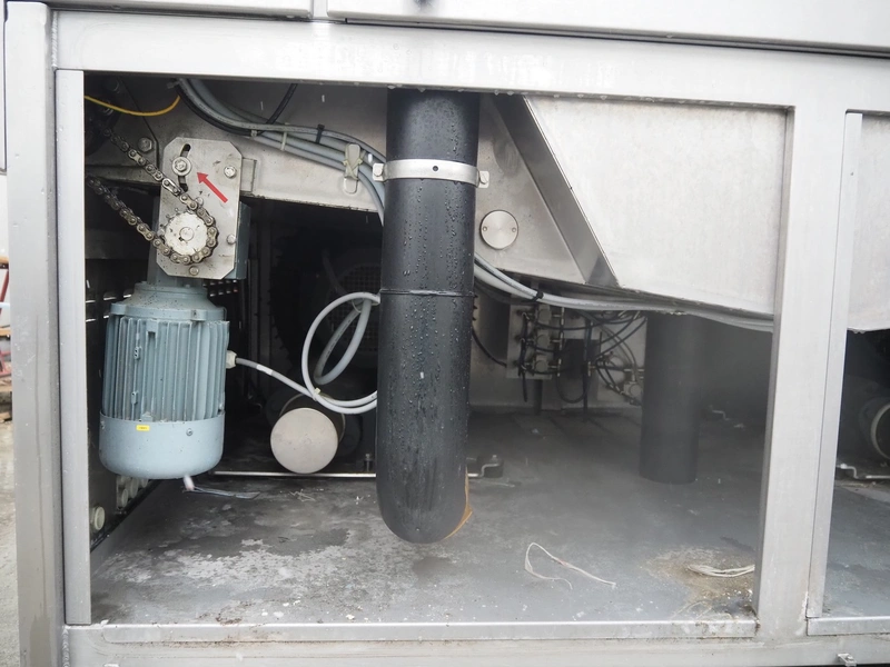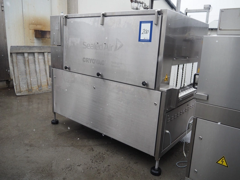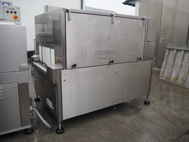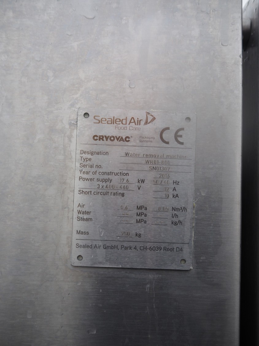 Cryovac drying tunnel, type: WR81-800, serial number: SN01307, year of construction: 2016, 400-460 V, 3 Ph, 50 / 60 Hz, 32 A, 17.6 kW, s/s mesh belt, belt width: 845 mm, working width: 800 mm, clearance: 810 mm x 300 mm, total dimensions: 2050 mm x 1320 mm x 1650 mm.