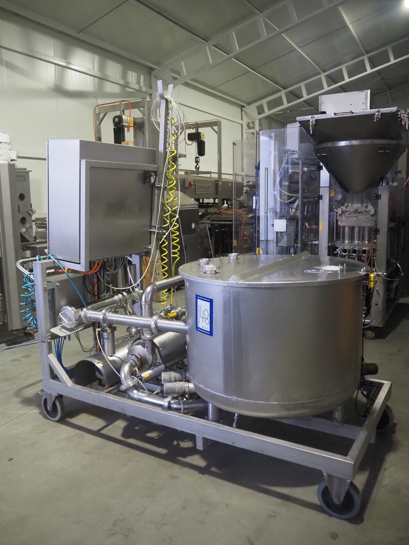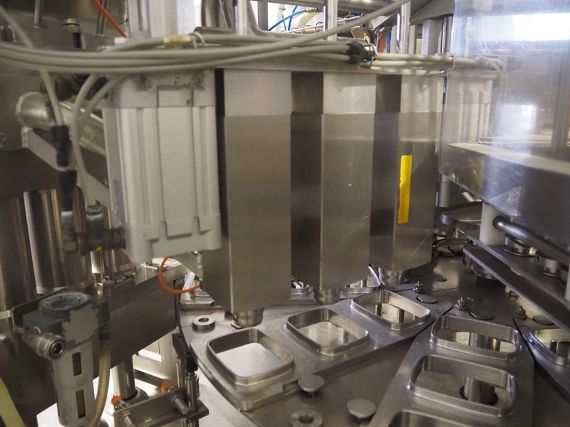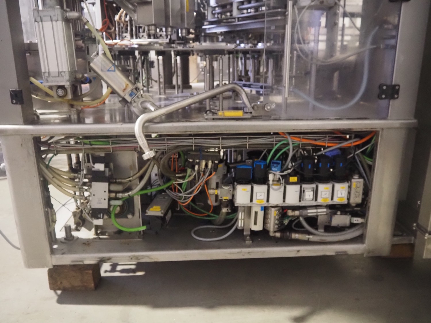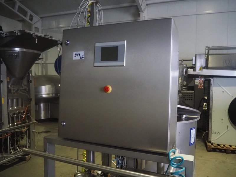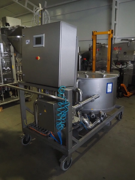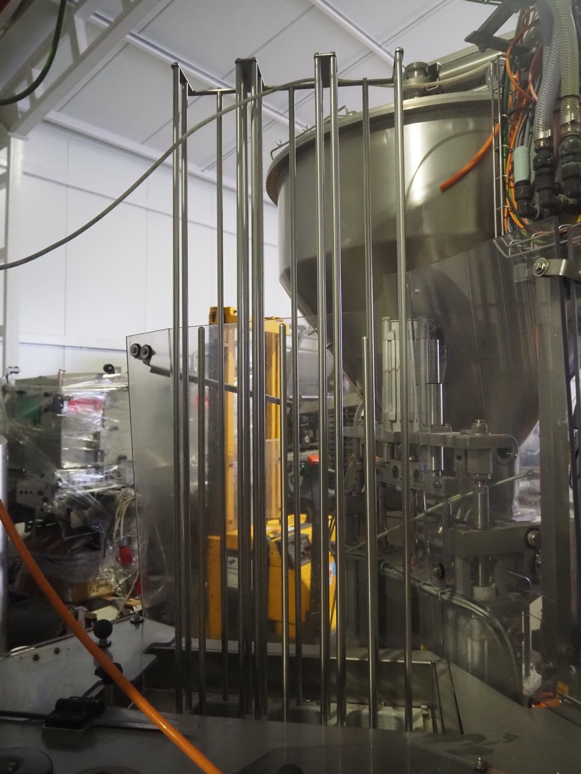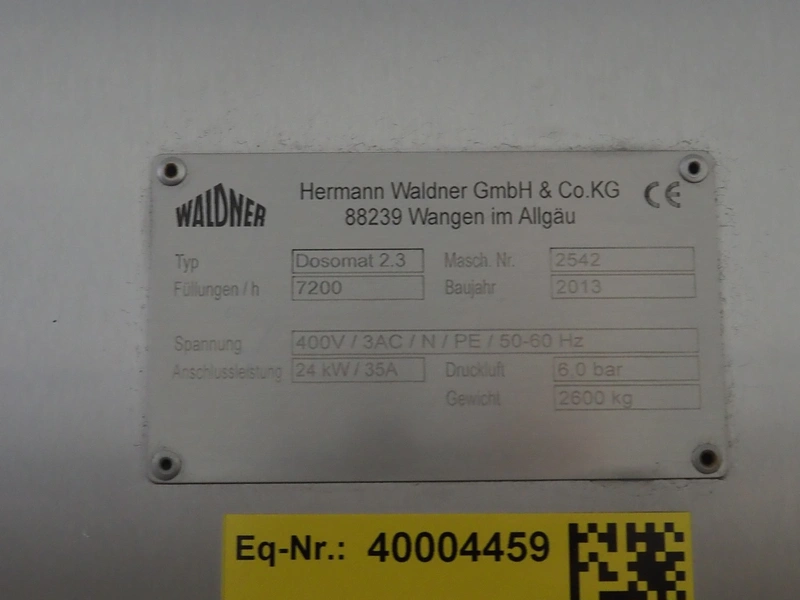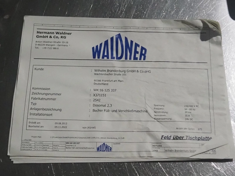 Hermann Waldner GmbH cup filling and sealing machine, type: Dosomat 2.3, serial number: 2542, year of cosntruction: 2013 , 400 V, 3 Ph, 50-60 Hz, 35 A, 24 kW, 7200 units per hour, weight: 2600 kg, dye dimensions: (3x) 100 mm x 75 mm, film width: 380 mm, total dimensions: 2400 mm x 2850 mm x 2420 mm, with CIP tank on s/s mobile frame, inside dimensions: Ø 1000 mm x 820 mm, total dimensions: 2350 mm x 1030 mm x 2300 mm. including s/s trolley with densters, dimensions: 1500 mm x 800 mm x 1050 mm, and palletbox with extra parts, dimensions: 1200 mm x 1000 mm x 1500 mm.