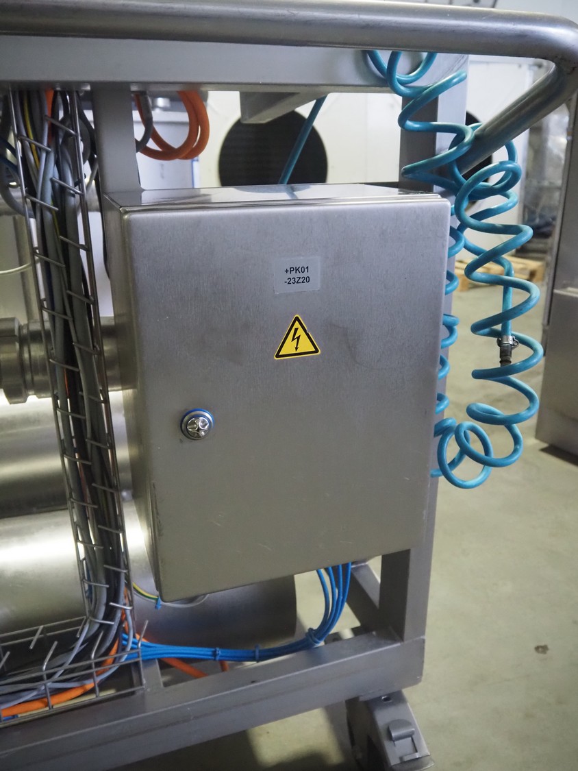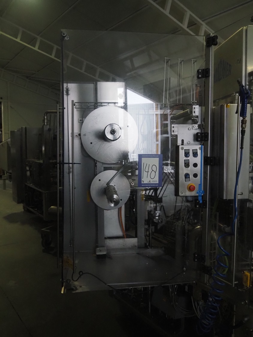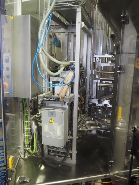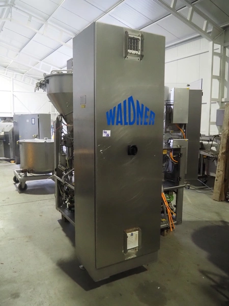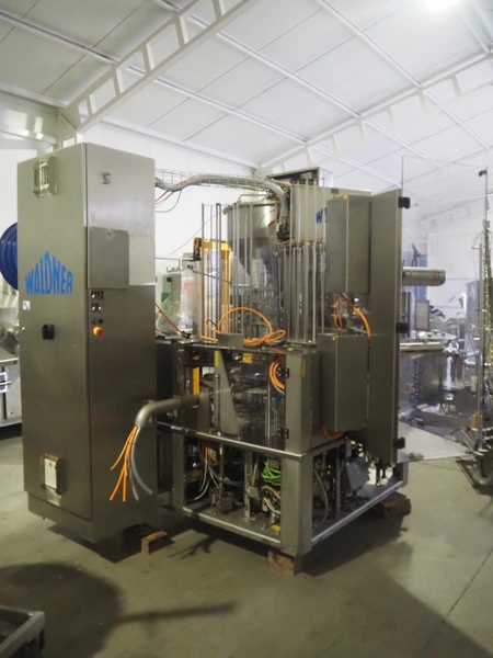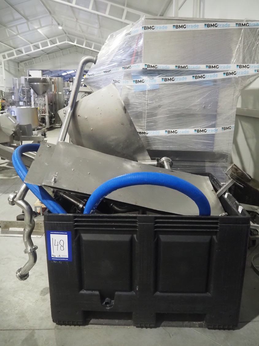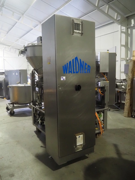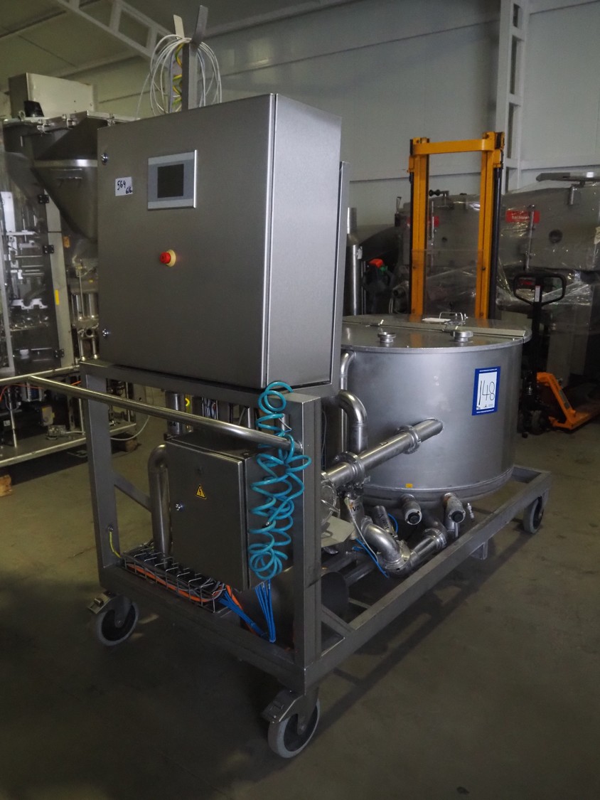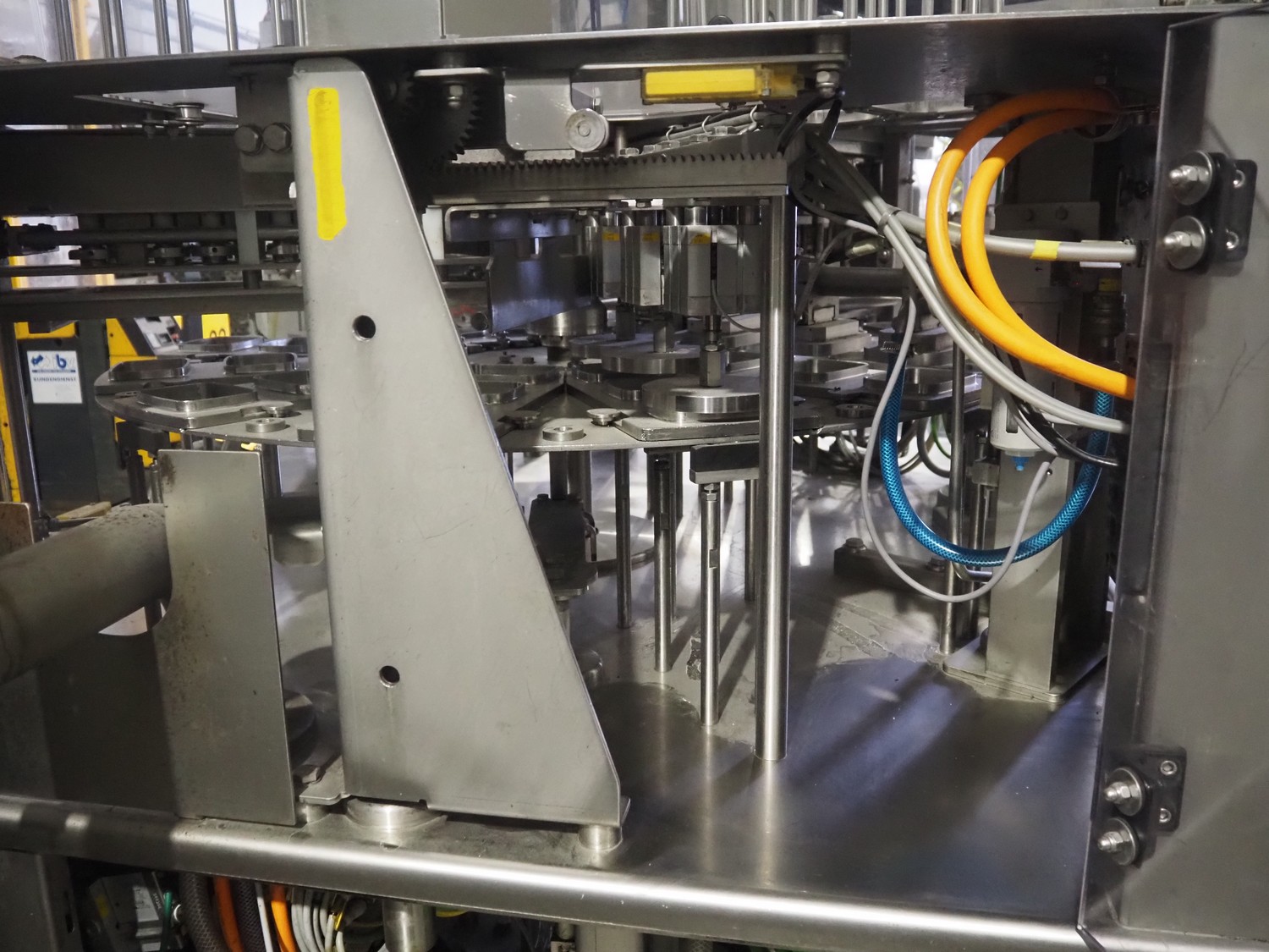 Hermann Waldner GmbH cup filling and sealing machine, type: Dosomat 2.3, serial number: 2542, year of cosntruction: 2013 , 400 V, 3 Ph, 50-60 Hz, 35 A, 24 kW, 7200 units per hour, weight: 2600 kg, dye dimensions: (3x) 100 mm x 75 mm, film width: 380 mm, total dimensions: 2400 mm x 2850 mm x 2420 mm, with CIP tank on s/s mobile frame, inside dimensions: Ø 1000 mm x 820 mm, total dimensions: 2350 mm x 1030 mm x 2300 mm. including s/s trolley with densters, dimensions: 1500 mm x 800 mm x 1050 mm, and palletbox with extra parts, dimensions: 1200 mm x 1000 mm x 1500 mm.
