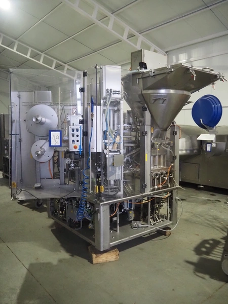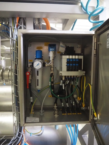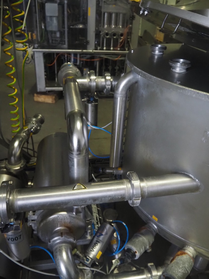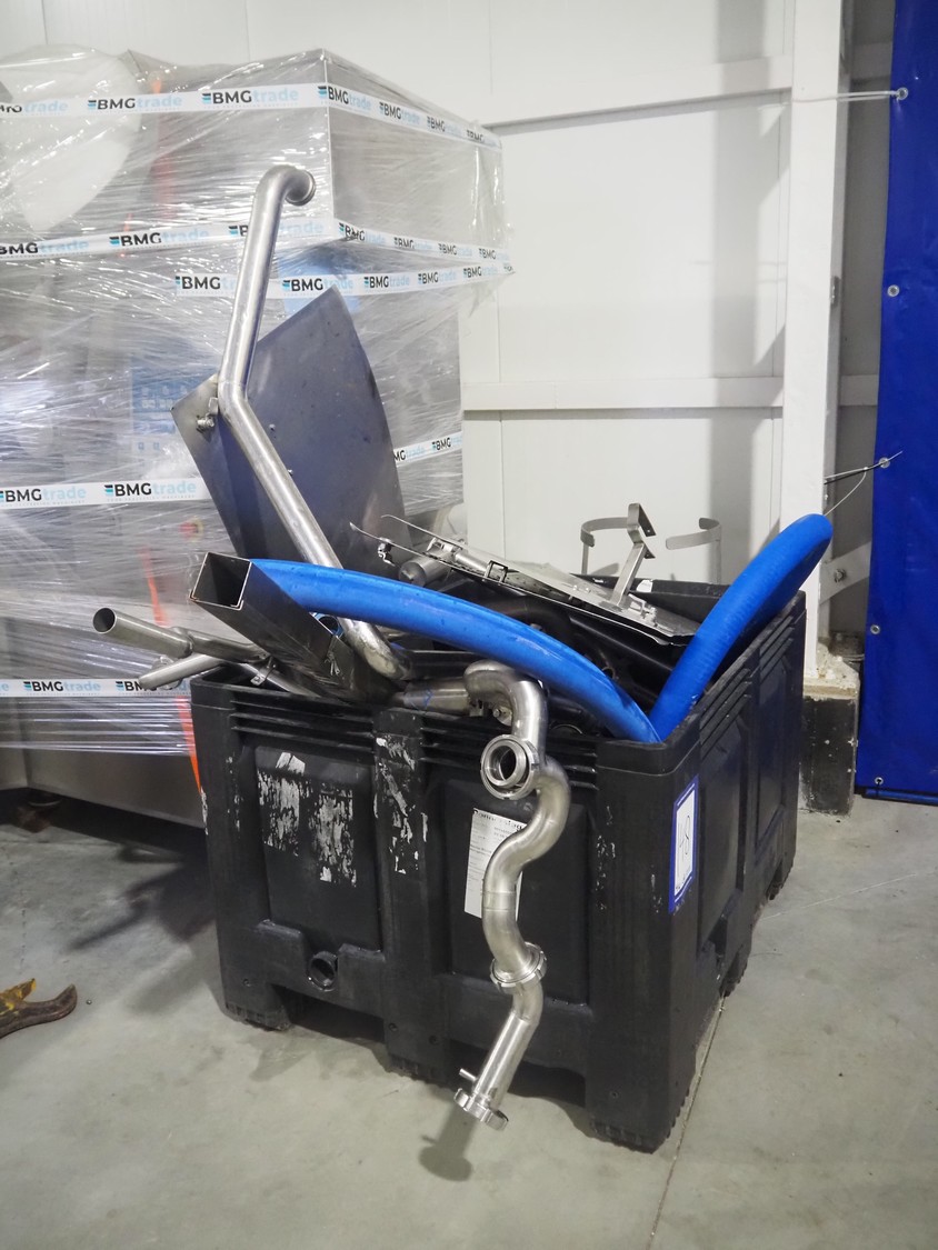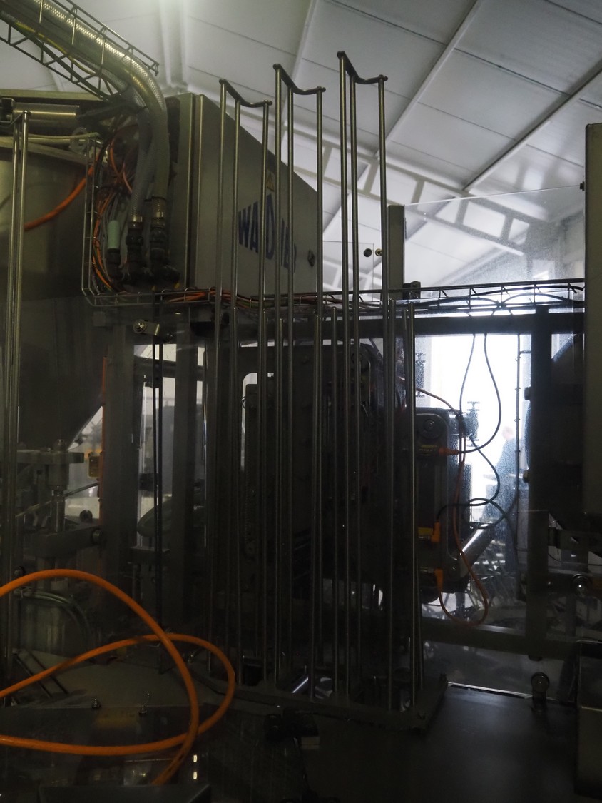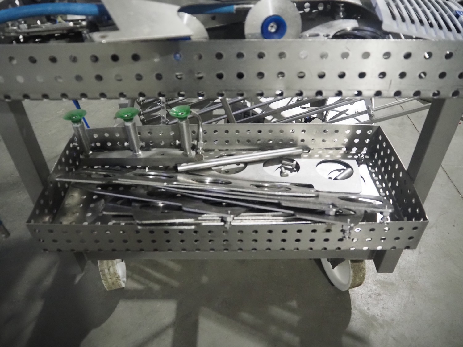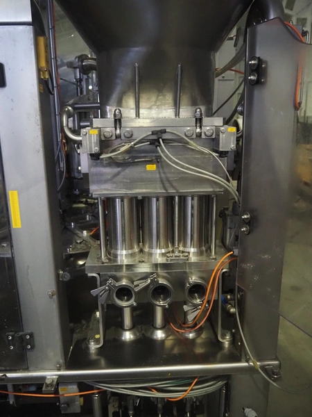 Hermann Waldner GmbH cup filling and sealing machine, type: Dosomat 2.3, serial number: 2542, year of cosntruction: 2013 , 400 V, 3 Ph, 50-60 Hz, 35 A, 24 kW, 7200 units per hour, weight: 2600 kg, dye dimensions: (3x) 100 mm x 75 mm, film width: 380 mm, total dimensions: 2400 mm x 2850 mm x 2420 mm, with CIP tank on s/s mobile frame, inside dimensions: Ø 1000 mm x 820 mm, total dimensions: 2350 mm x 1030 mm x 2300 mm. including s/s trolley with densters, dimensions: 1500 mm x 800 mm x 1050 mm, and palletbox with extra parts, dimensions: 1200 mm x 1000 mm x 1500 mm.