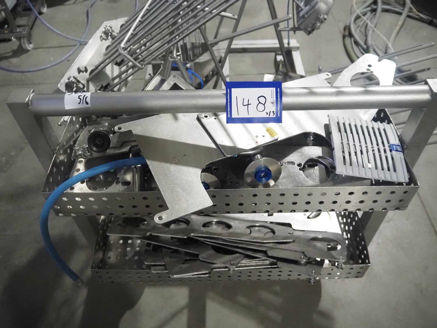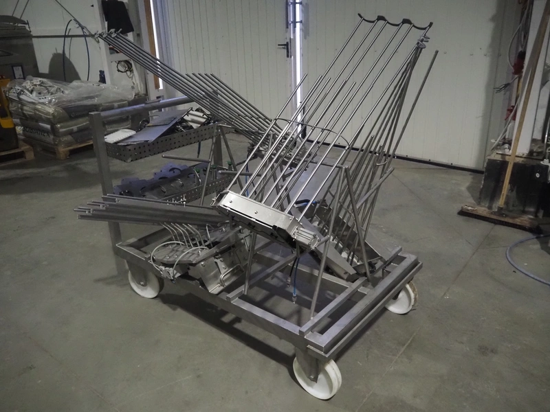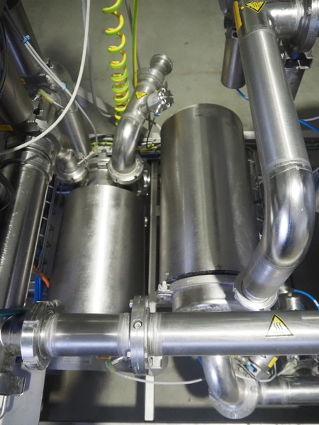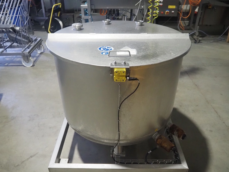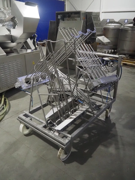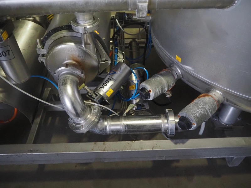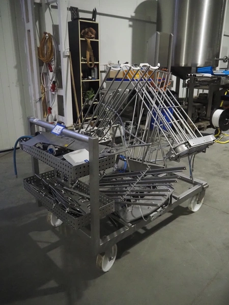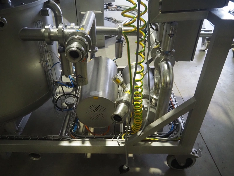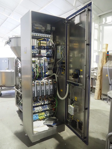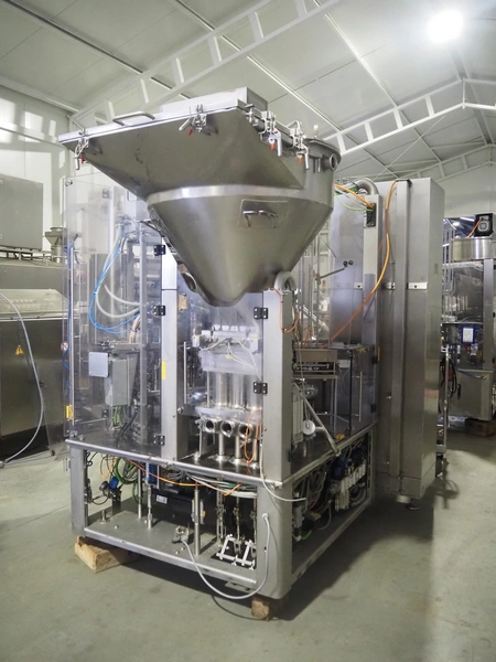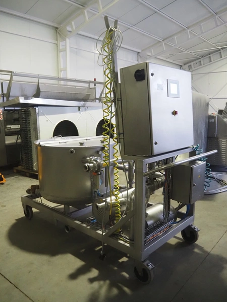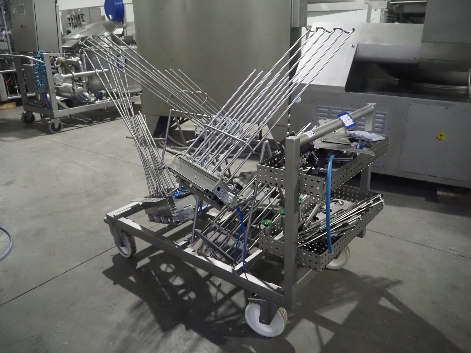 Hermann Waldner GmbH cup filling and sealing machine, type: Dosomat 2.3, serial number: 2542, year of cosntruction: 2013 , 400 V, 3 Ph, 50-60 Hz, 35 A, 24 kW, 7200 units per hour, weight: 2600 kg, dye dimensions: (3x) 100 mm x 75 mm, film width: 380 mm, total dimensions: 2400 mm x 2850 mm x 2420 mm, with CIP tank on s/s mobile frame, inside dimensions: Ø 1000 mm x 820 mm, total dimensions: 2350 mm x 1030 mm x 2300 mm. including s/s trolley with densters, dimensions: 1500 mm x 800 mm x 1050 mm, and palletbox with extra parts, dimensions: 1200 mm x 1000 mm x 1500 mm.