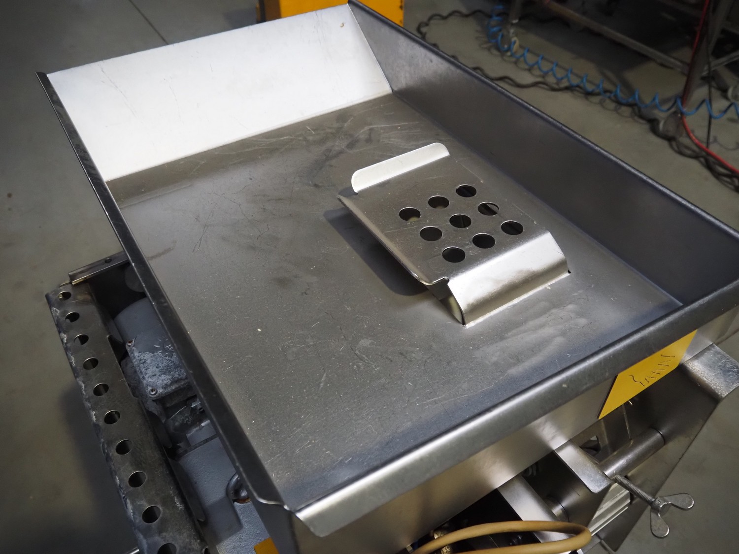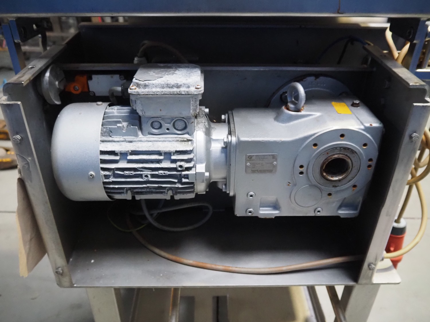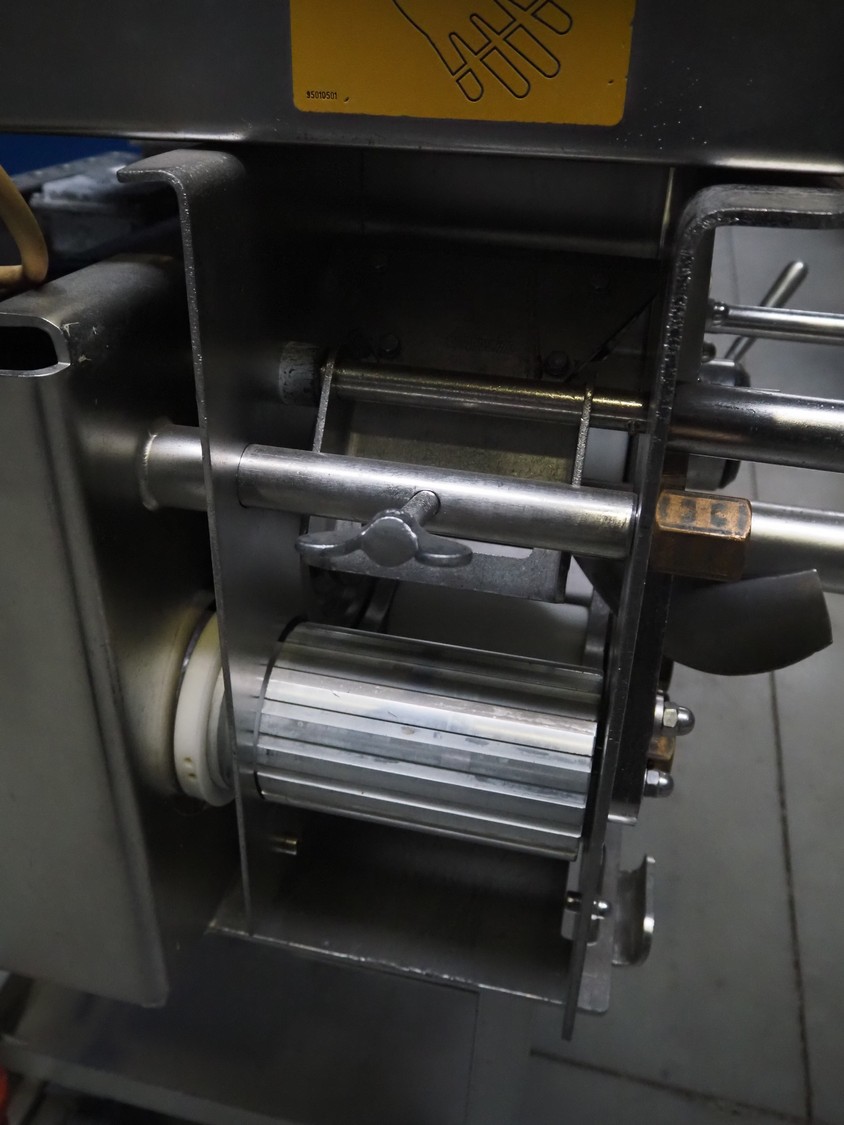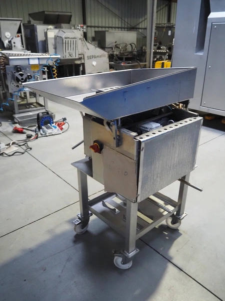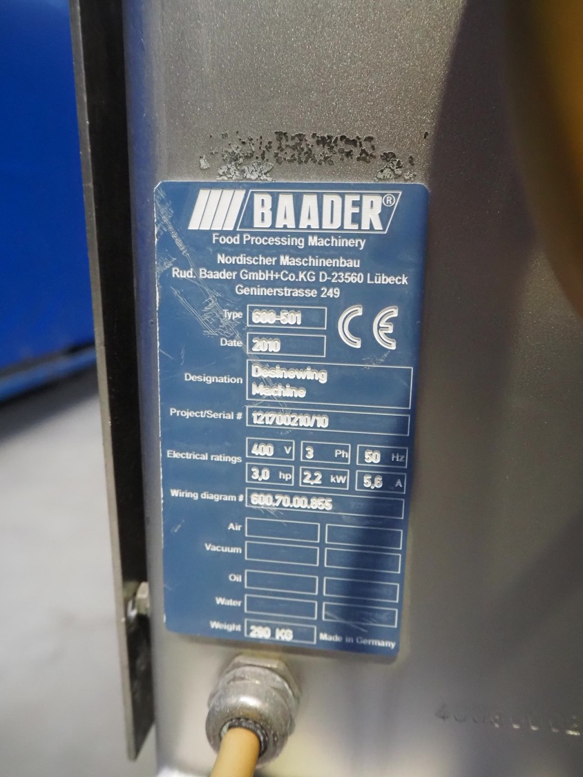 Baader mobile separator, type: 600-501, serial number: 121700210/10, year of construction: 2010, 400 V, 3 Ph, 50 Hz, 5.6 A, 2.2 kW, weight: 290 kg, drum diameter: 210 mm, belt width: 180 mm, total dimensions: 1050 mm x 900 mm x 1270 mm. Incomplete, no belt and no drum.