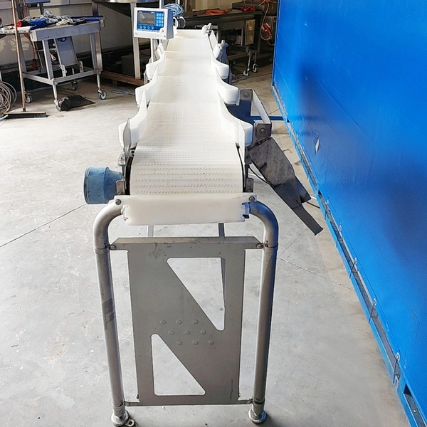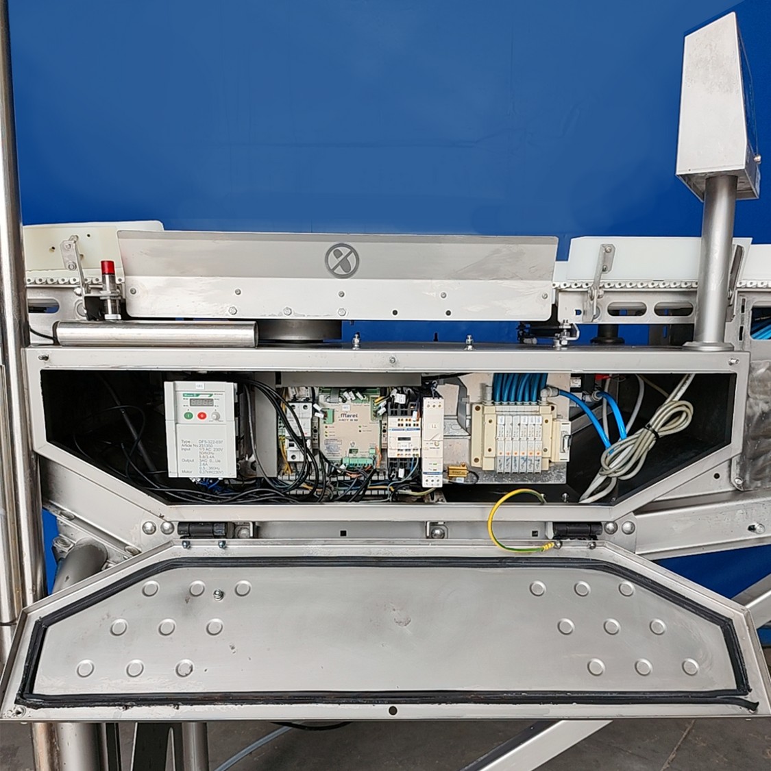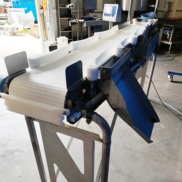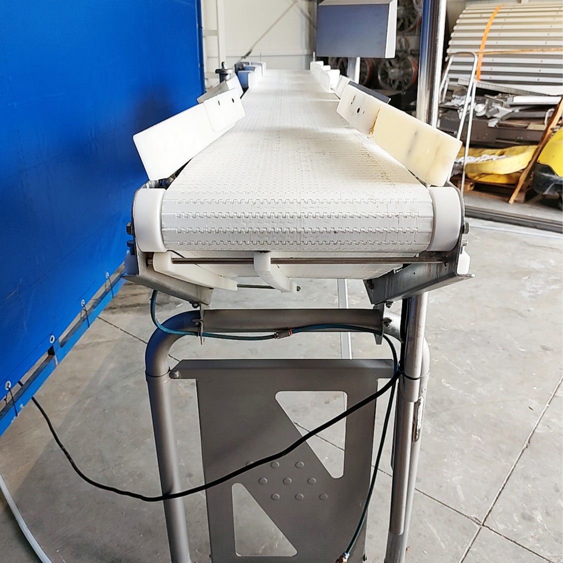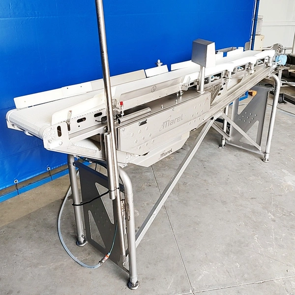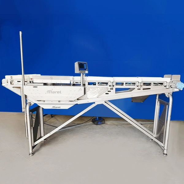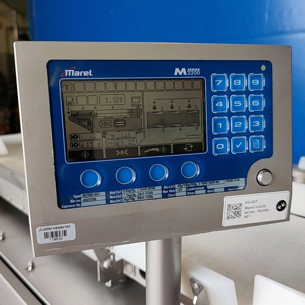 Marel grader, type: M2200-A01, serial number: A025708, max weight: 0.6/1.5/3 kg, min weight: 40/100/200g, plastic mesh belt, belt width: 305 mm, 6 rejecters, total dimensions: 2900 mm x 850 mm x 1600 mm.