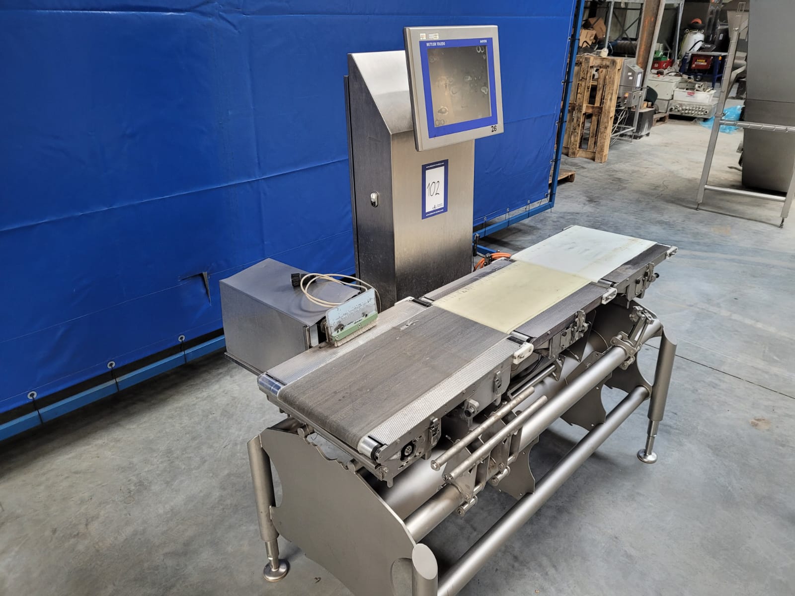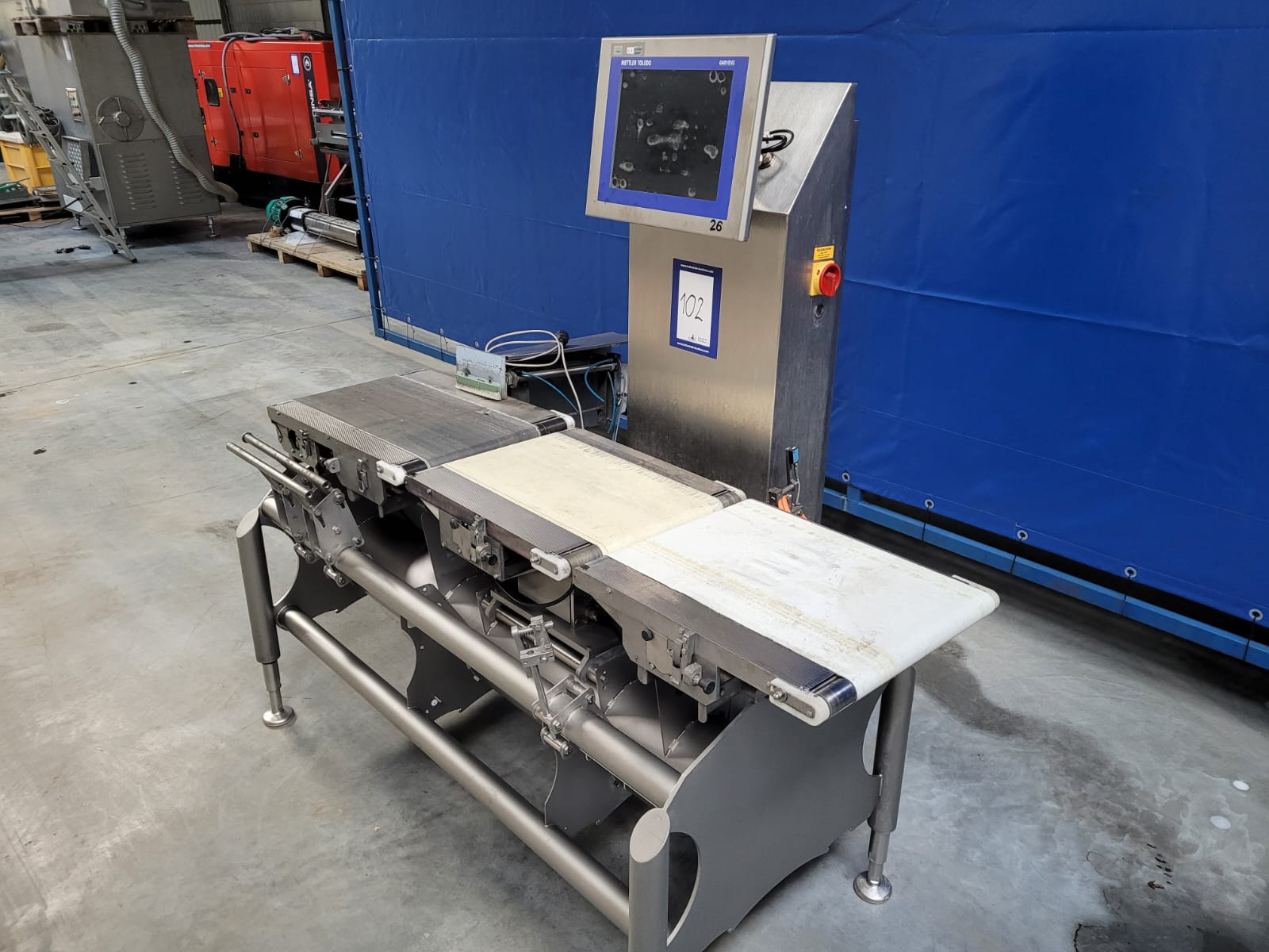 Mettler-Toledo Garvens GmbH checkweigher with rejector, type: XS 3, serial number: 35001001, 100/240 V, 50/60 Hz, year of construction: 2008, maximum capacity: 2500 g, minimum capacity: 300 g, e= 0.5 g, d= 0.5 g, plastic belts, belt width: 380 mm, total dimensions: 1700 mm x 1000 mm x 1700 mm.