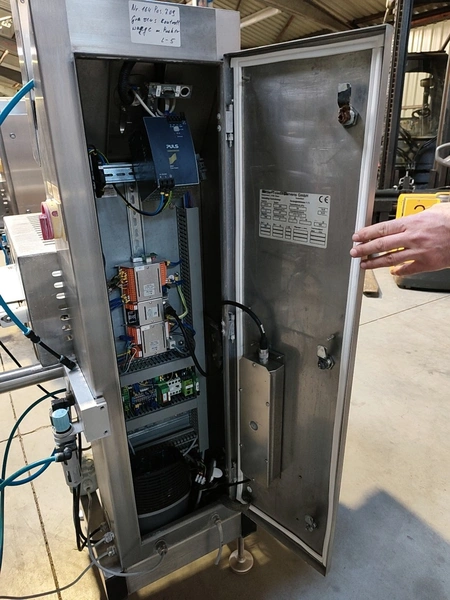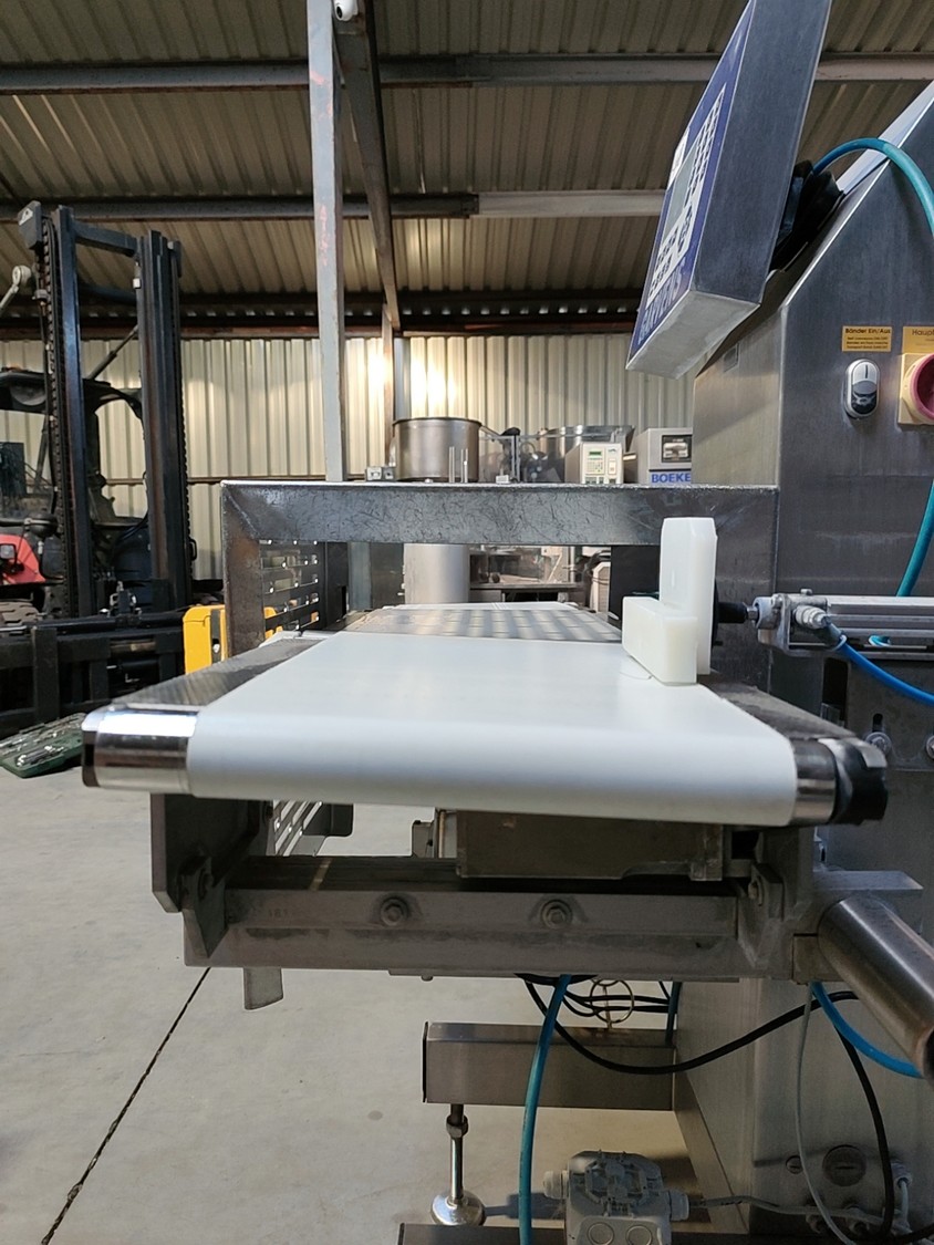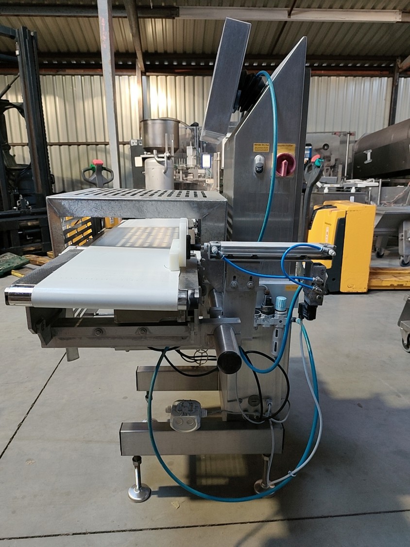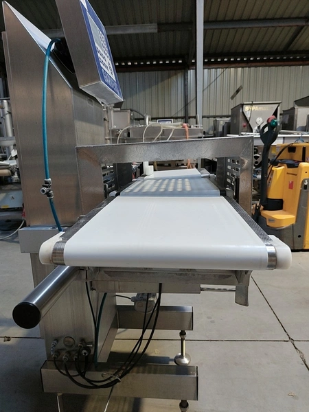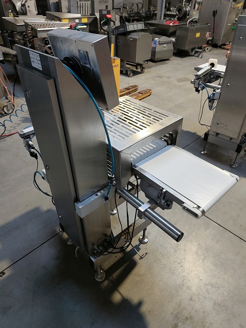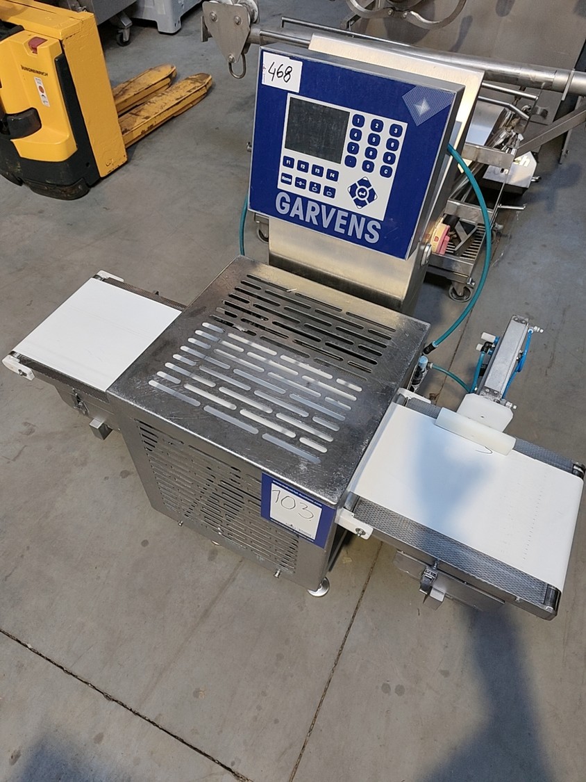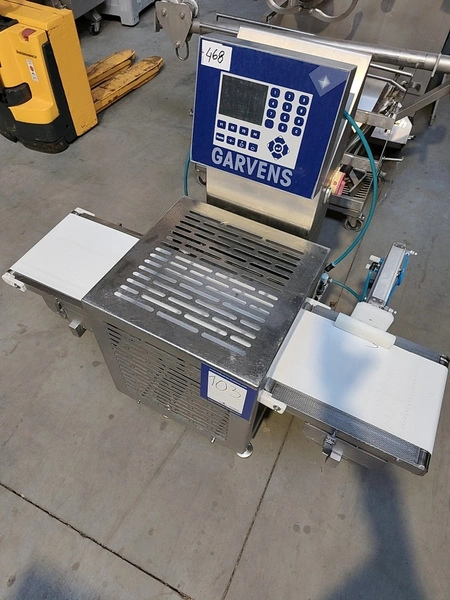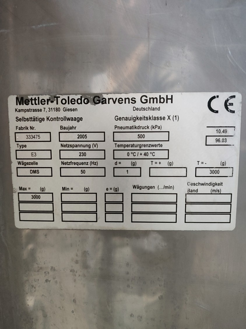 Garvens Automation GmbH checkweigher with rejectior, model E3, serial number: 333475, year of construction: 2005, 230 V, 50 Hz, weigher DMS, maximum load: 3000 g, dimensions: 1400 mm x 800 mm x 1550 mm.