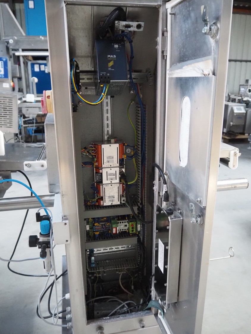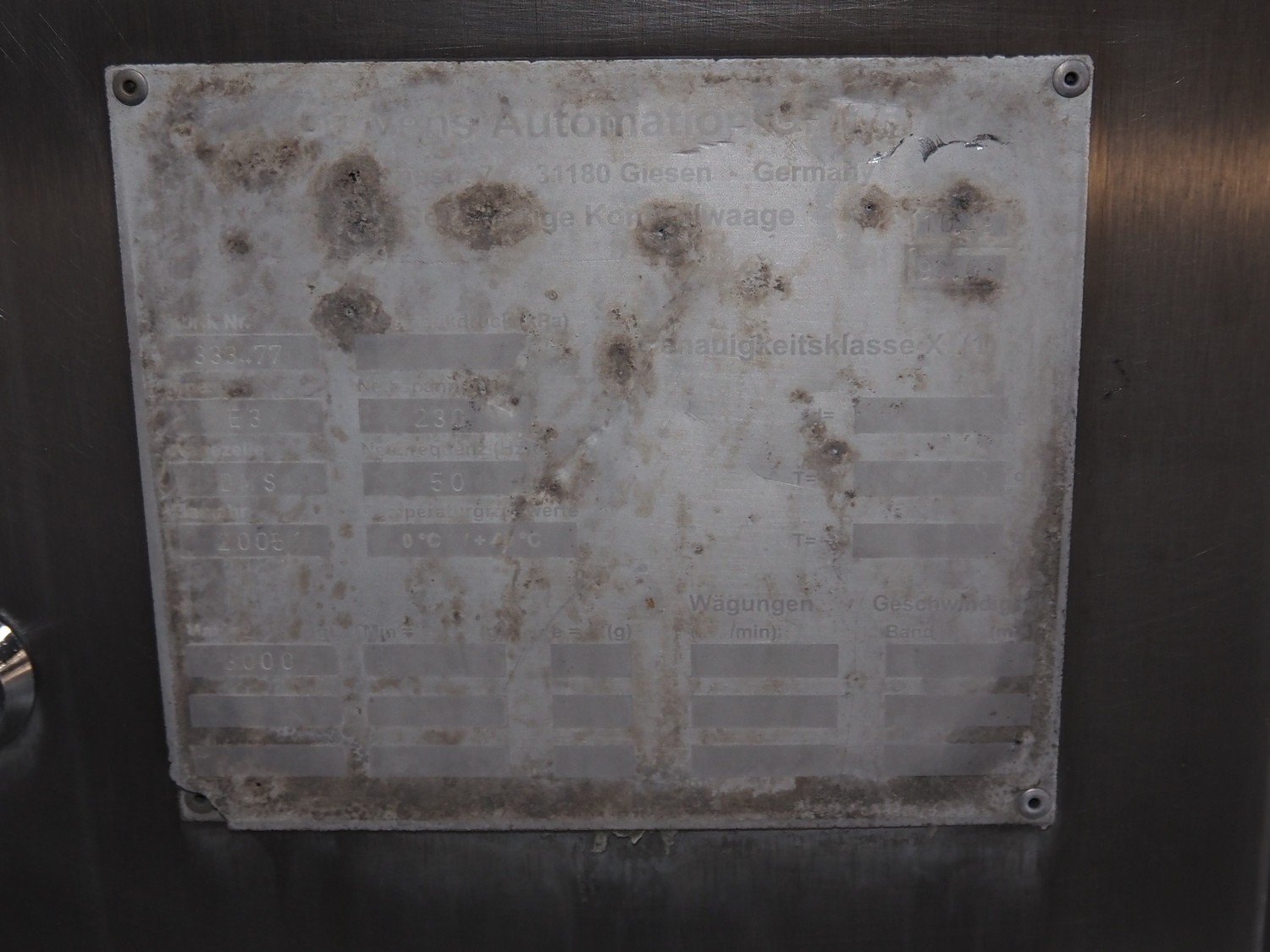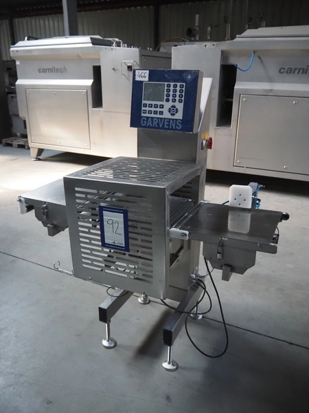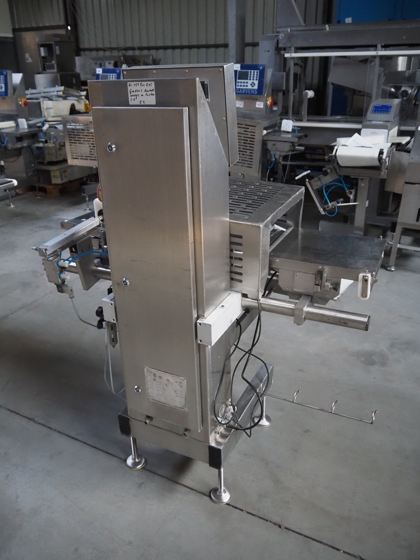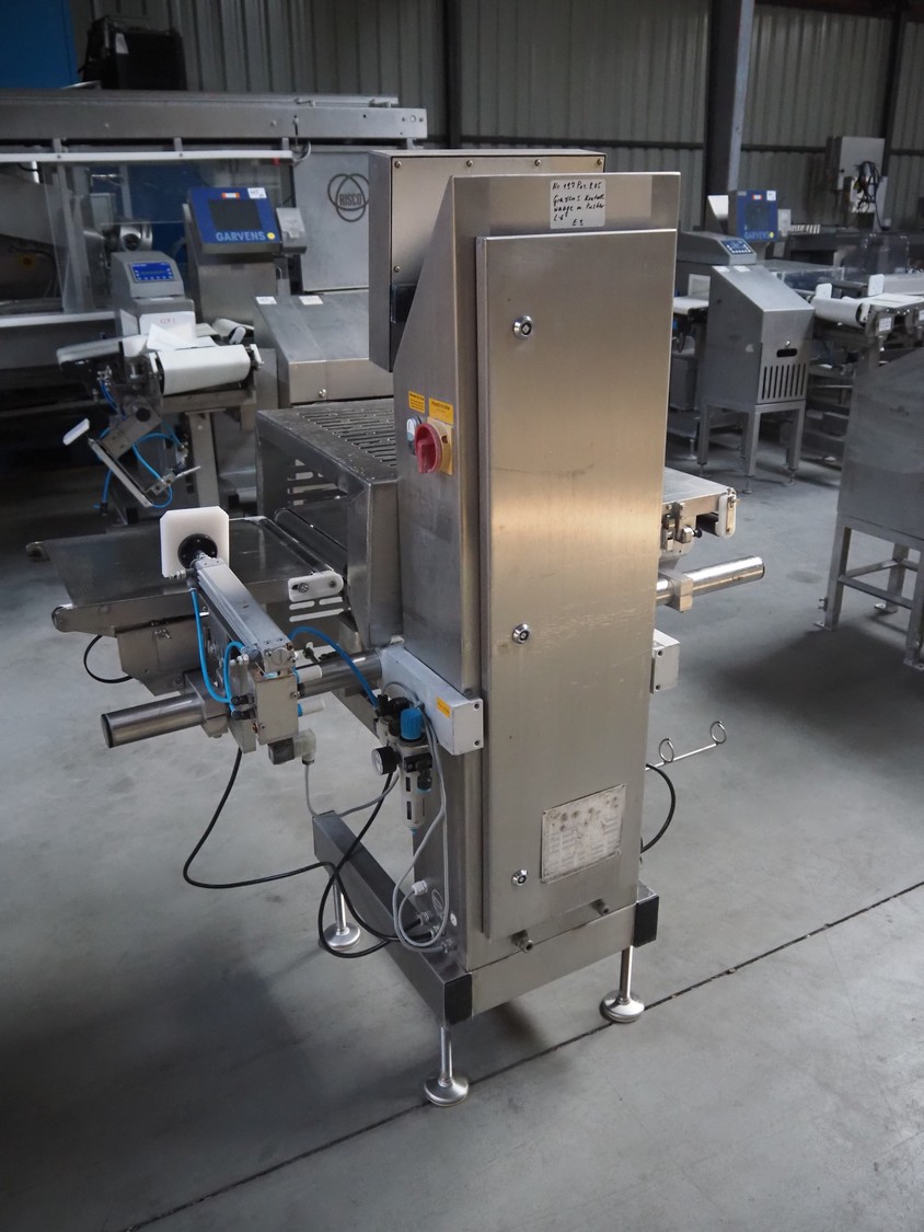 Garvens Automation GmbH checkweigher with rejector, type: E3, machine number: 333.77, year of construction: 2005, maximum capacity: 3000 mg, plastic belt, belt width: 300 mm, clearance: 150 mm x 380 mm, total dimensions: 1350 mm x 850 mm x 1600 mm. Missing belts.