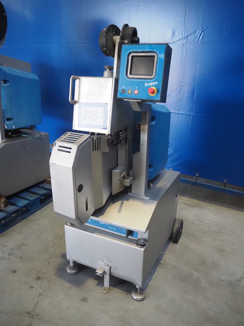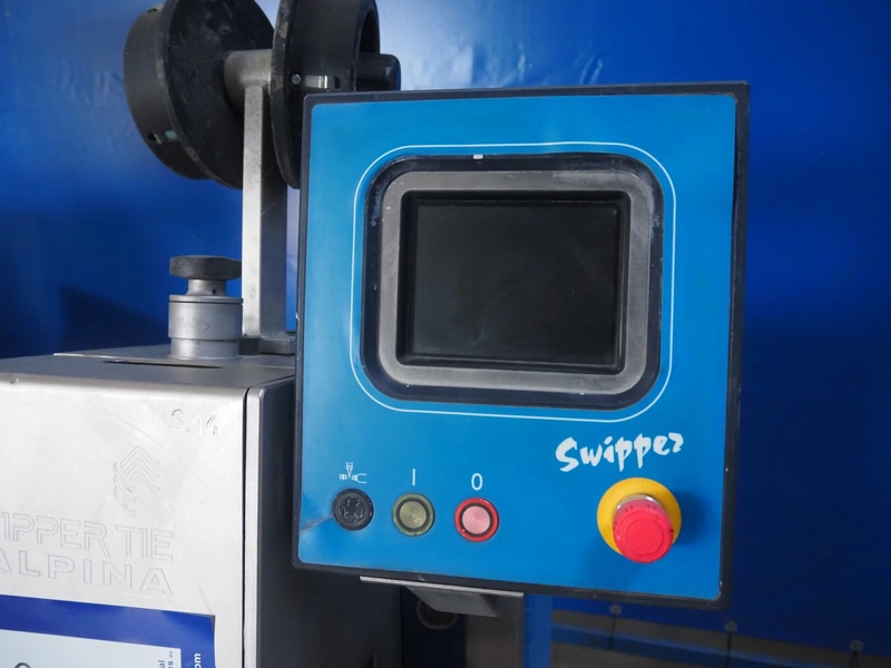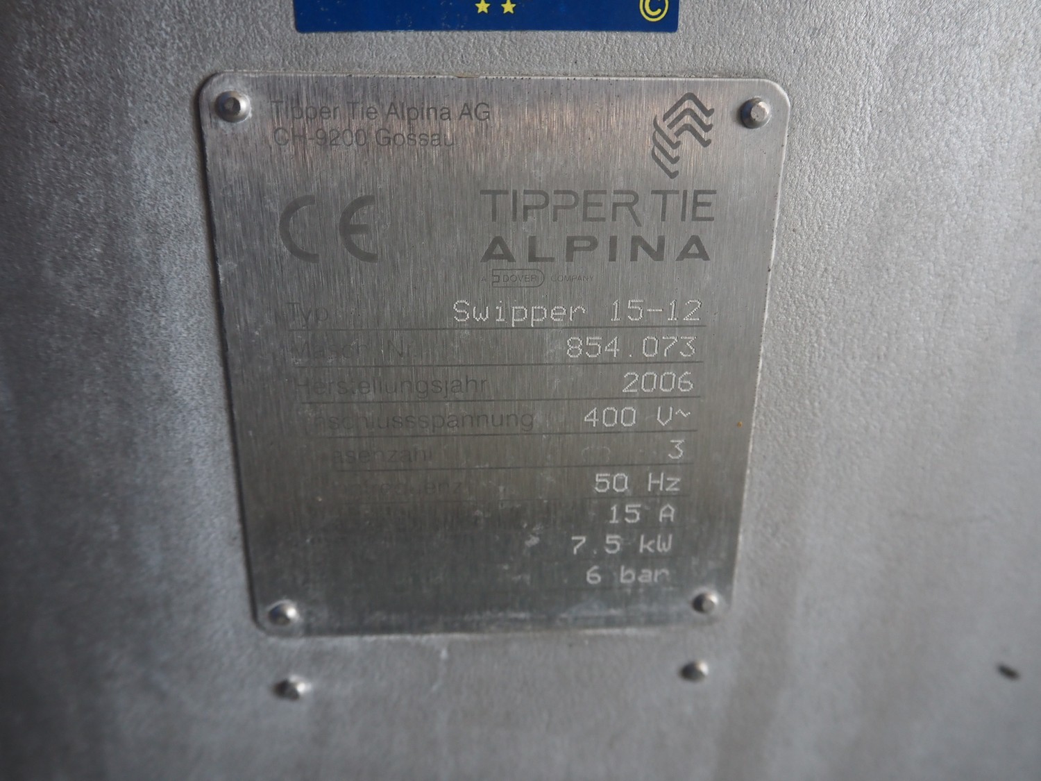 Tipper Tie Alpina automatic double clipper, type: Swipper 15-12, serial number: 854.073, year of construction: 2006, 400 V, 3 Ph, 50 Hz, 15 A, 7.5 kW, 6 bar, dimensions: 980 mm x 750 mm x 1740 mm. Technical condition unknown.