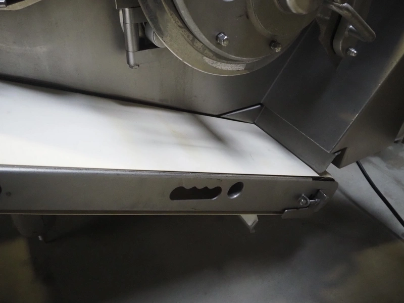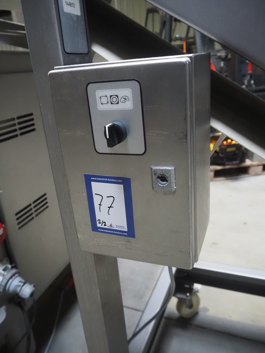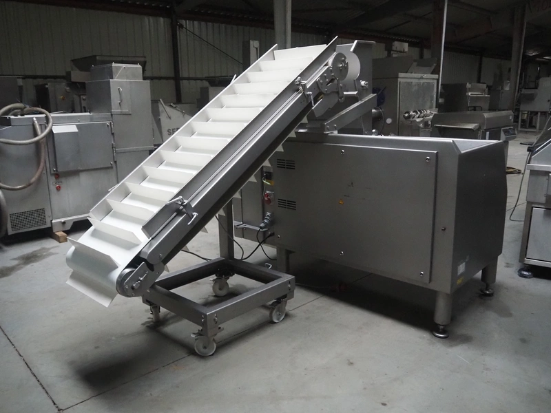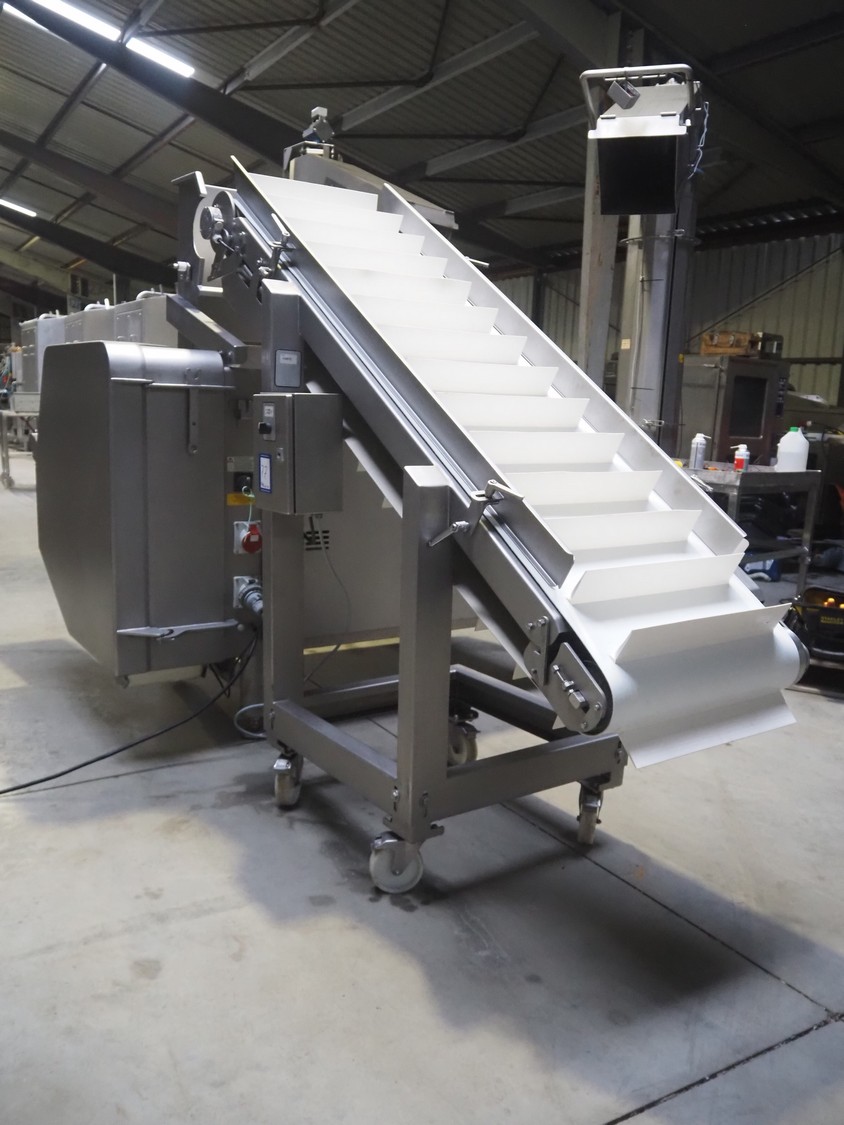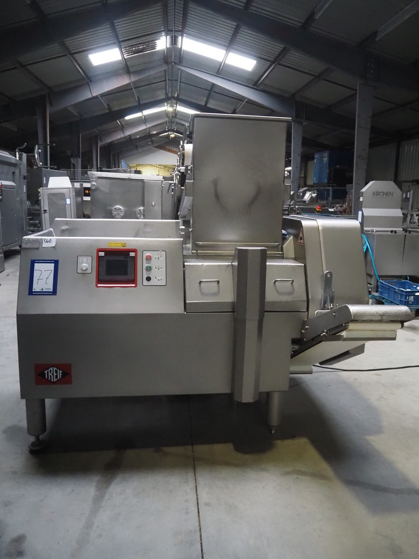 Treif Maschinenbau GmbH dicer, model: Twister G, serial number: 412605.77551.108141, year of construction: 2010, 380-480 V, 3 Ph, 50/60 Hz, 6 / 8.16 kW, chamber dimensions: 120 mm x 120 mm, plastic outfeed belt, belt width: 245 mm, total dimensions: 2000 mm x 1750 mm x 1820 mm, with mobile elevating belt, plastic belt, belt width: 560 mm, divider width: 480 mm, divider height: 85 mm, distance between dividers: 140 mm, elevating height: 1100 mm, total dimensions: 1900 mm x 800 mm x 1900 mm.