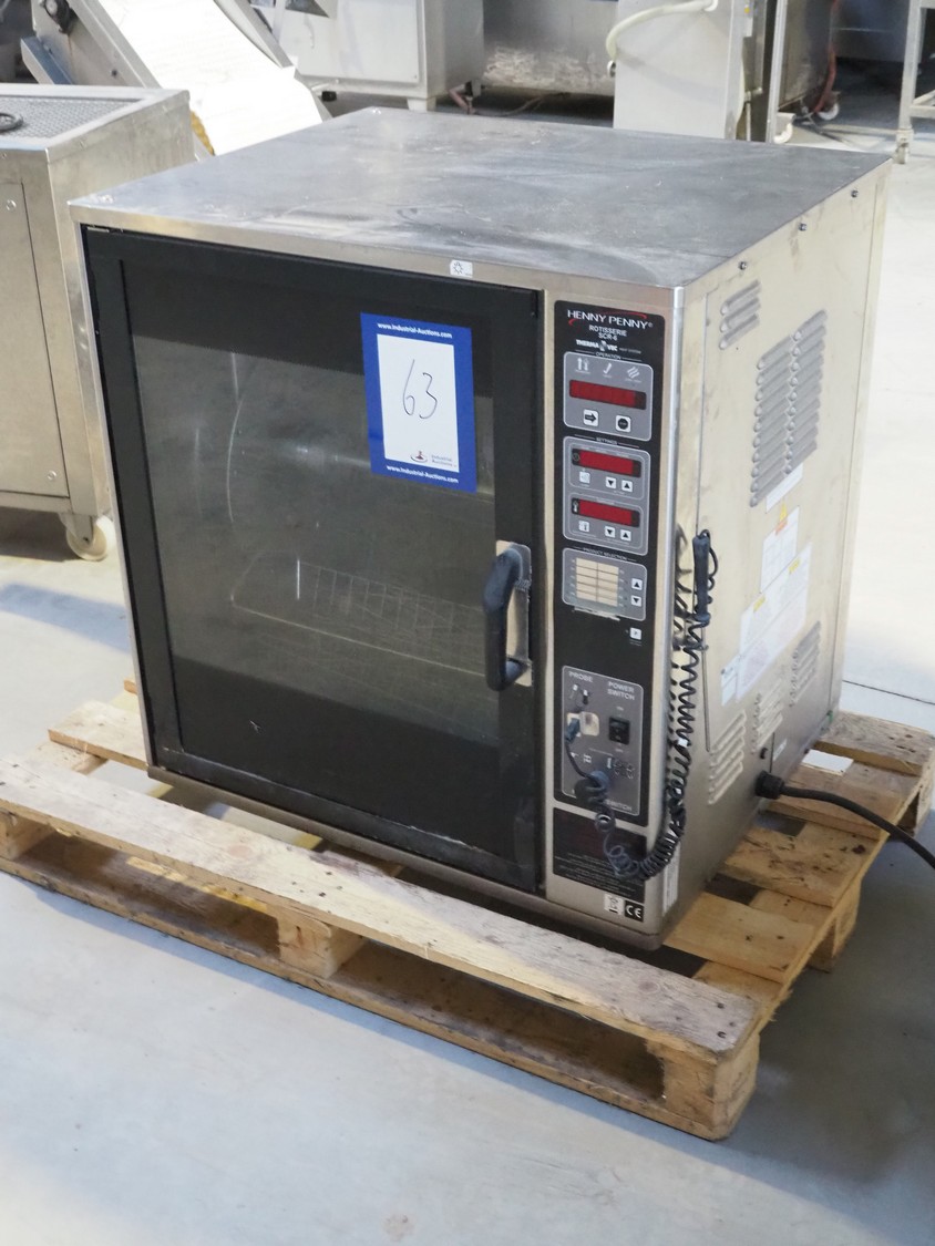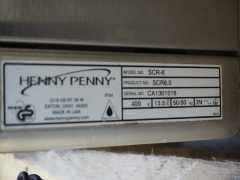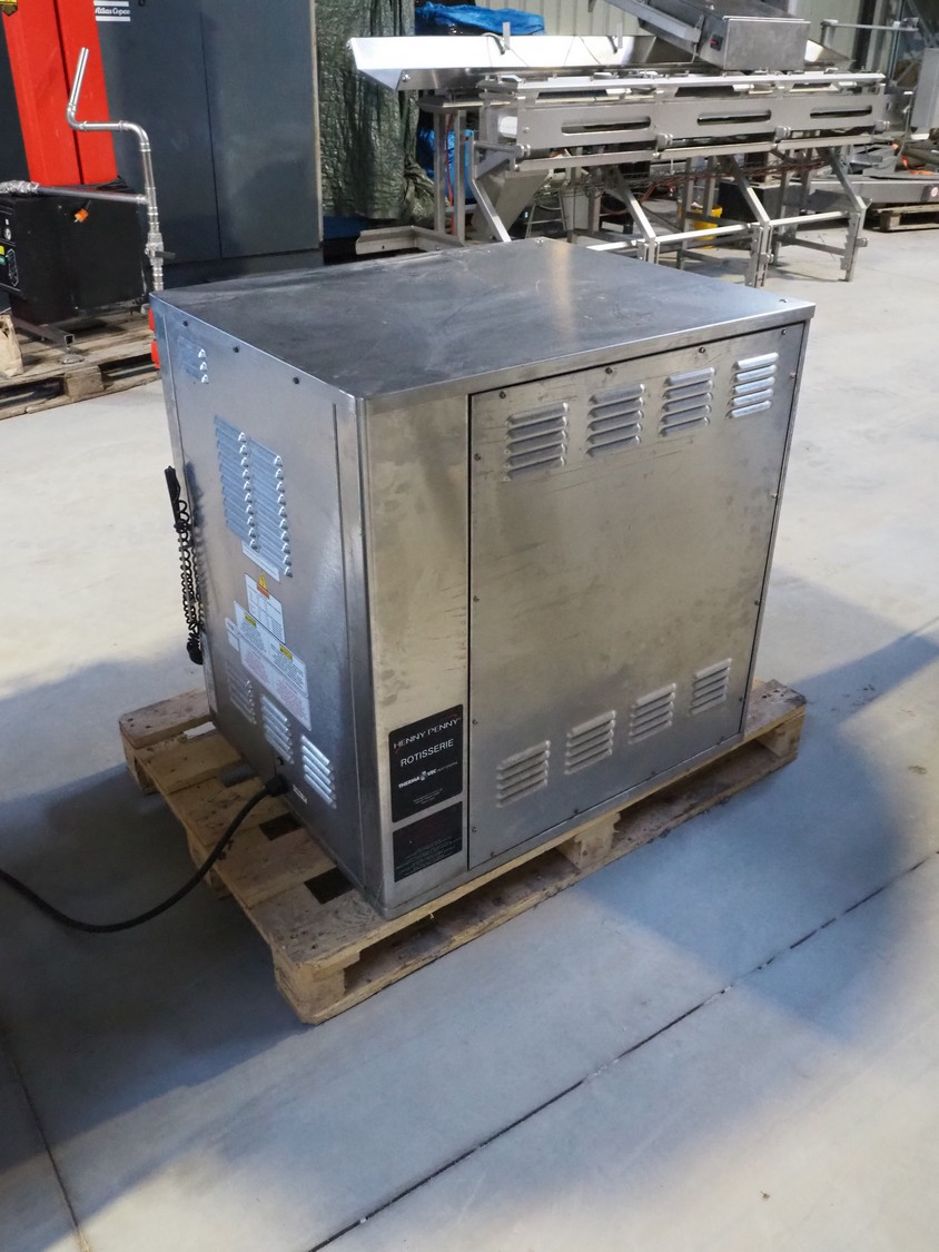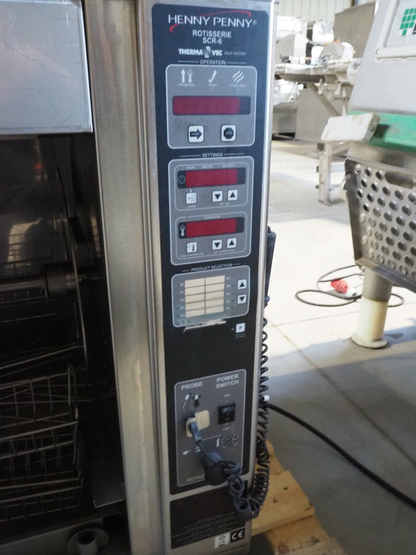 Henny Penny rotisserie chicken grill, model: SCR-6, serial number: CA1301016, 400 V, 3 Ph, 50/60 Hz, 13.5 A, dimensions: 820 mm x 700 mm x 840 mm.