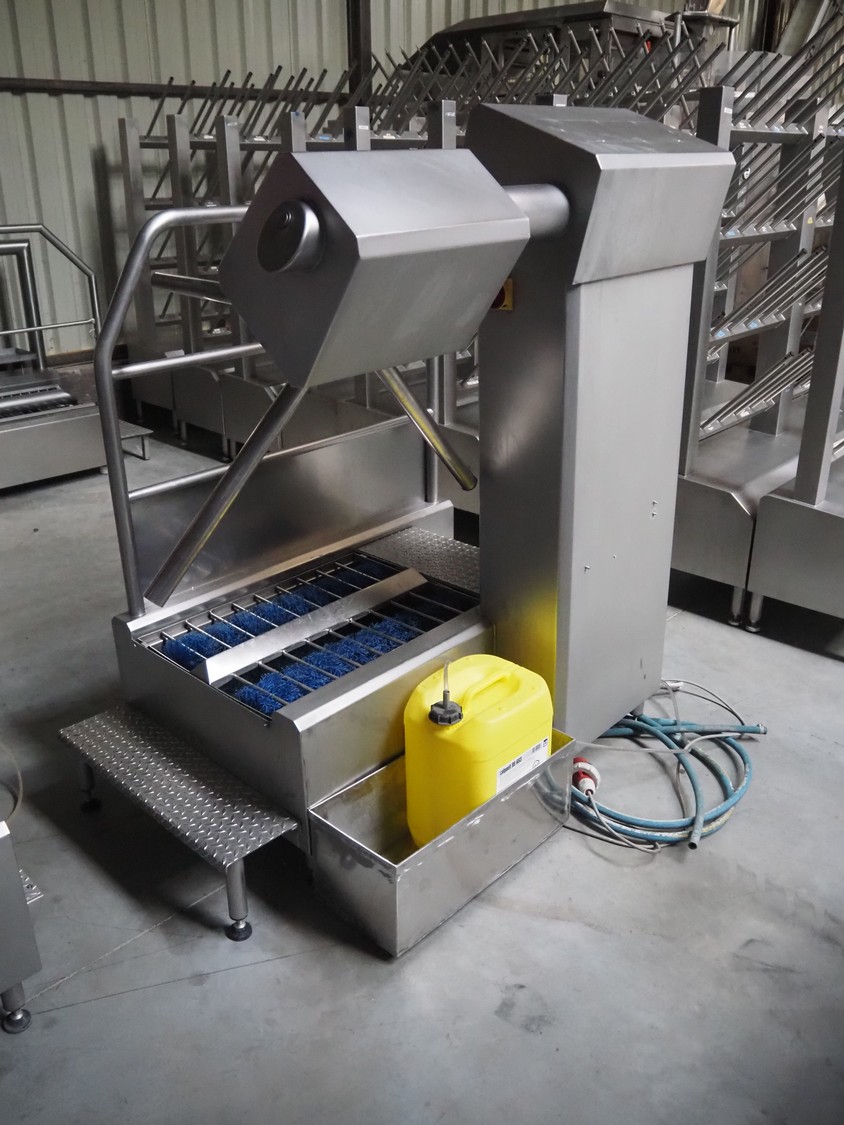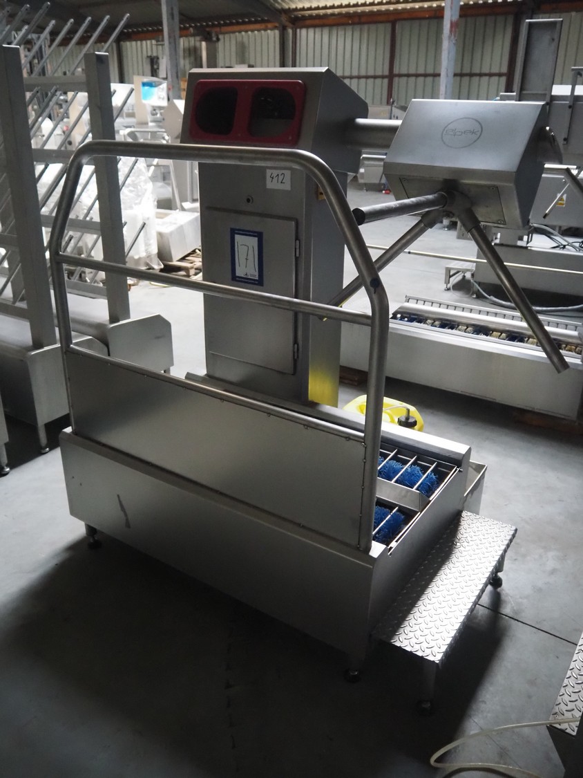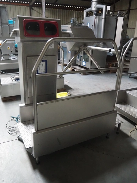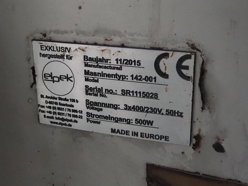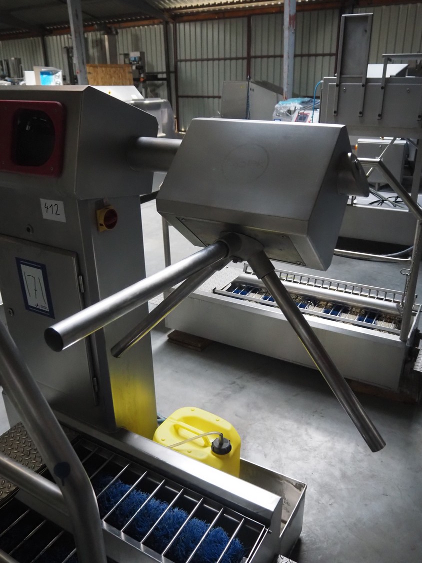 Elpek hygiene station with sole cleaner, hand disinfection and tourniquet, type: 142-001, serial number: SR1115028, year of construction: 11/2015, 230/400 V, 3 Ph, 50 Hz, 500 W, brush length: (2x) 700 mm, total dimensions: 1500 mm x 1000 mm x 1640 mm.