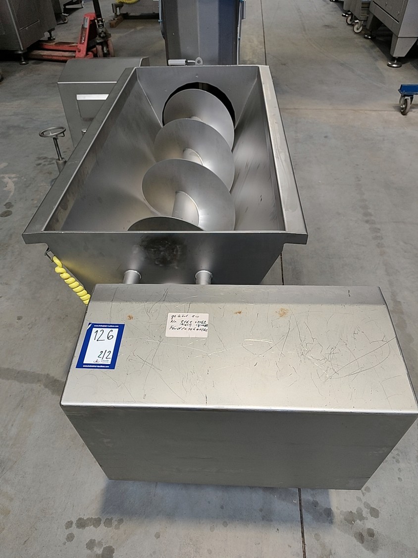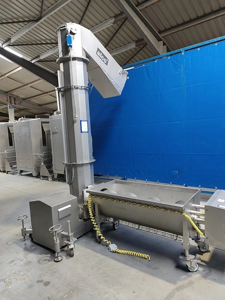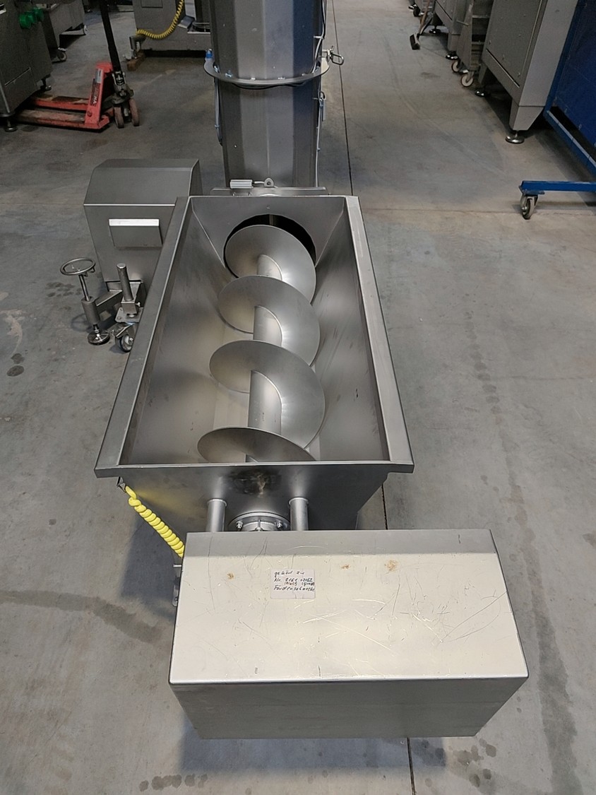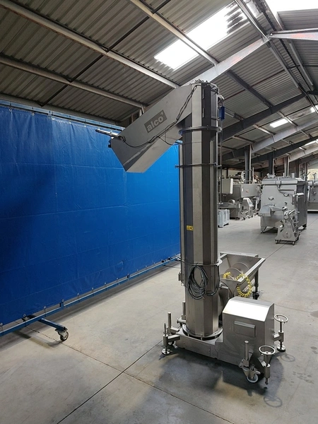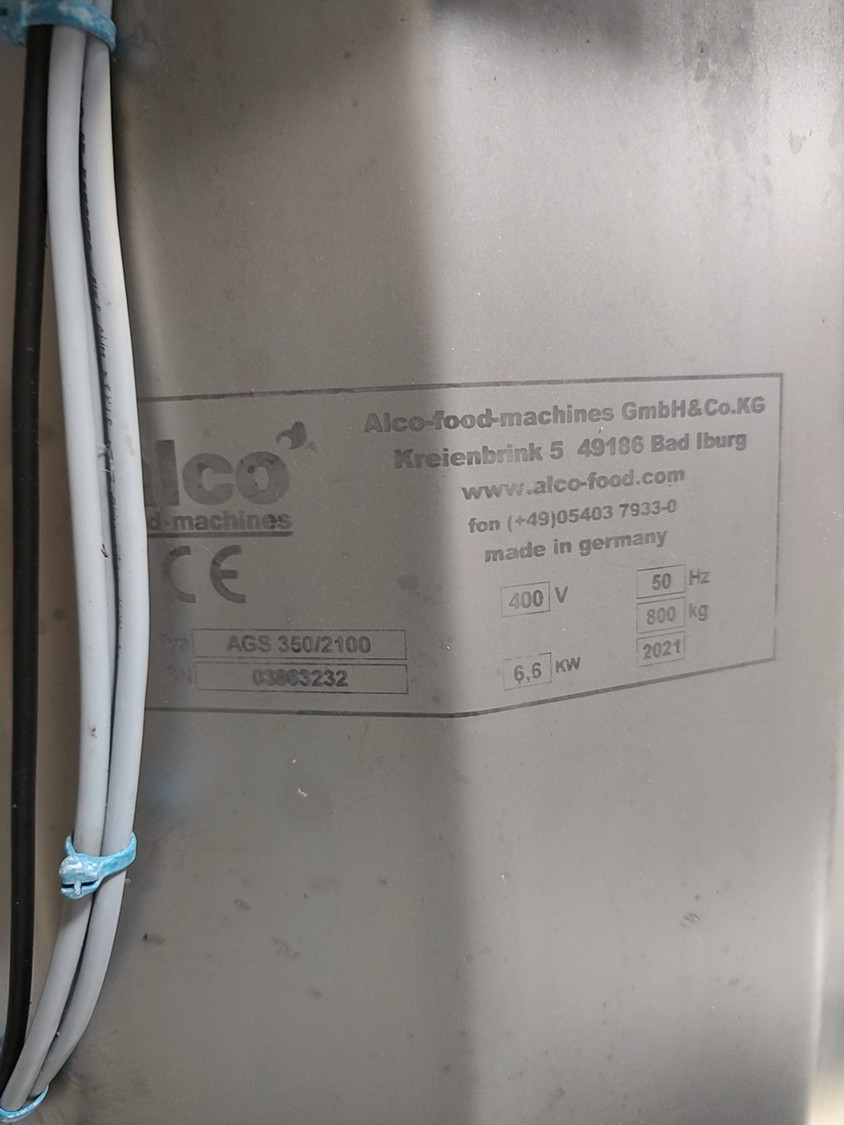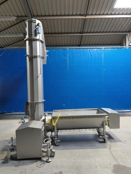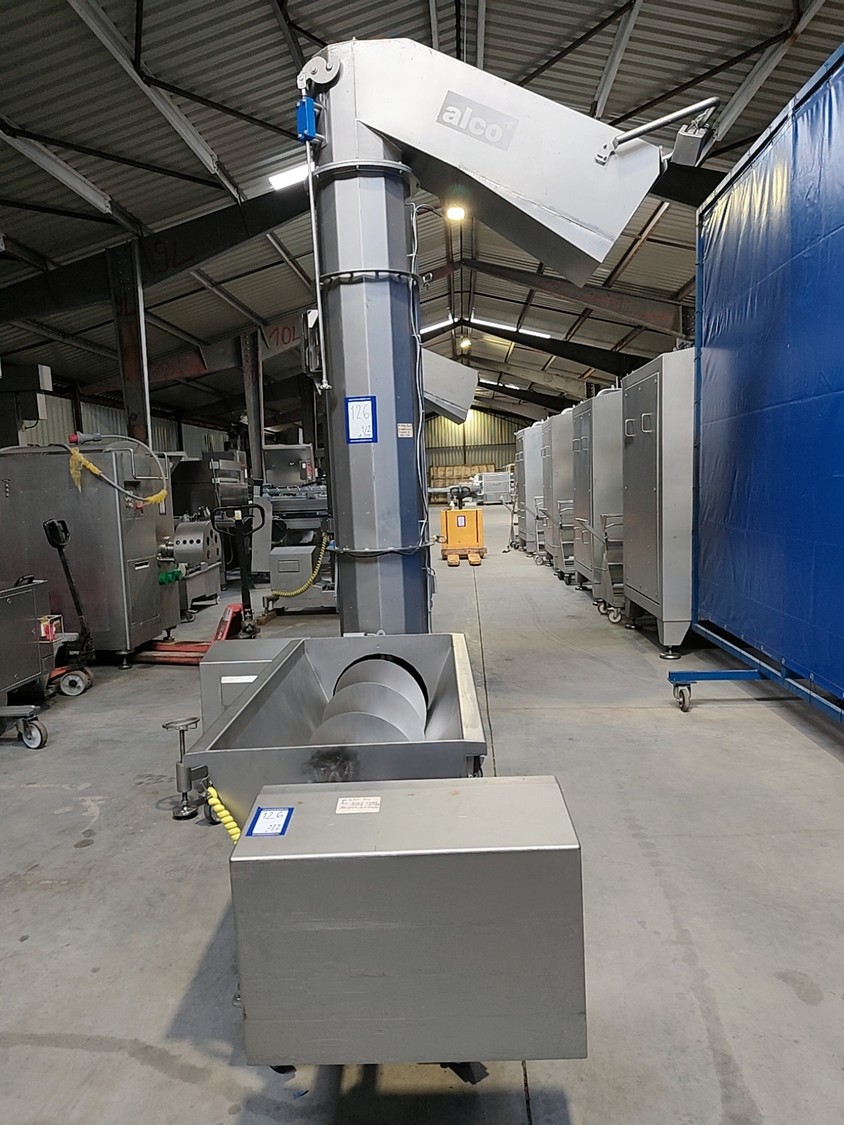 Alco infeed bunker with elevating screw, model: AGS 350/2100, serial number: 03863232, year of construction: 2021, 400 V, 50 Hz, 6.6 kW, weight: approx. 800 kg, elevating height: 1950 mm, total dimensions: 2700 x 2300 x 3200 mm.
