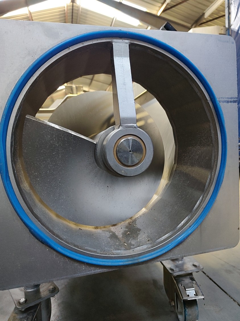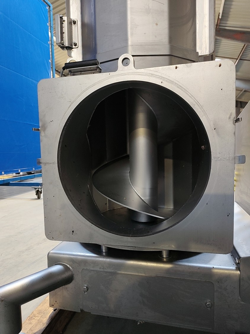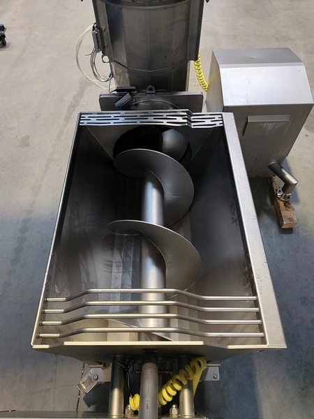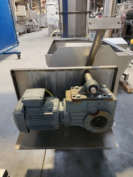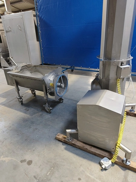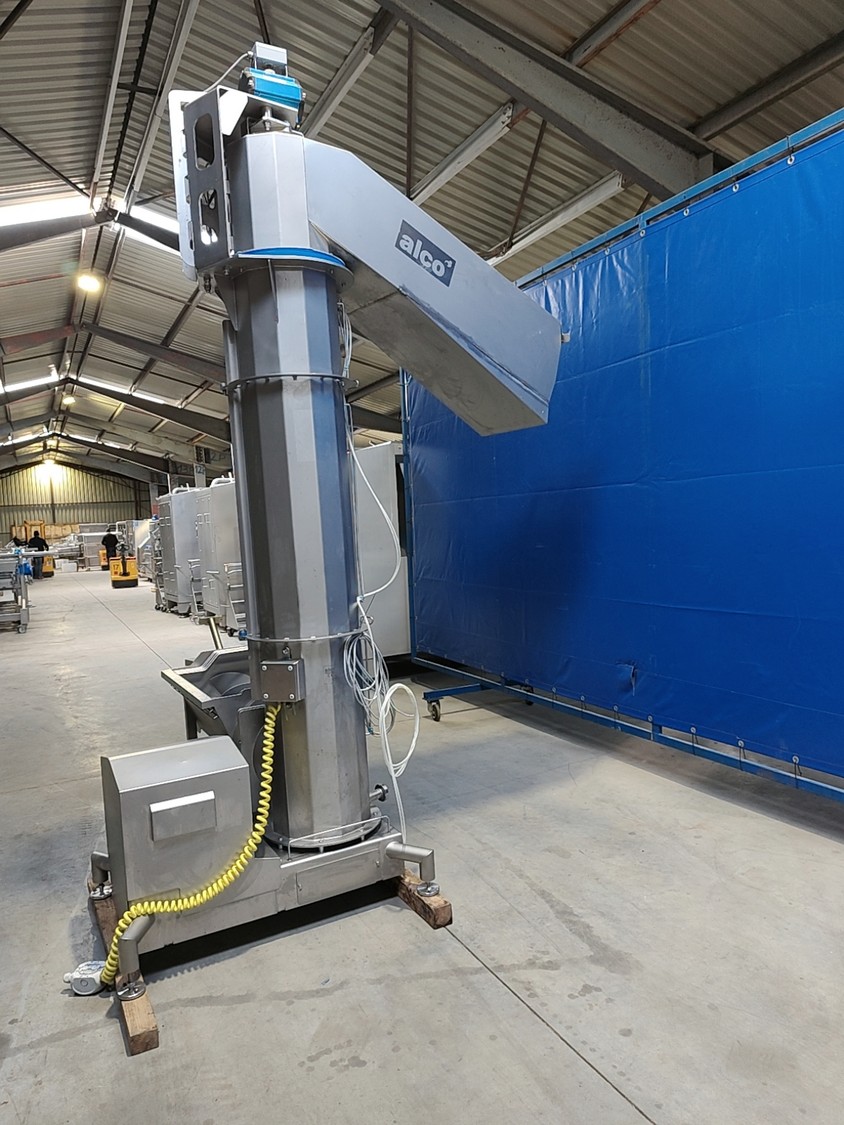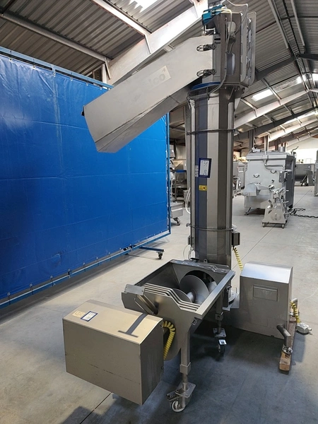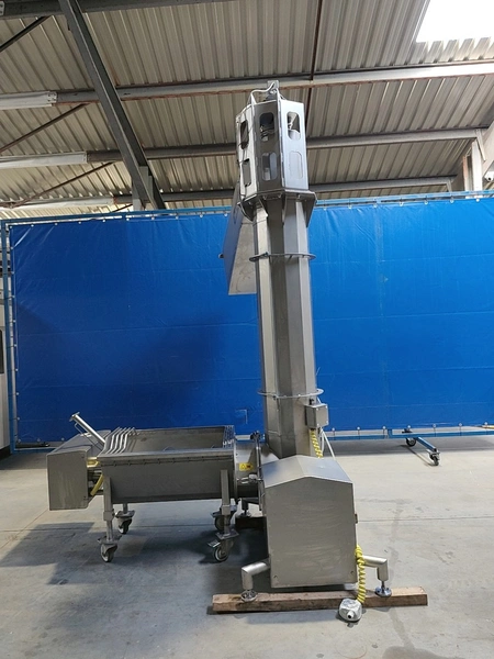 Alco infeed bunker with elevating screw, weight: approx. 800 kg, elevating height: 1950 mm, total dimensions: 2300 x 2300 x 3400 mm.