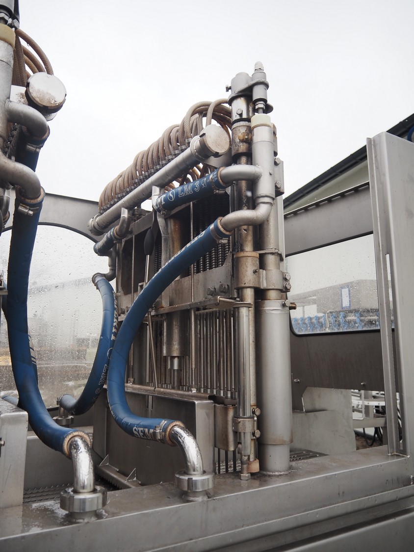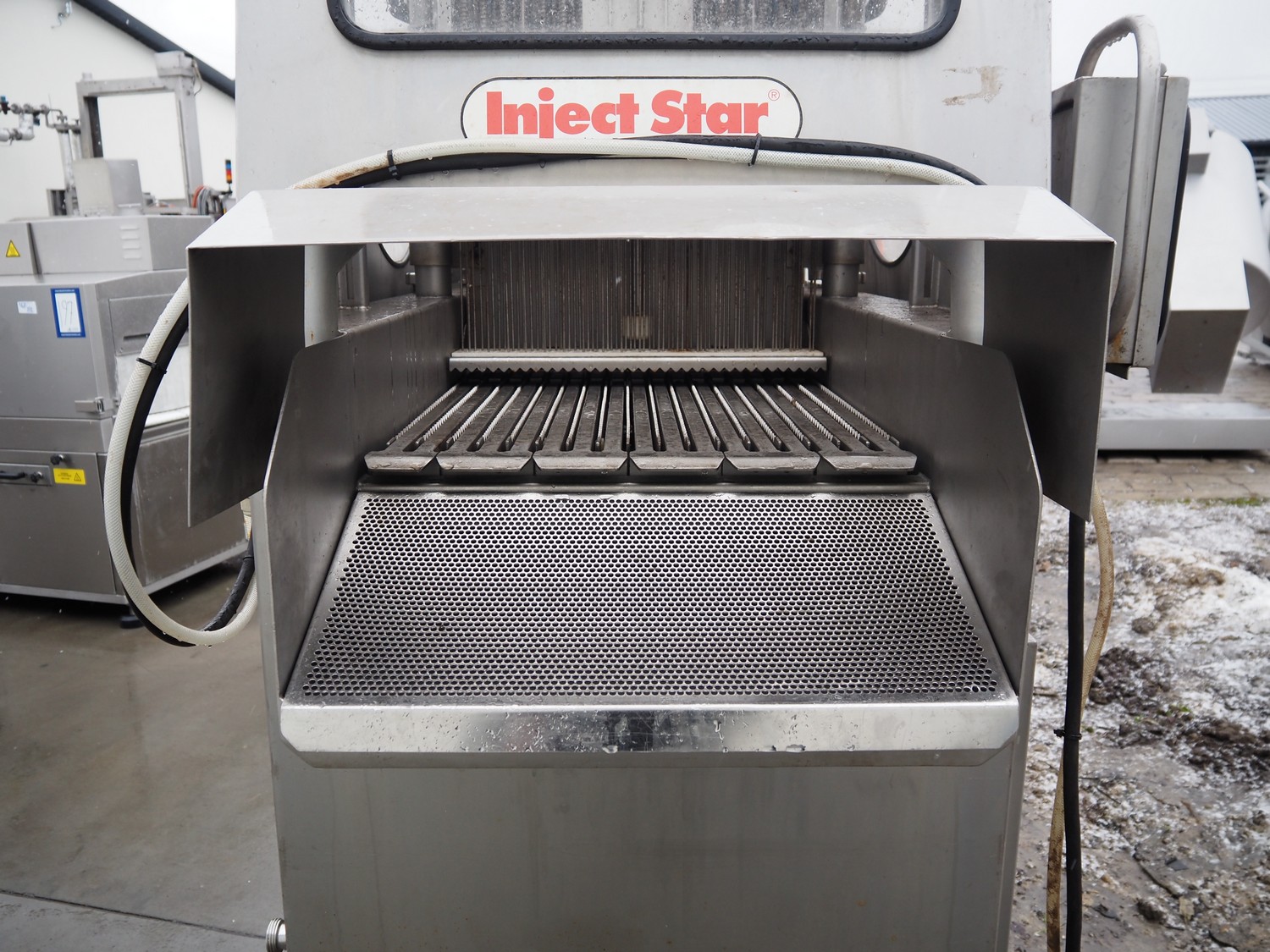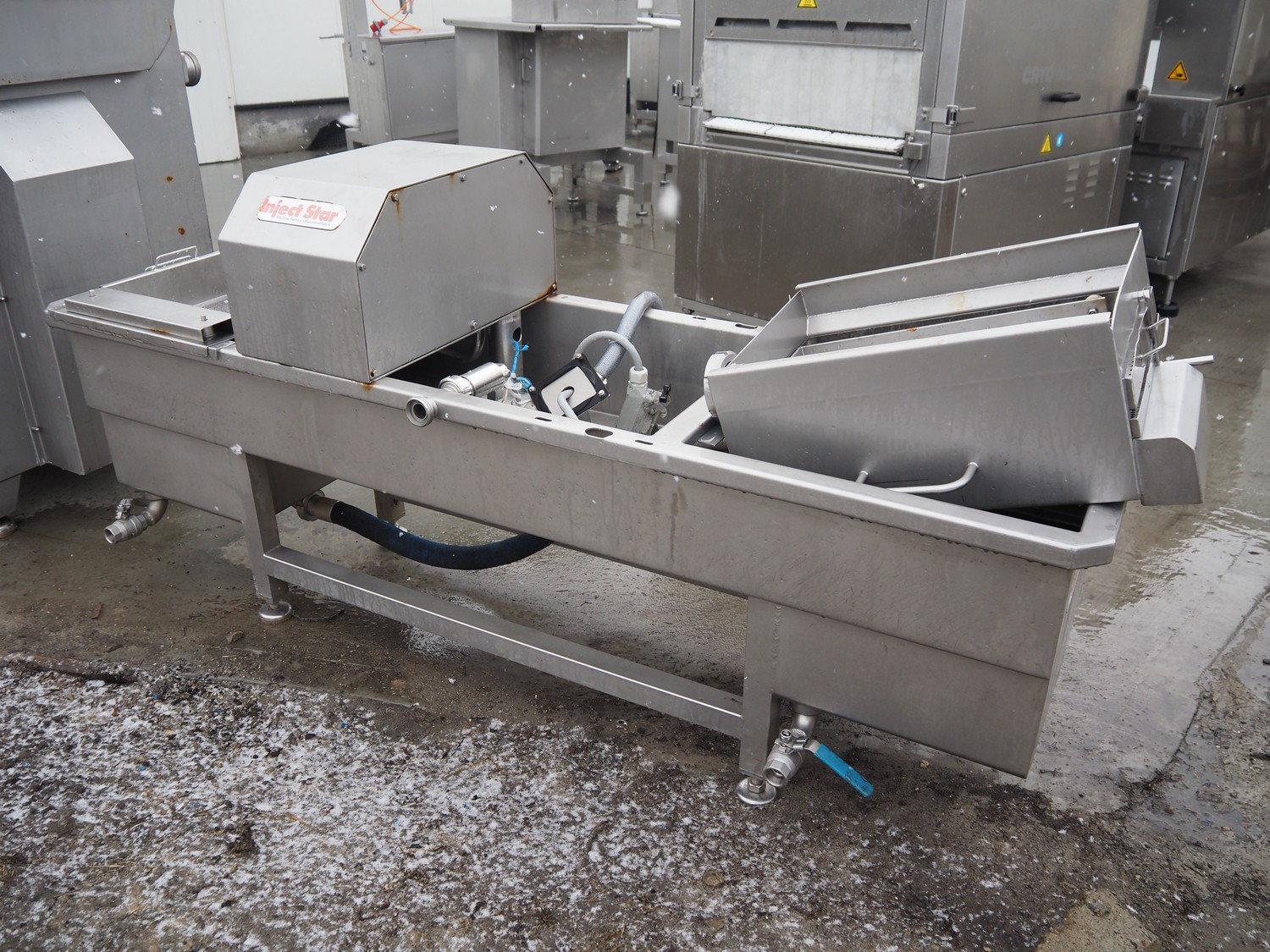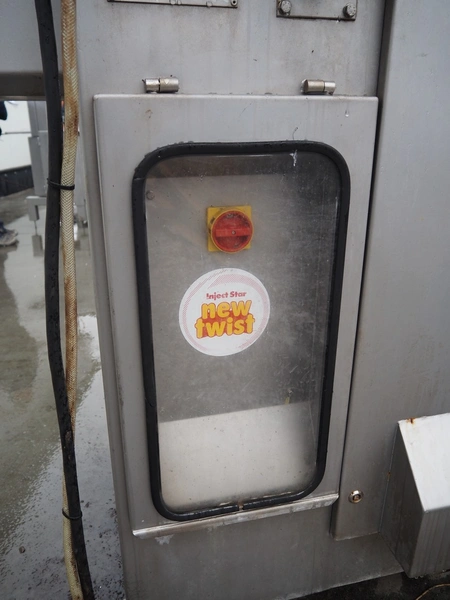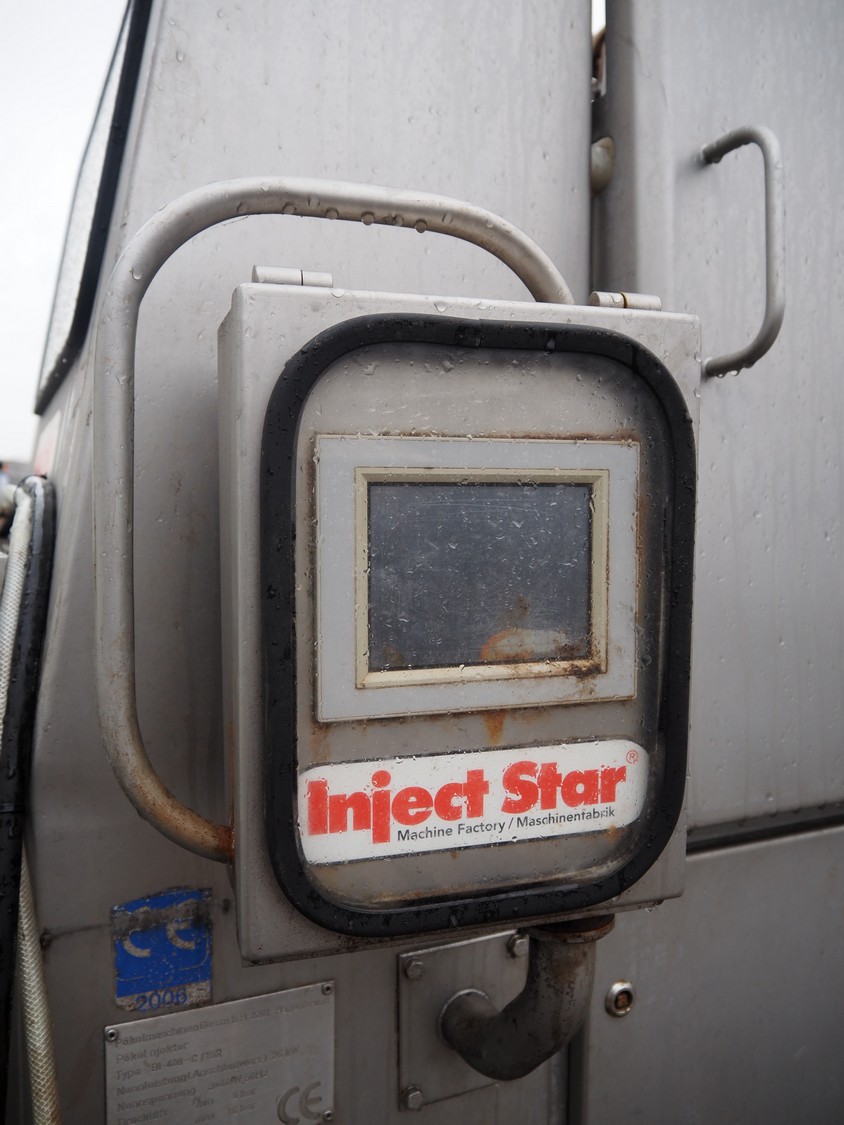 Inject star double injector, type: BI-408-C/152, serial number: BI408-169, year of construction: 2006, 400 V, 3 Ph, 50 Hz, 26 kW, belt width: 600 mm, (2x) 76 needles, total dimensions: 2900 mm x 1100 mm x 2300. Including mobile filter tub, dimensions: 2150 mm x 600 mm x 1050 mm.