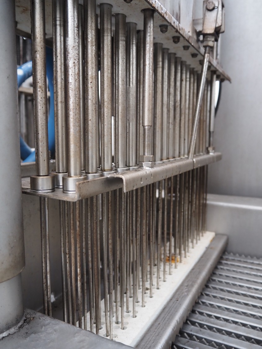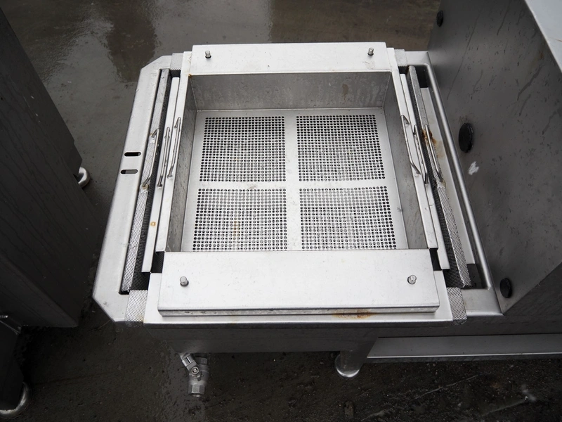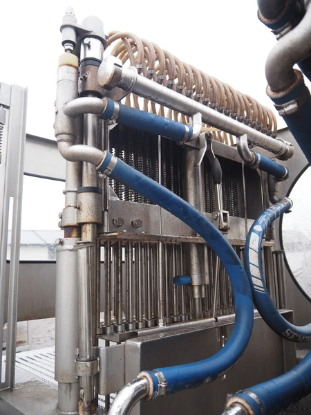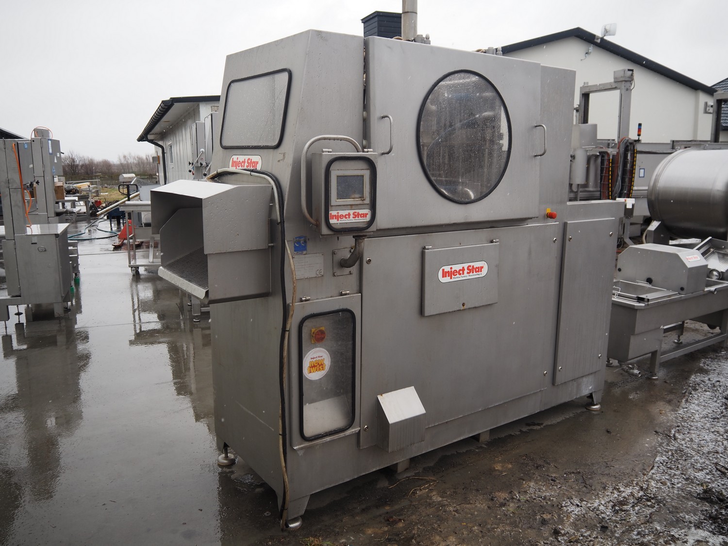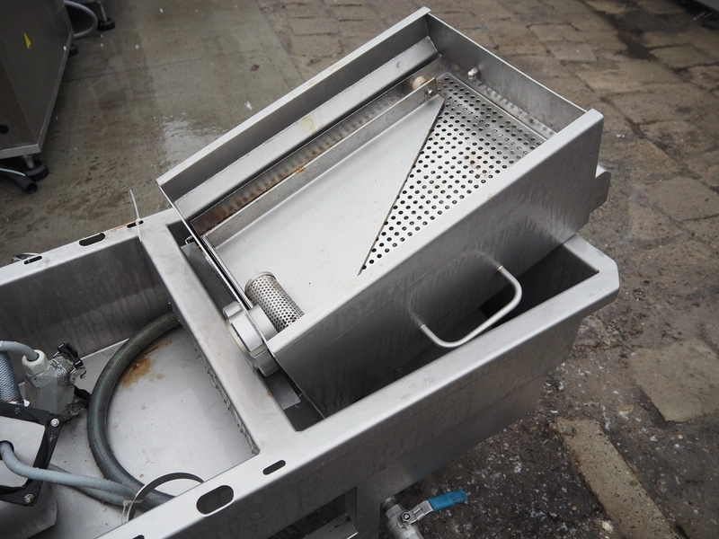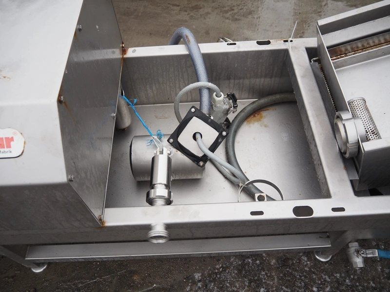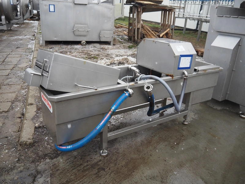 Inject star double injector, type: BI-408-C/152, serial number: BI408-169, year of construction: 2006, 400 V, 3 Ph, 50 Hz, 26 kW, belt width: 600 mm, (2x) 76 needles, total dimensions: 2900 mm x 1100 mm x 2300. Including mobile filter tub, dimensions: 2150 mm x 600 mm x 1050 mm.