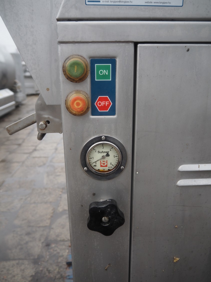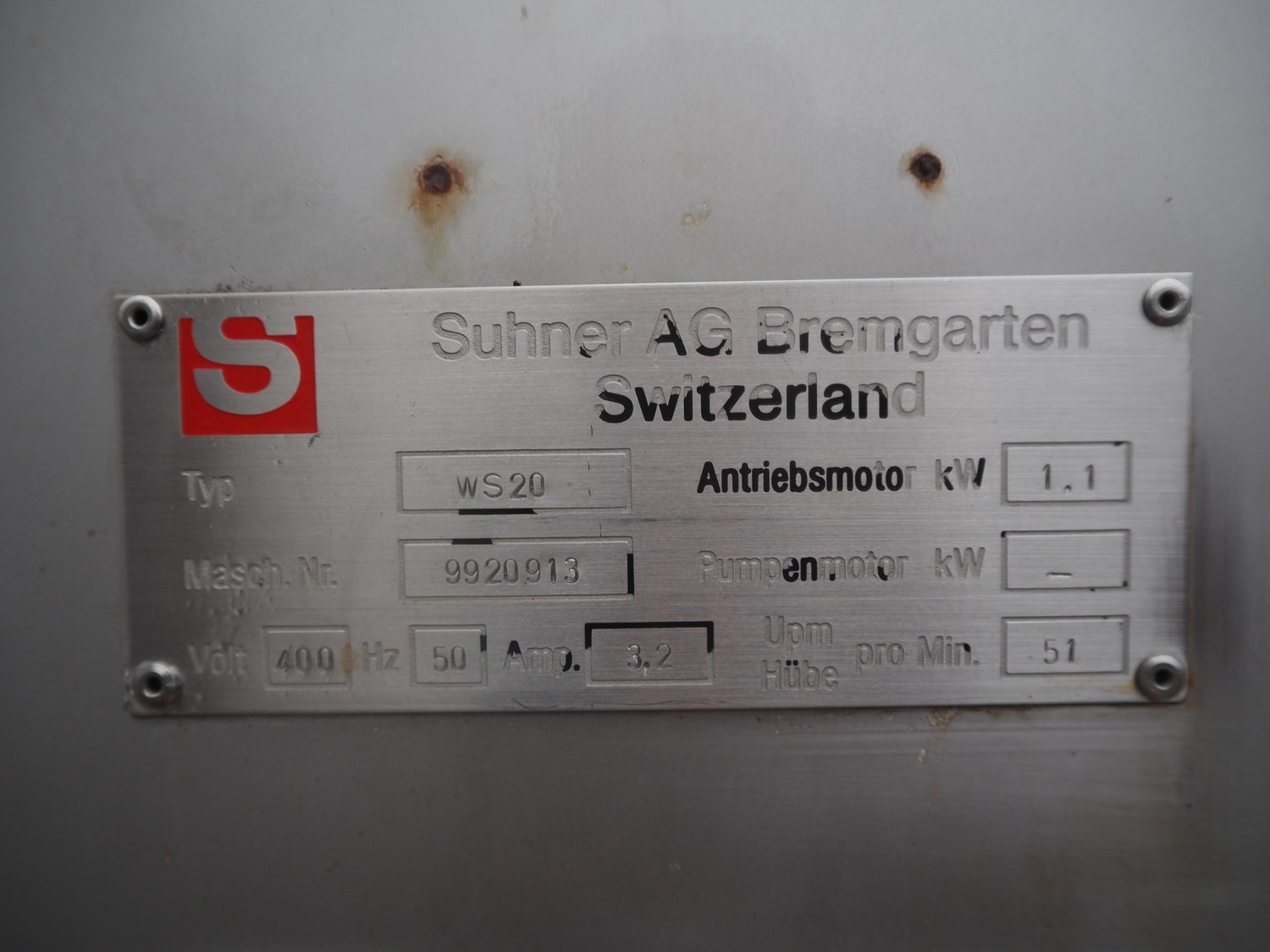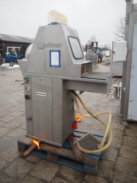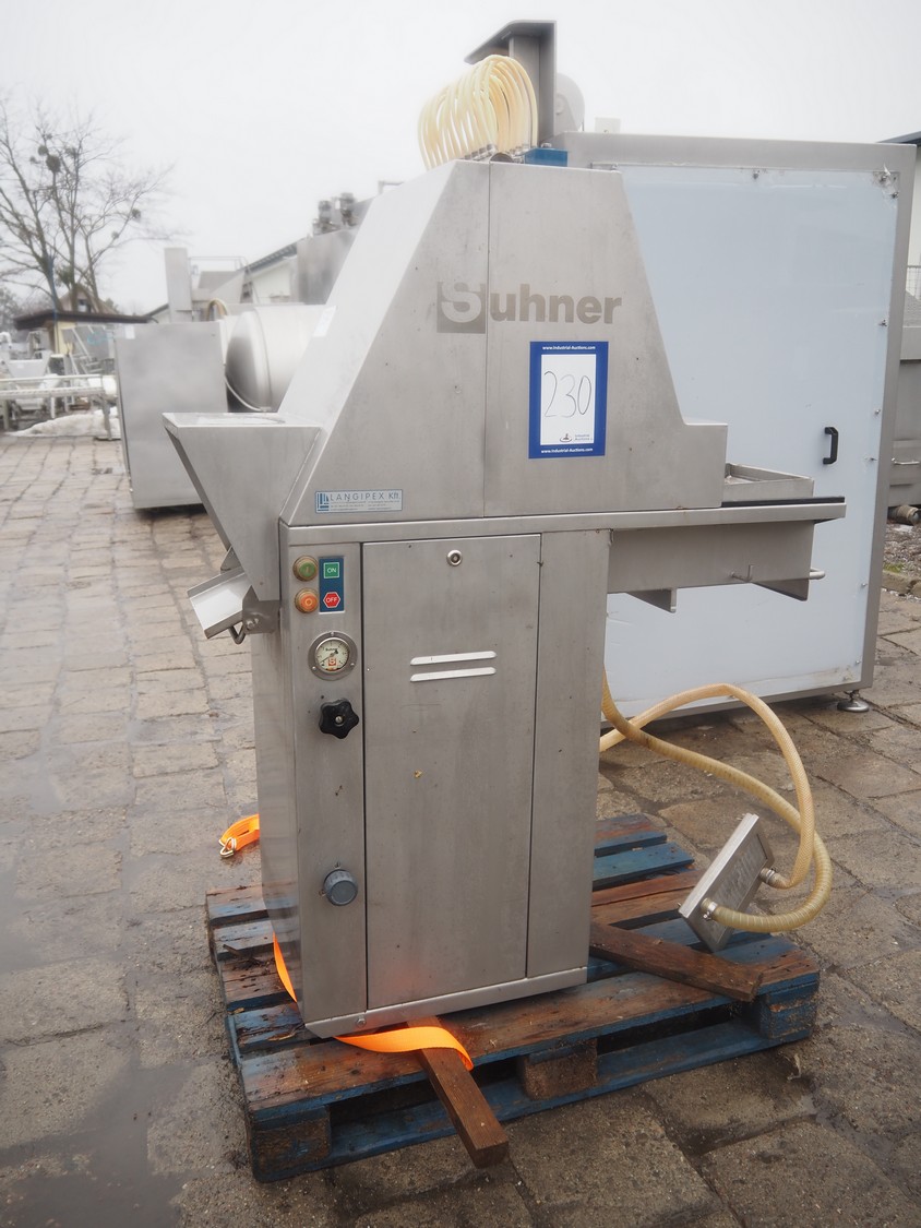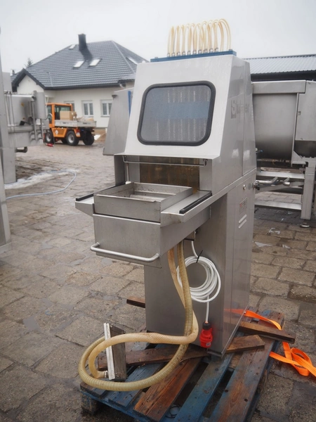 Suhner injector, type: WS20, serial number: 9920913, 400 V, 50 Hz, 3.2 A, 1.1 kW, s/s belt, belt width: 285 mm, 19 needles, total dimensions: 1230 mm x 540 mm x 1760 mm.