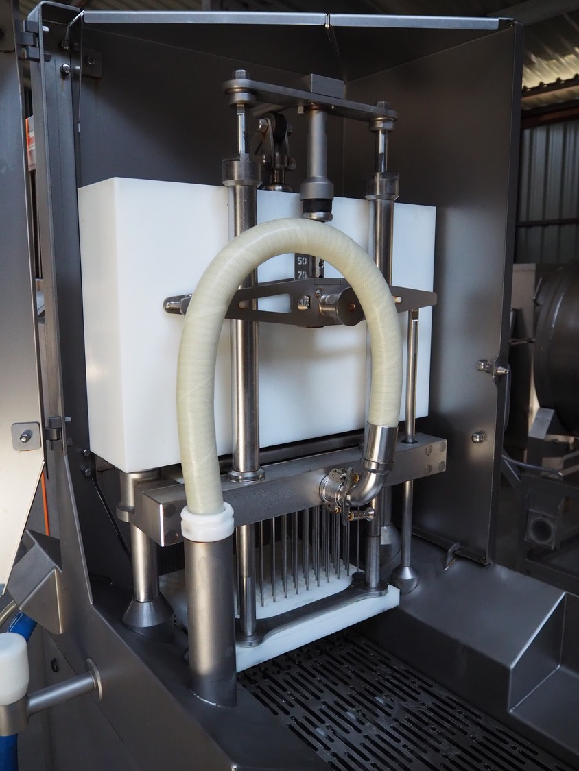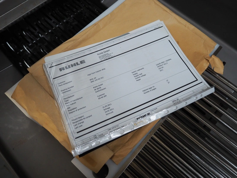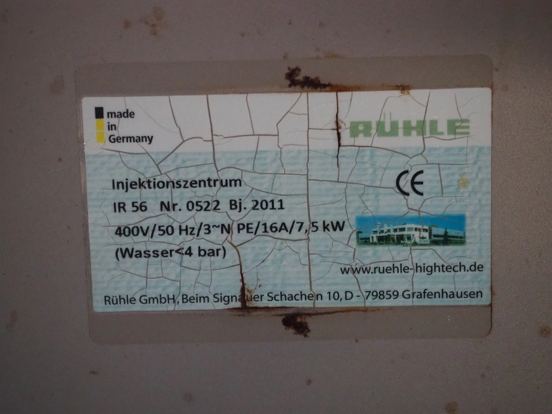 Rühle injector, model: IR 56, number: 0522, year of construction: 2011, 400 V, 3 Ph, 50 Hz, 16 A, 7.5 kW, s/s walking beam, beam width: 350 mm, total dimensions: 1500 mm x 950 mm x 2040 mm.