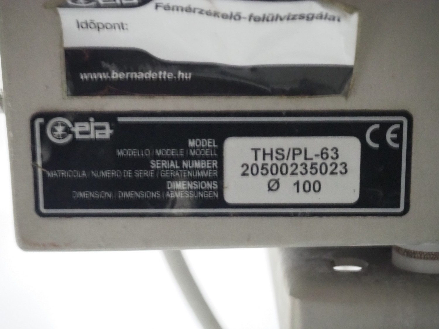 Ceia S.p.A. mobile pipe line metal detector, model: THS/PL-63, serial number: 20500235023, clearance: Ø 100, total dimensions: 600 mm x 400 mm x 1350 mm. Incomplete, technical condition unknown.